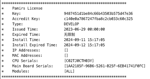 | Development Authorization | DEVELOP | 1. 1-day validity per installation, unable to access designer-related functions after timeout 2. Restricts CPU and motherboard serial numbers or the number of license users 3. Cannot be used for container startup 4. Contains page watermarks | Development environment (used by developers when starting business projects locally) |