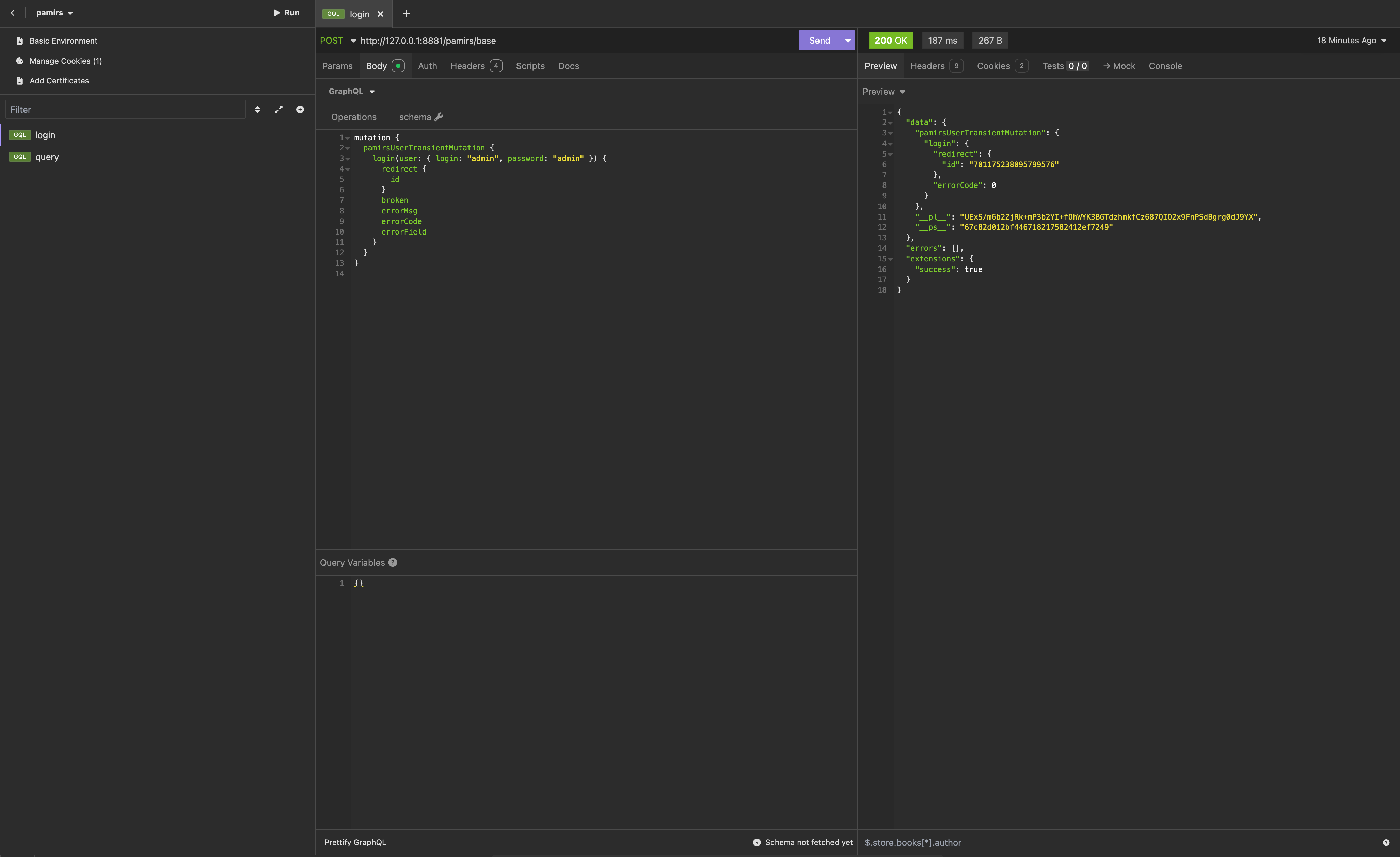 A GraphQL request body consists of two parts: query and variables. The content in the previous section is transmitted using the query parameter, and the other part (variable values) is transmitted via variables.