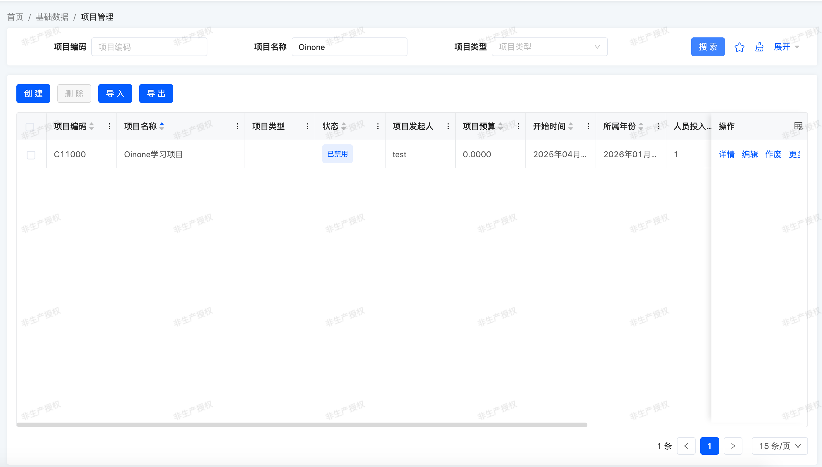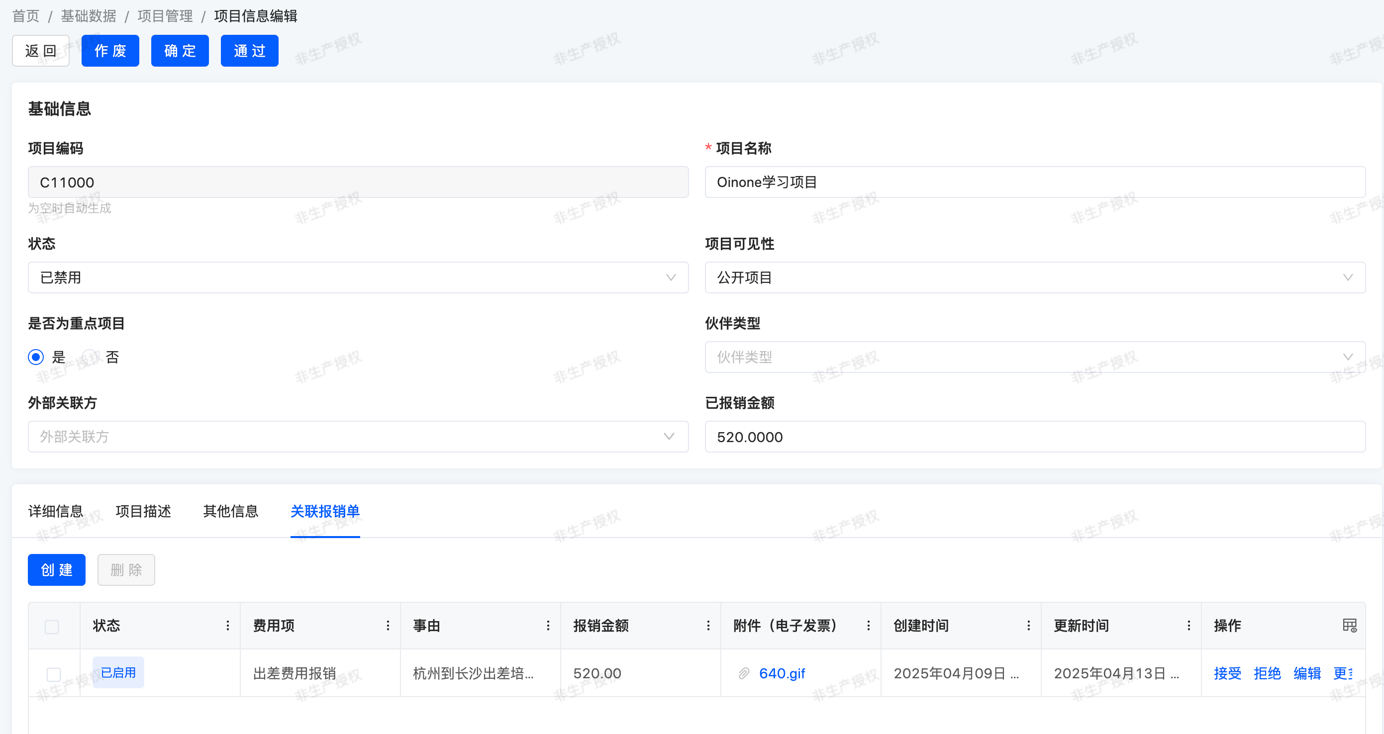 Here's an overview of the main list view for expense management - project information: