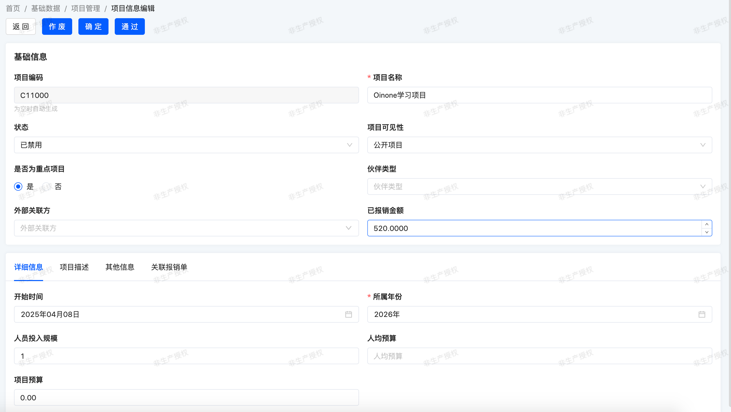 The top area of the form view summarizes key project information, such as project name, status, total reimbursed amount, project level, etc. The first tab contains budget-related information describing the project: staff size, budget per capita, project budget, start time, etc.