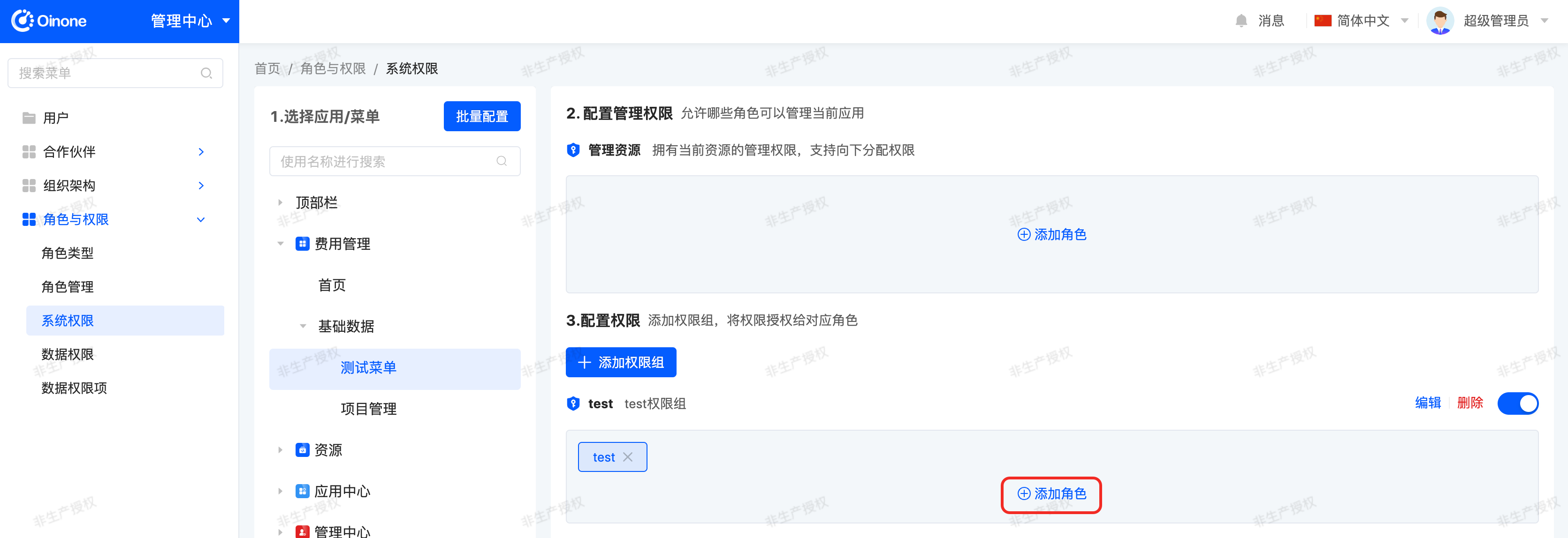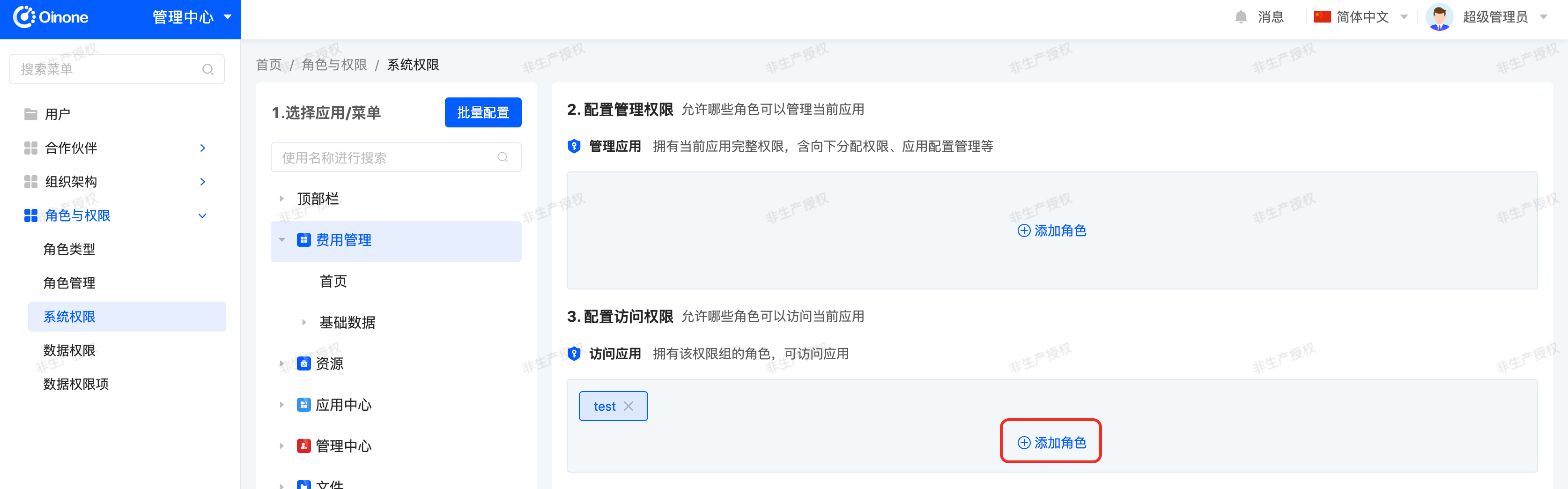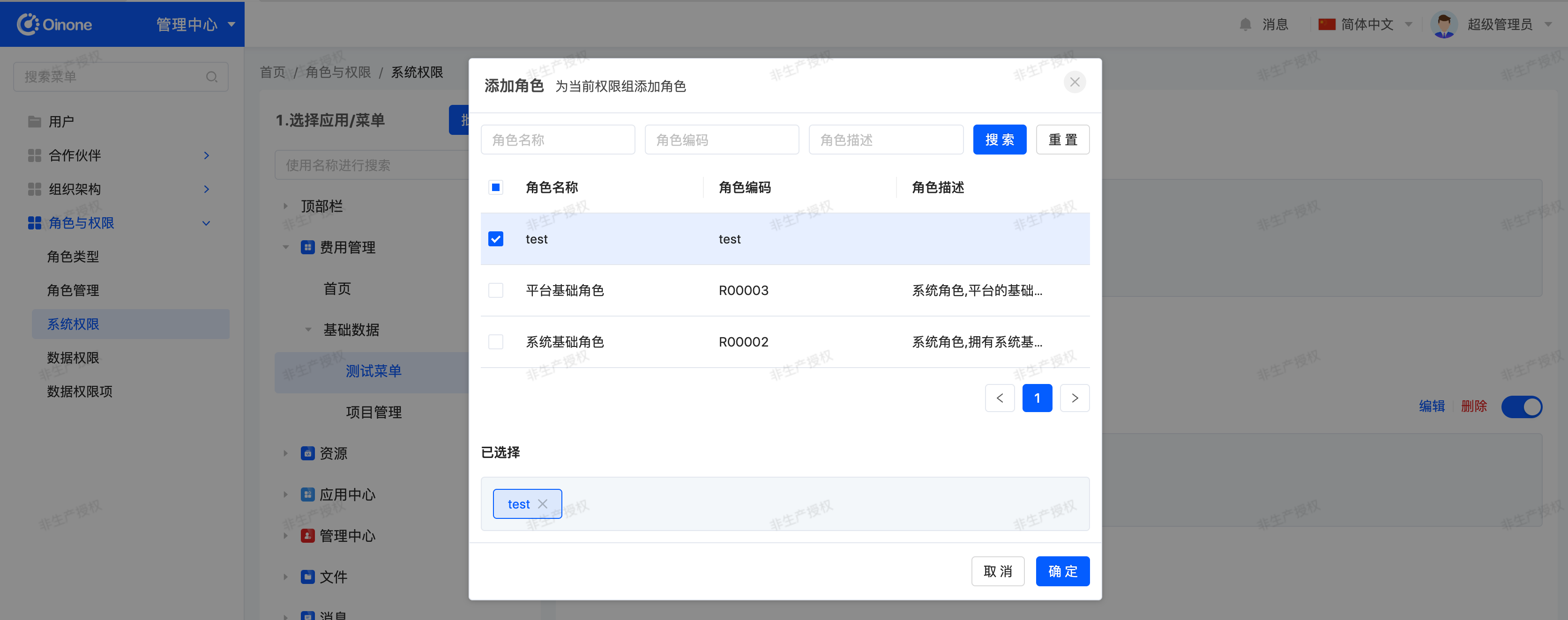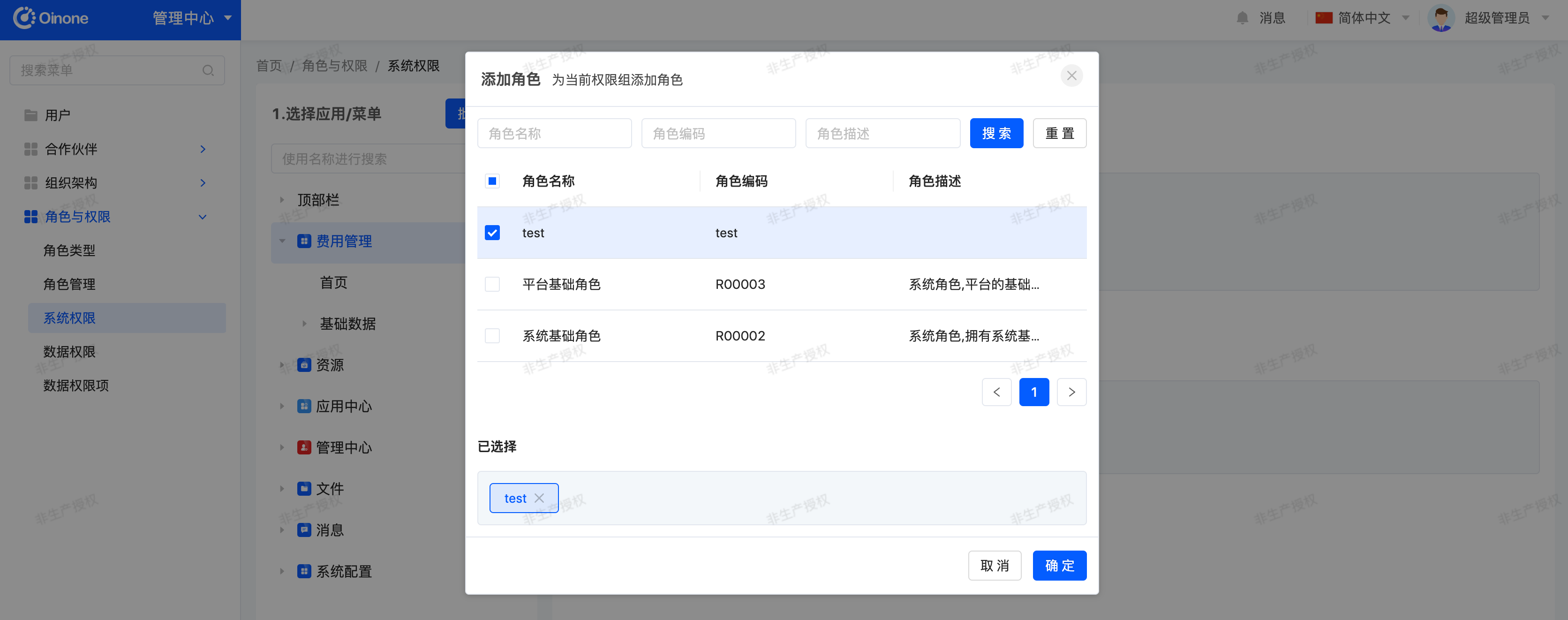 In the system permissions page, select Expense Management, click the "Add Role" button, select the "test" role in the pop-up, and confirm to save.