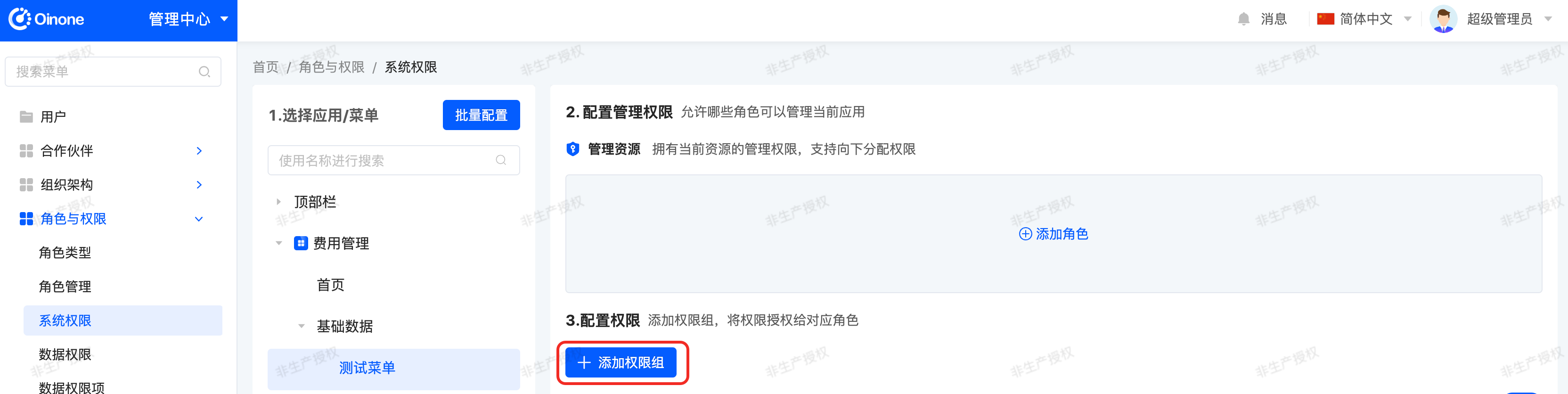 1. In the system permissions page, select [Expense Management - Basic Data - Test Menu], click the "Add Permission Group" button, configure the permission group permissions in the pop-up, and confirm to save.