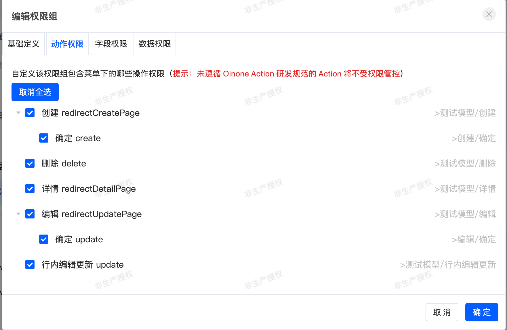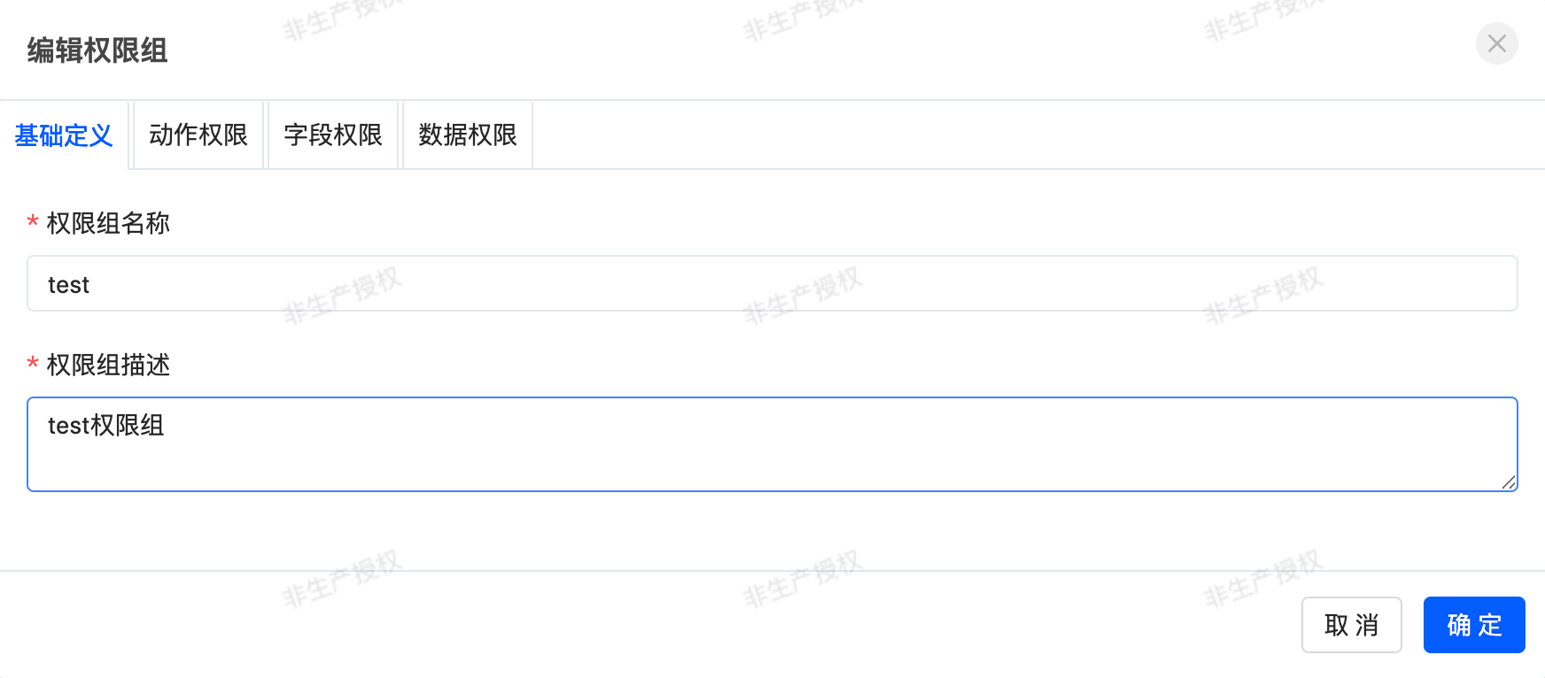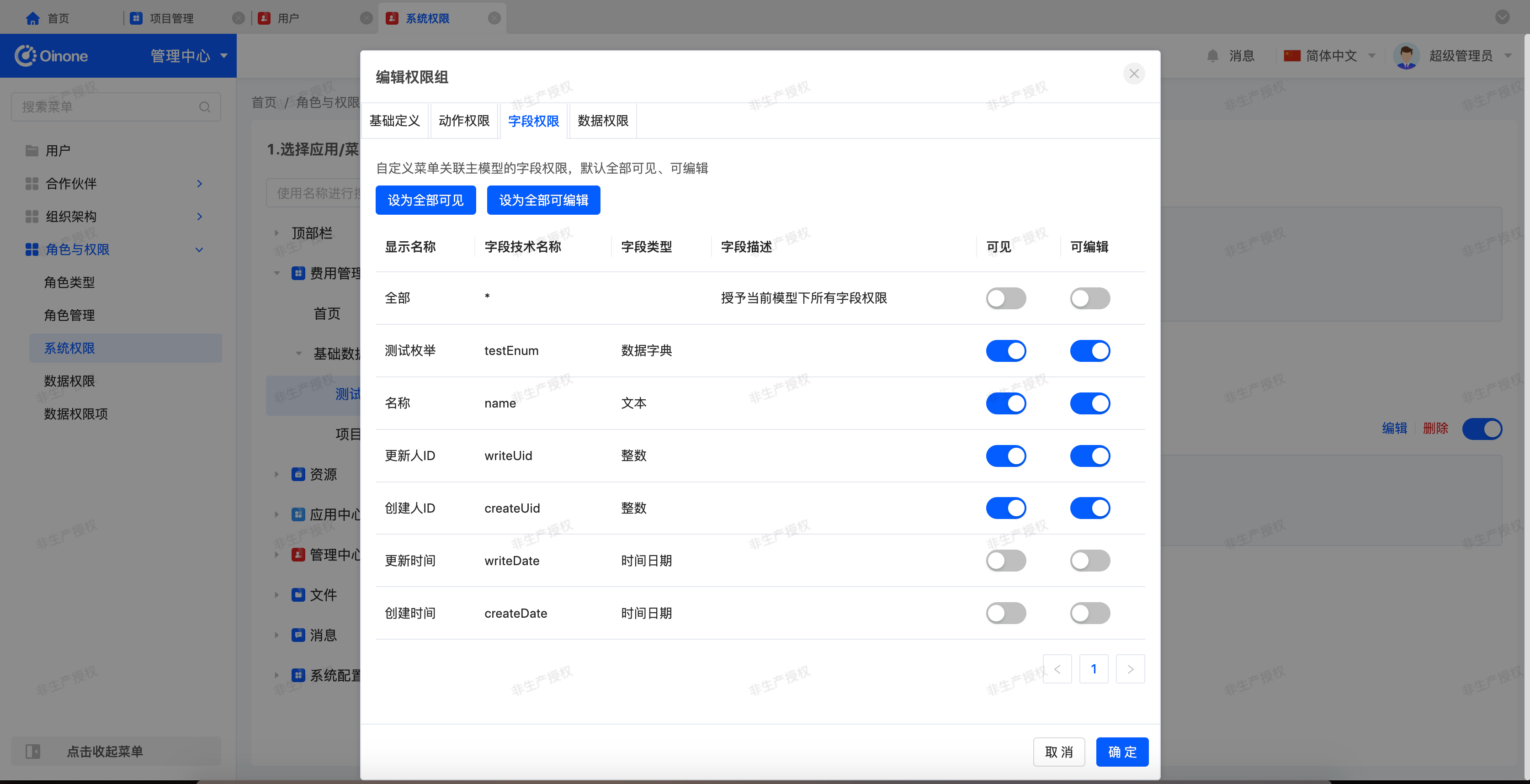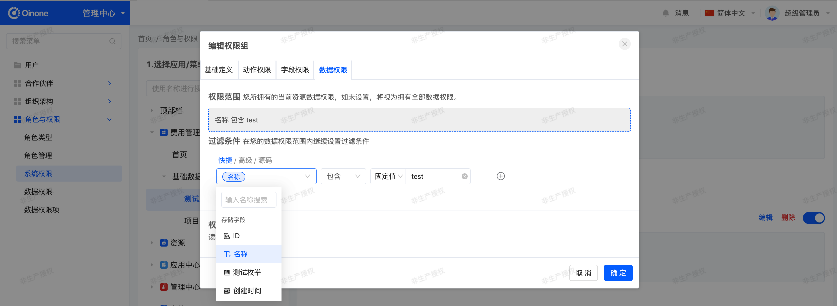 1. In the system permissions page, select [Expense Management - Basic Data - Test Menu], click the "Edit" button corresponding to the "test permission group", configure the field permissions and data permissions in the pop-up, and confirm to save.