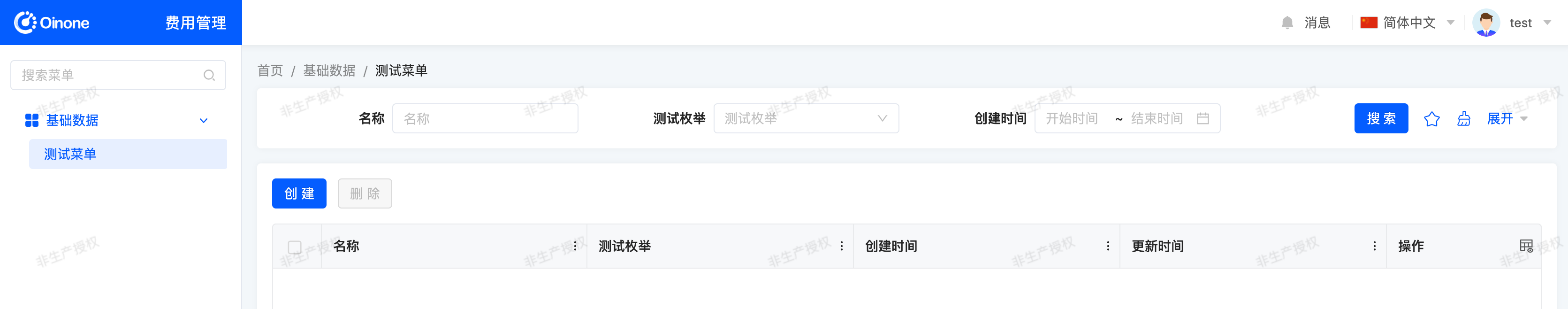 1. When the test user logs in, they can only access "Expense Management" and its "Test Menu".
