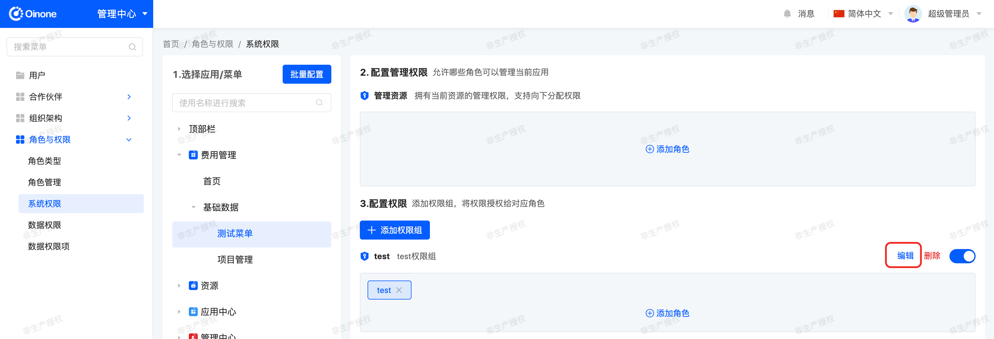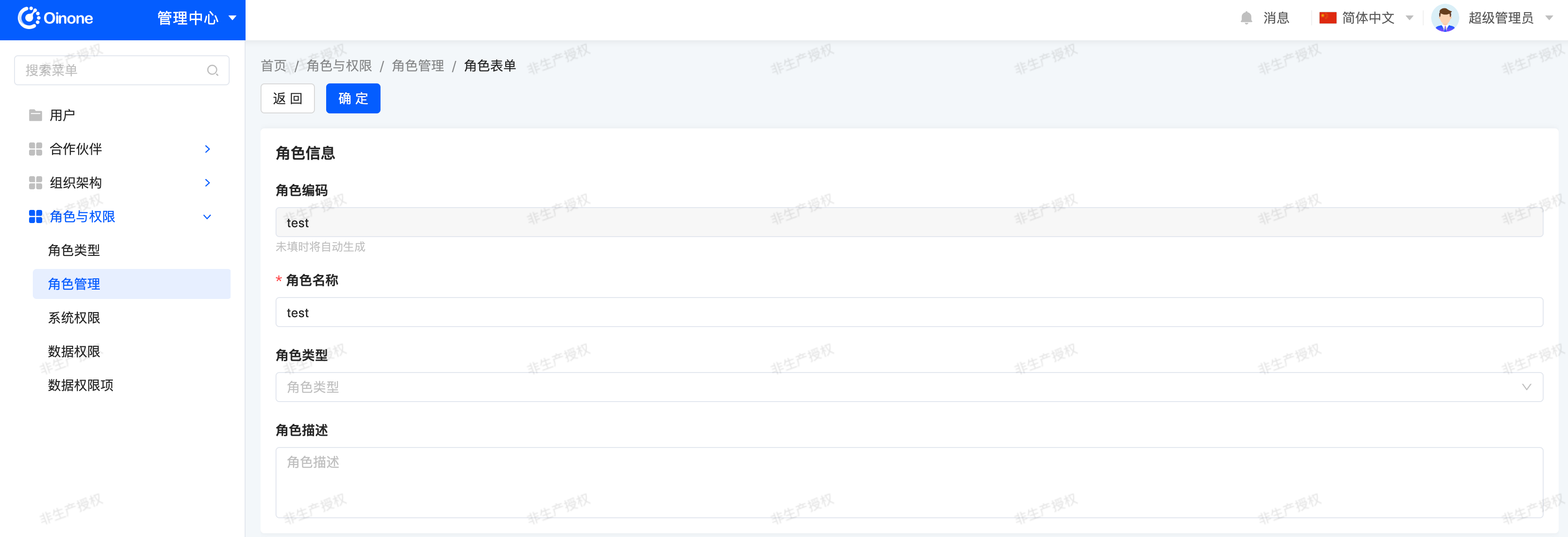 Roles can be managed and maintained in [Management Center - Roles and Permissions - Role Management]. Add a new "test" role for testing.