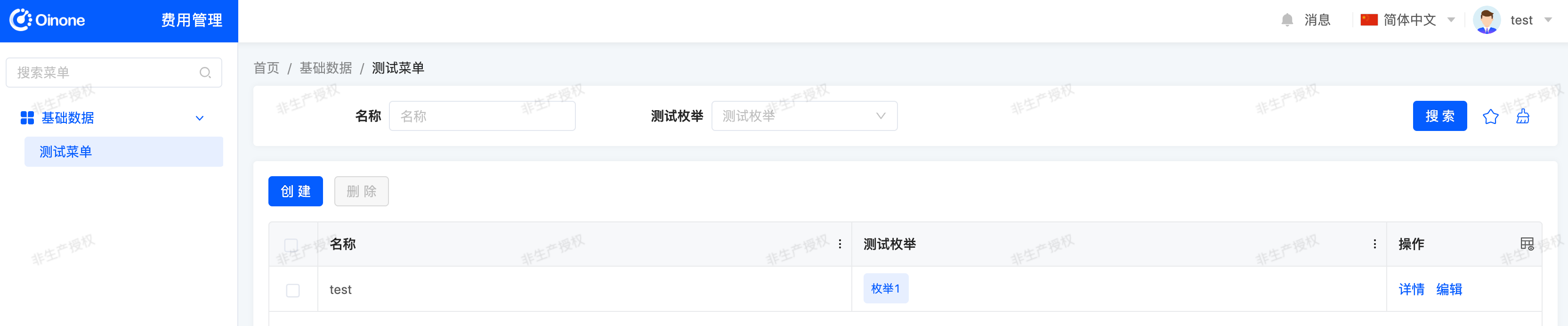 Objectives: By the end of this section, the test user can log in and access [Expense Management - Basic Data - Project Management], but can only access data whose name contains the character "test".