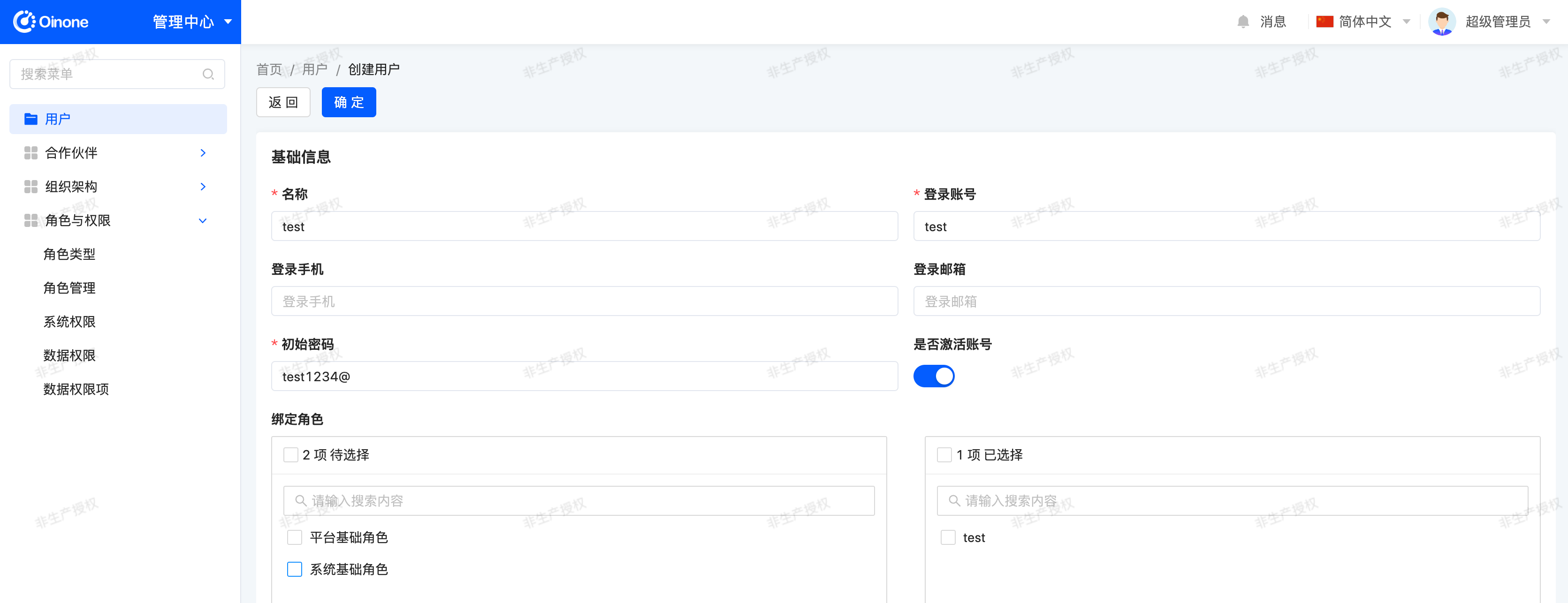 Users can be managed and maintained in [Management Center - Users]. Add a new user "test" and bind the "test" role for testing.