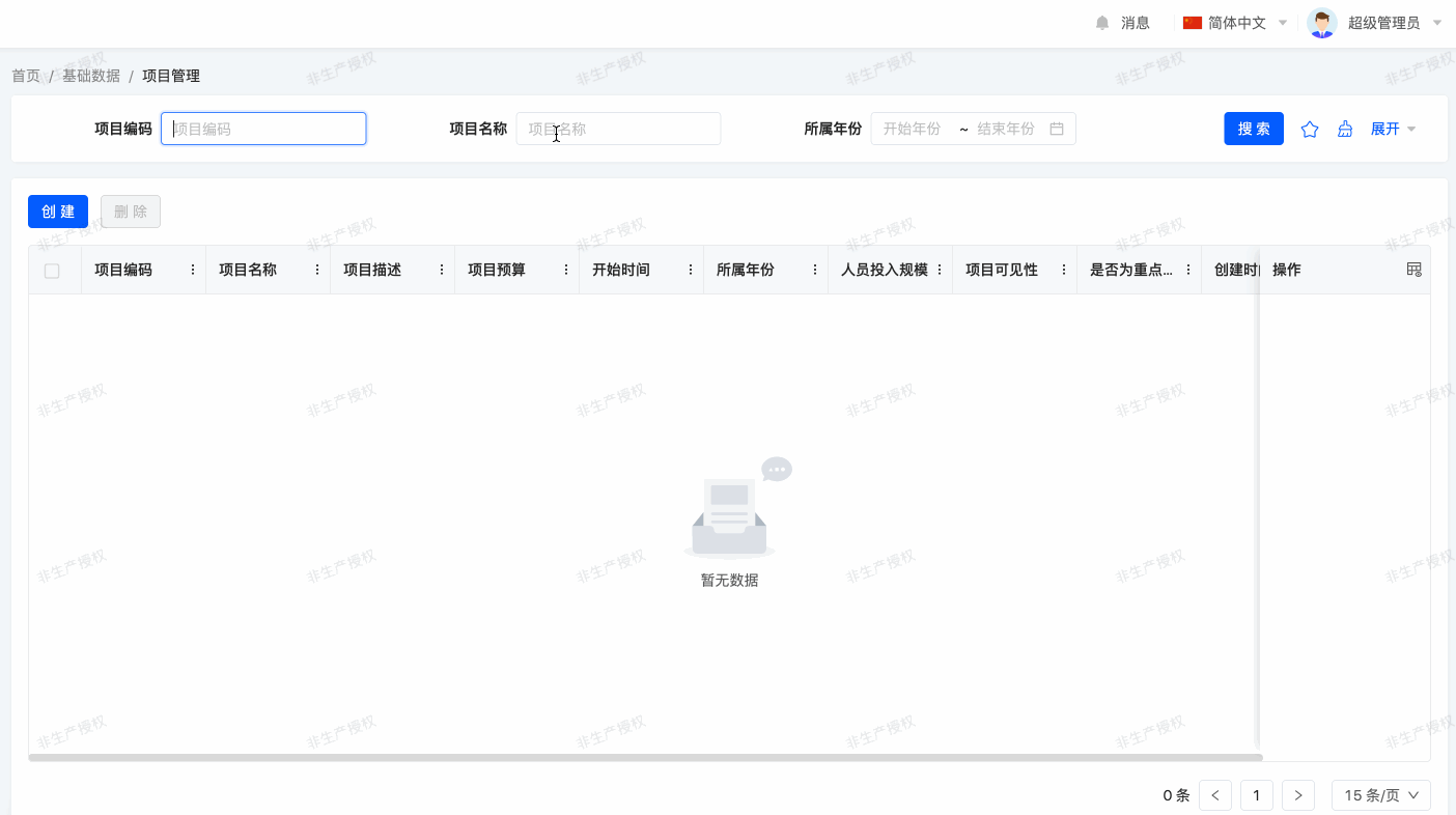 The project code field should be read-only, and the personnel input scale should have a default value. Additionally, in the table view, search conditions should only include project code, project name, year, and whether it is a key project.