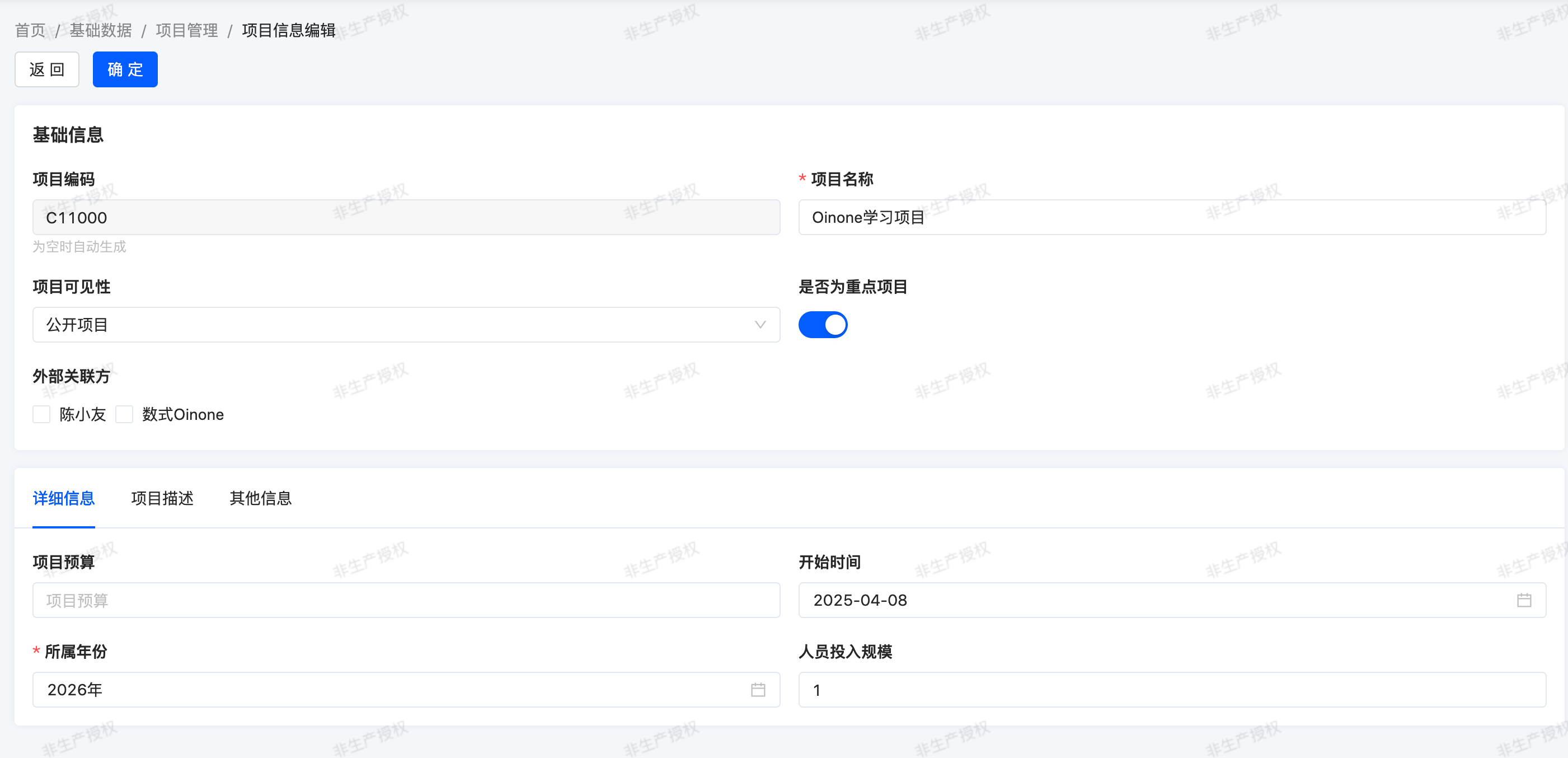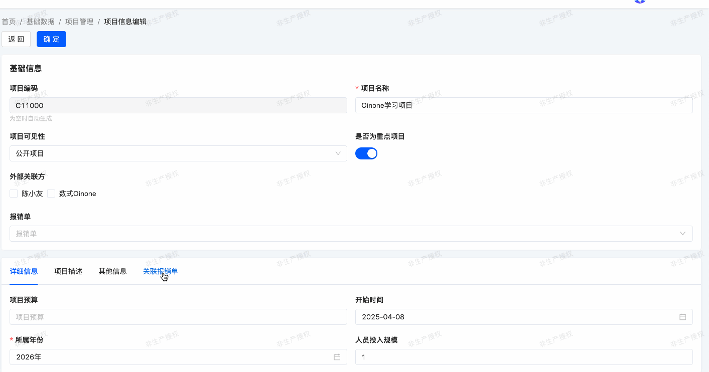 In the expense management module, we still lack three pieces of information about a project: project type, project sponsor, and external partners. External partners can be anyone, but on the other hand, the project sponsor is an employee of the company (i.e., an Oinone user).