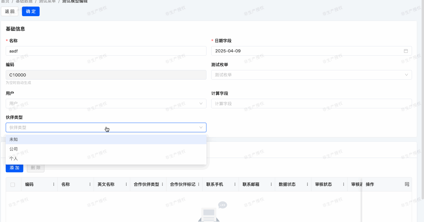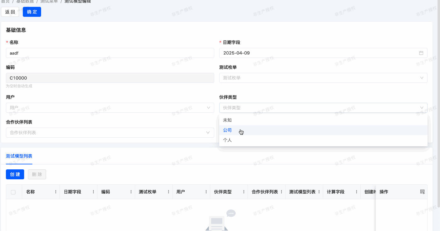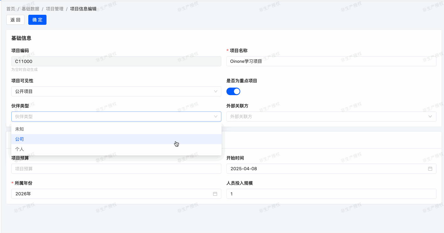 In our expense management module, we've defined project external partners. If a new partner type is added, the selectable range for project external partners should change accordingly after selecting this partner type. To achieve this, we use the domain attribute concept. In simple terms, data displayed in a relation field is filtered based on the domain attribute value.