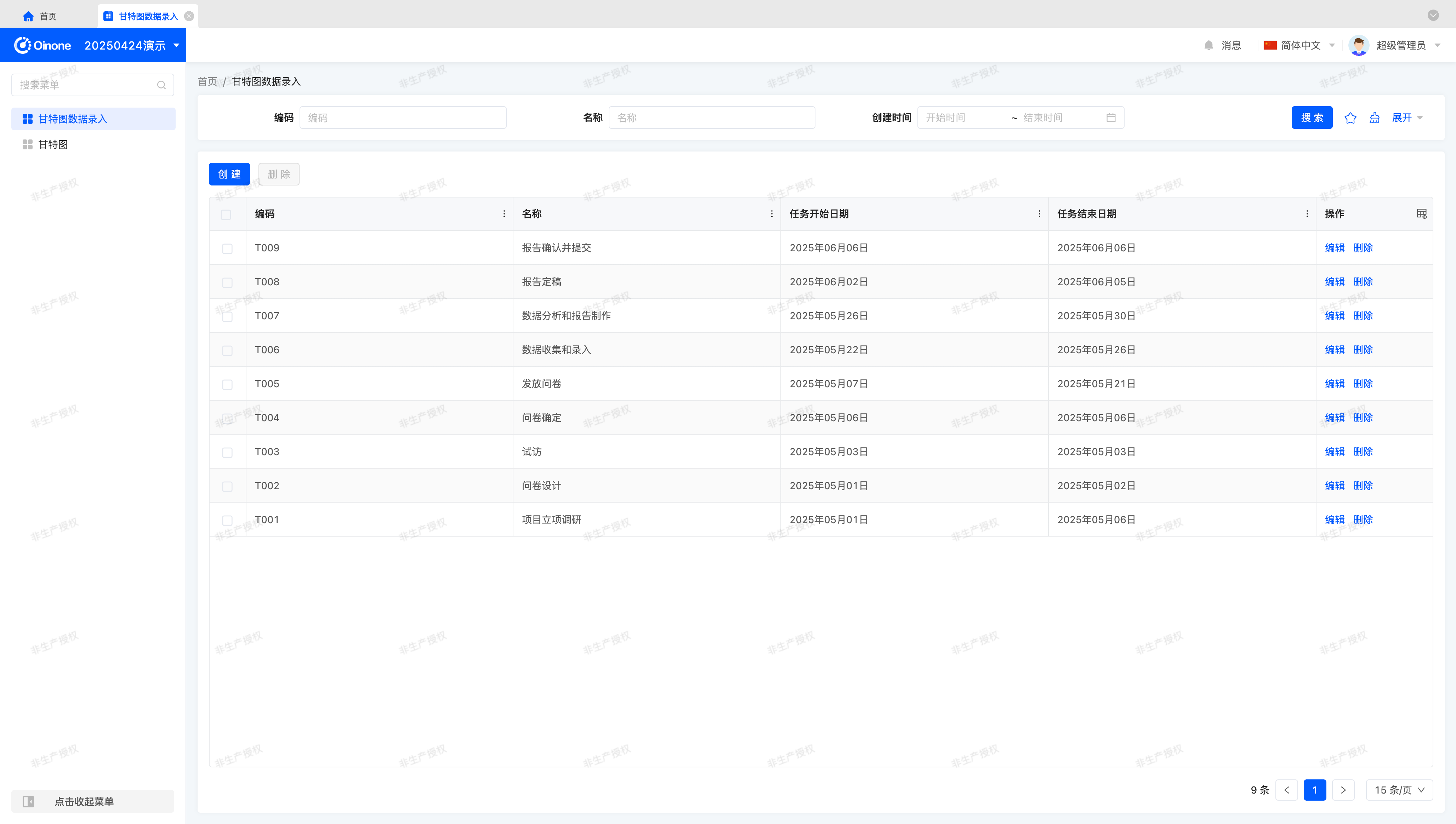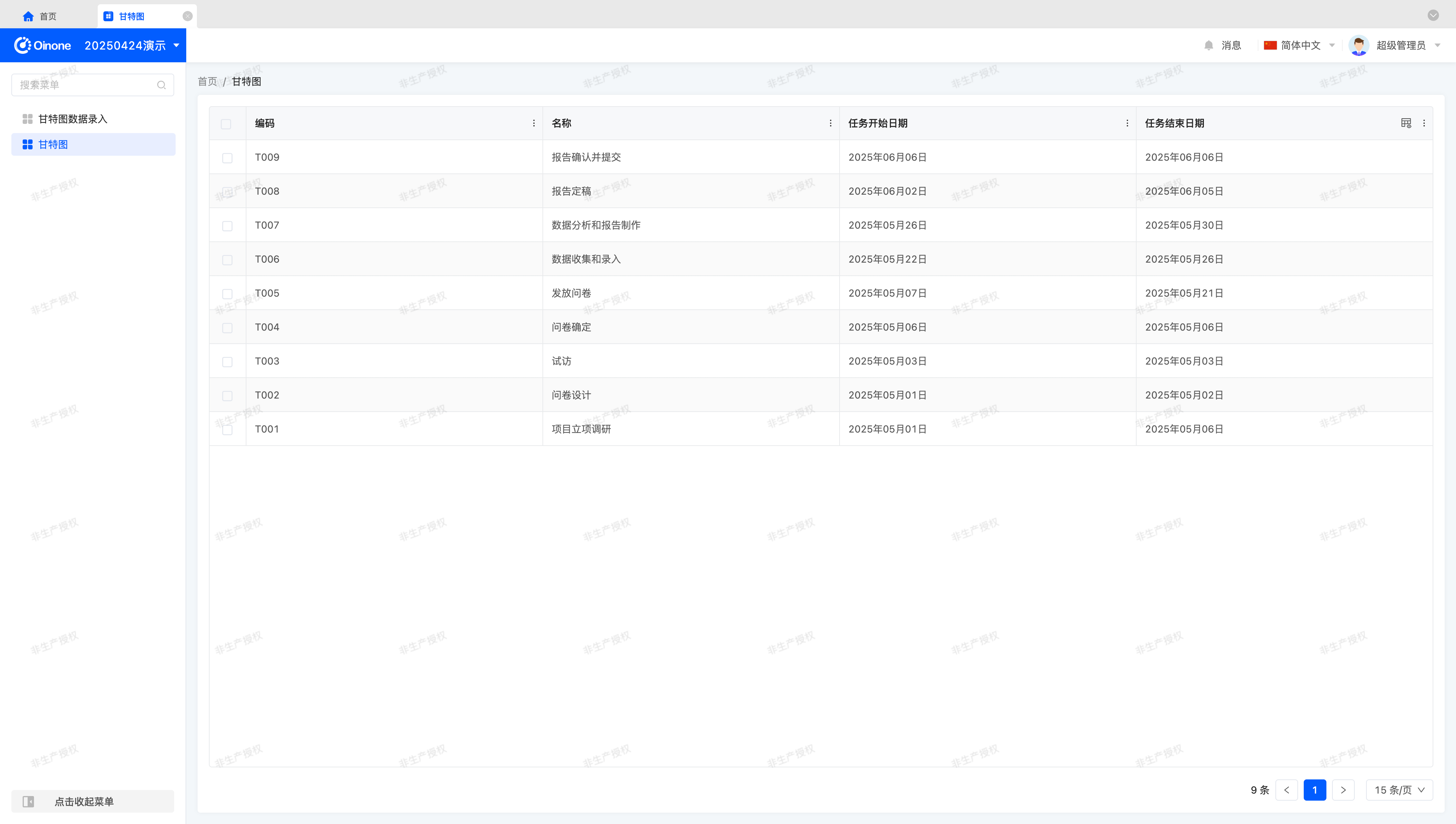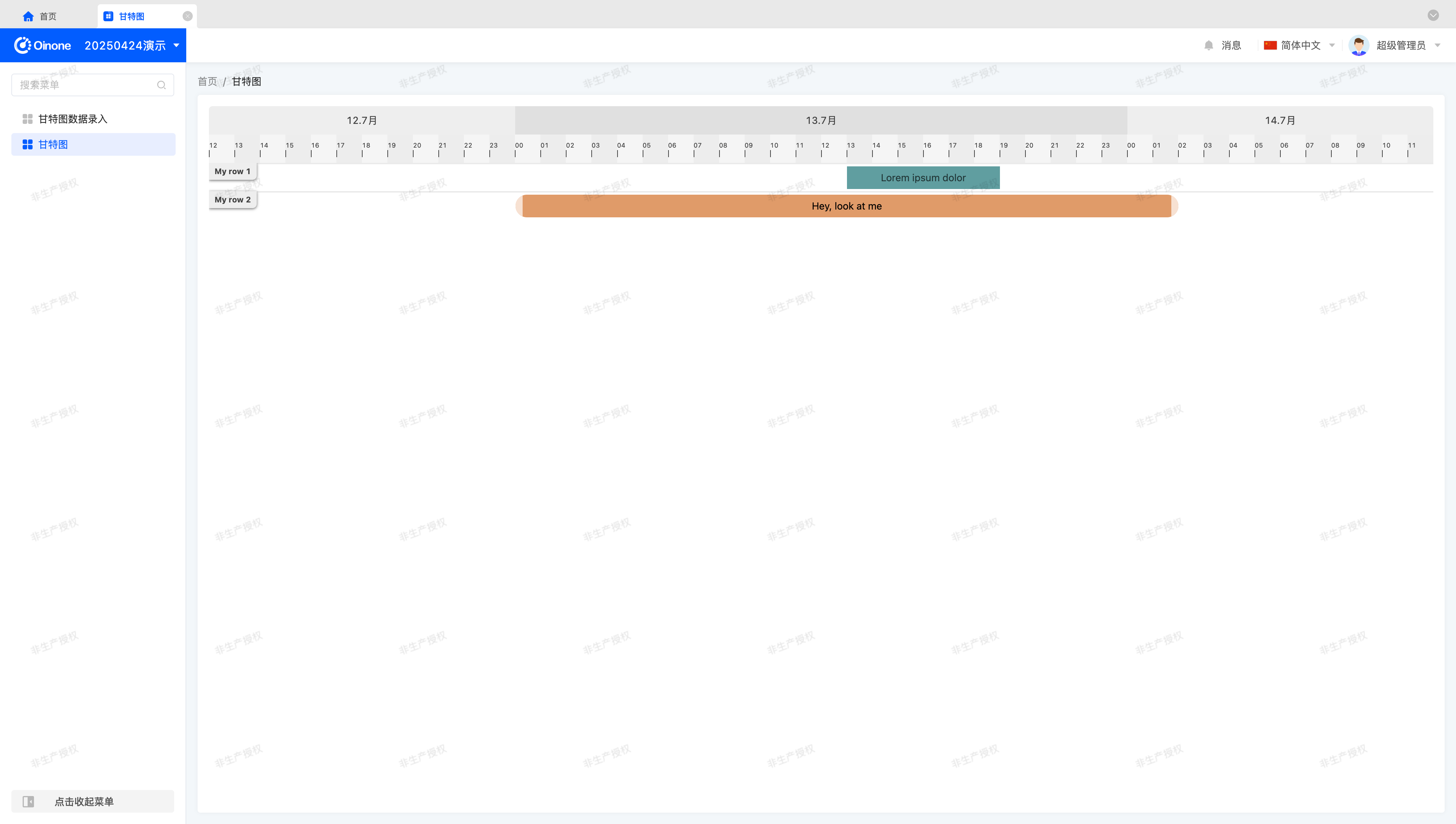As practiced in the "Explore the Front-End Framework" chapter, we can switch components by registering a layout (Layout). Change widget="table" to widget="Gantt" to complete the switch: