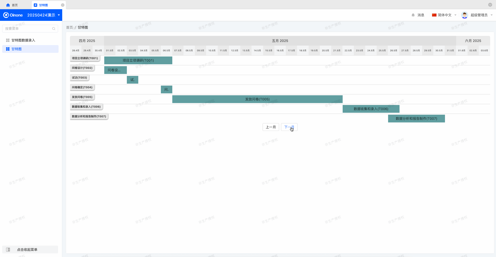 Here, we change the time to the first day of the current month, subtract three days for the Gantt start date, and add one month and six days for the end date—displaying the Gantt chart with three days before and after the current month as the benchmark.