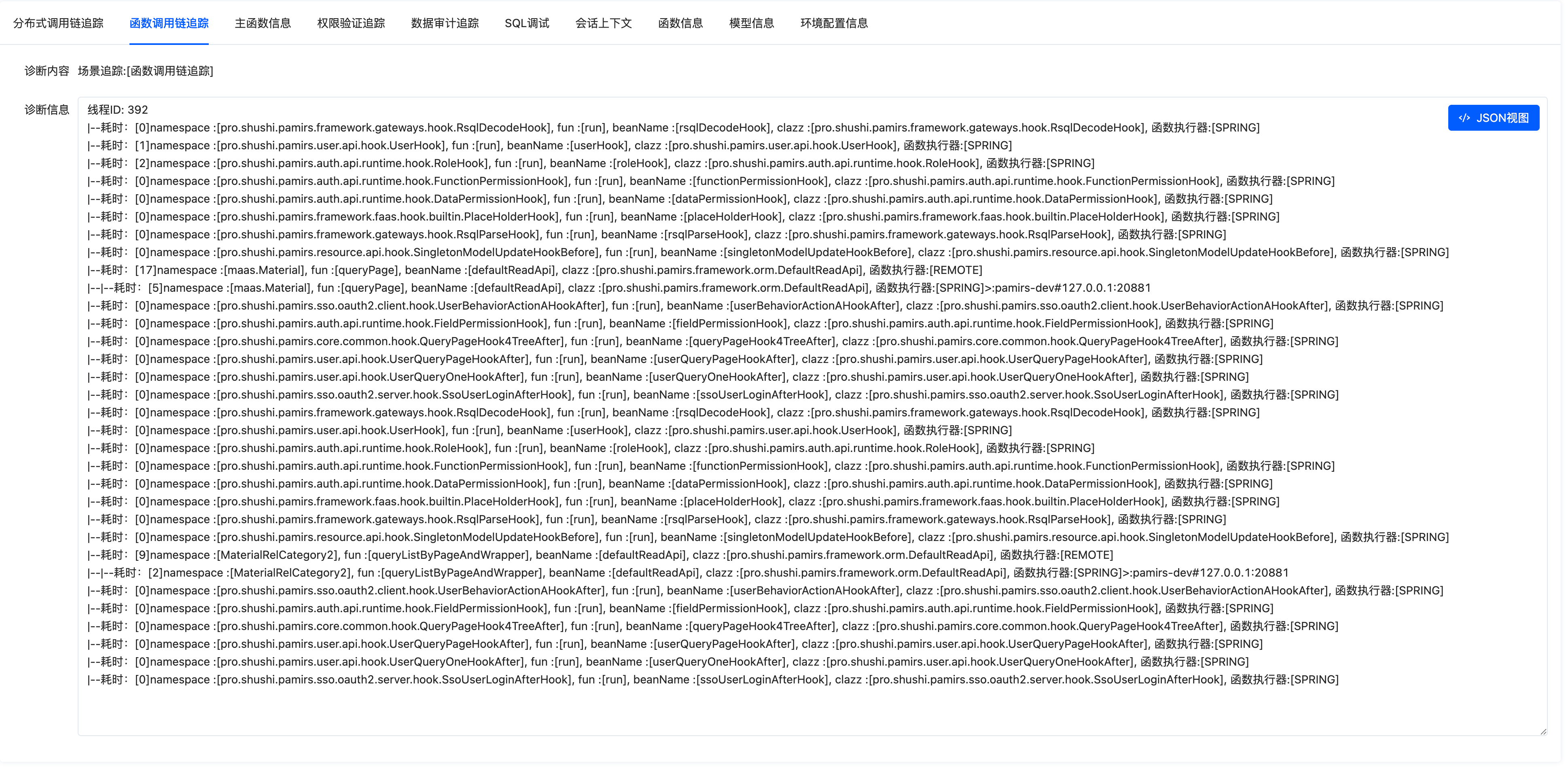 • >:pamirs-dev#127.0.0.1:20881: Indicates that the current function is executed on the service with the application name (spring.application.name), and the corresponding dubbo registration IP and port are 127.0.0.1:20881.