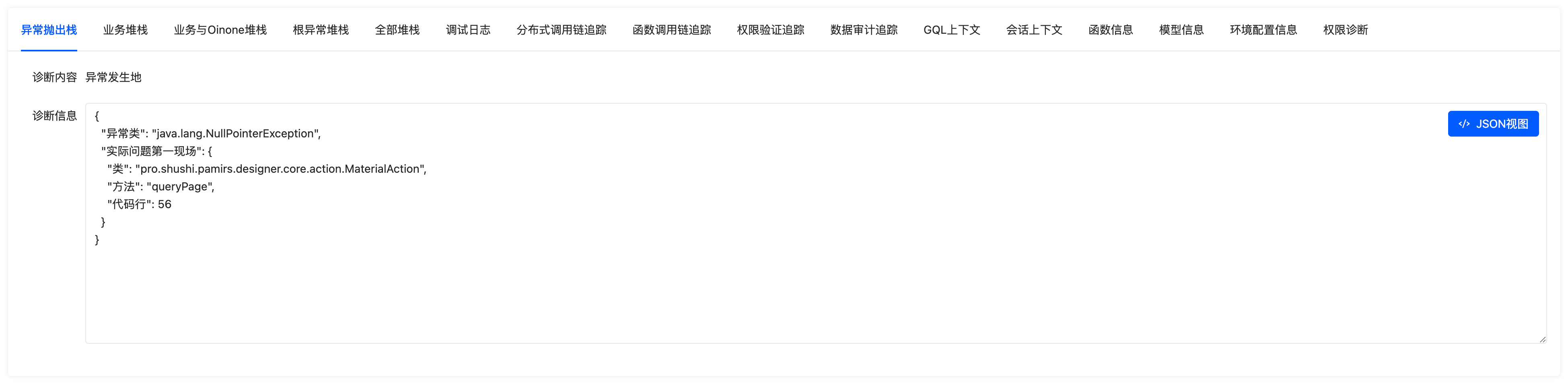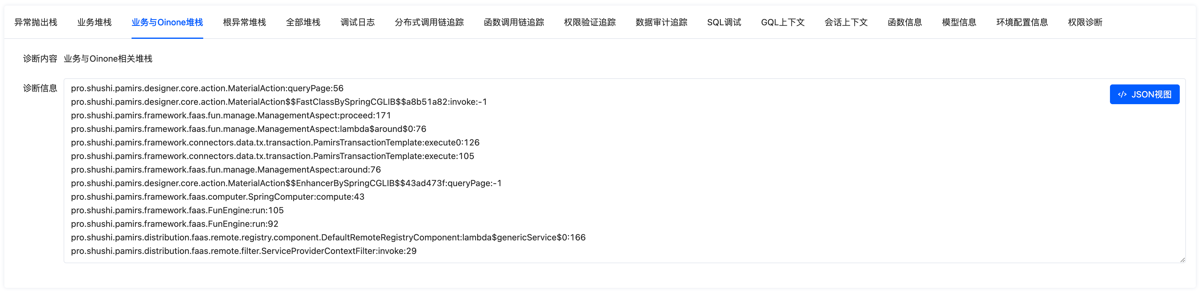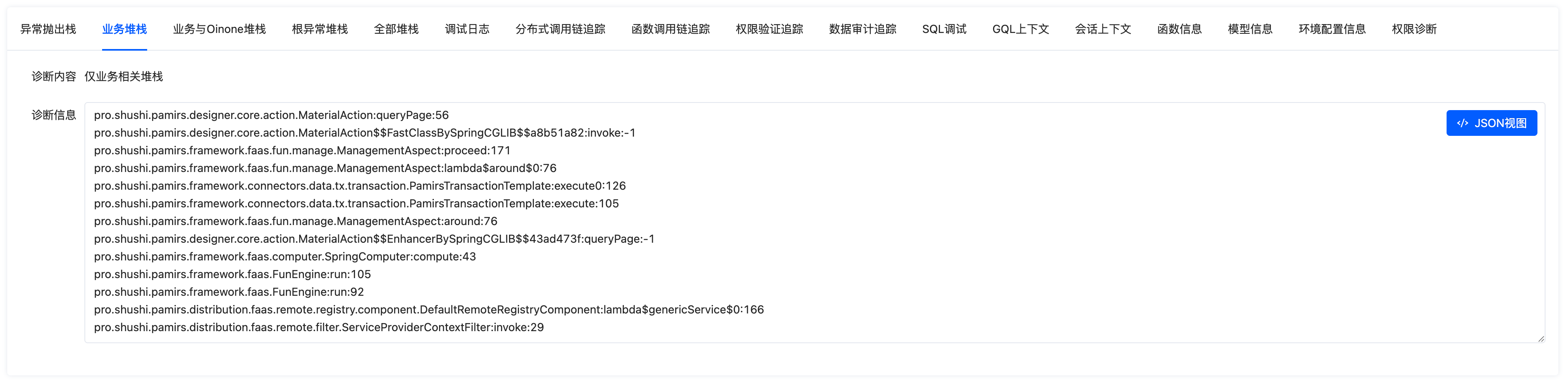 If the "first scene of the problem" cannot accurately locate the issue, you can view stack information unrelated to the Spring framework or Oinone framework through the "business stack":