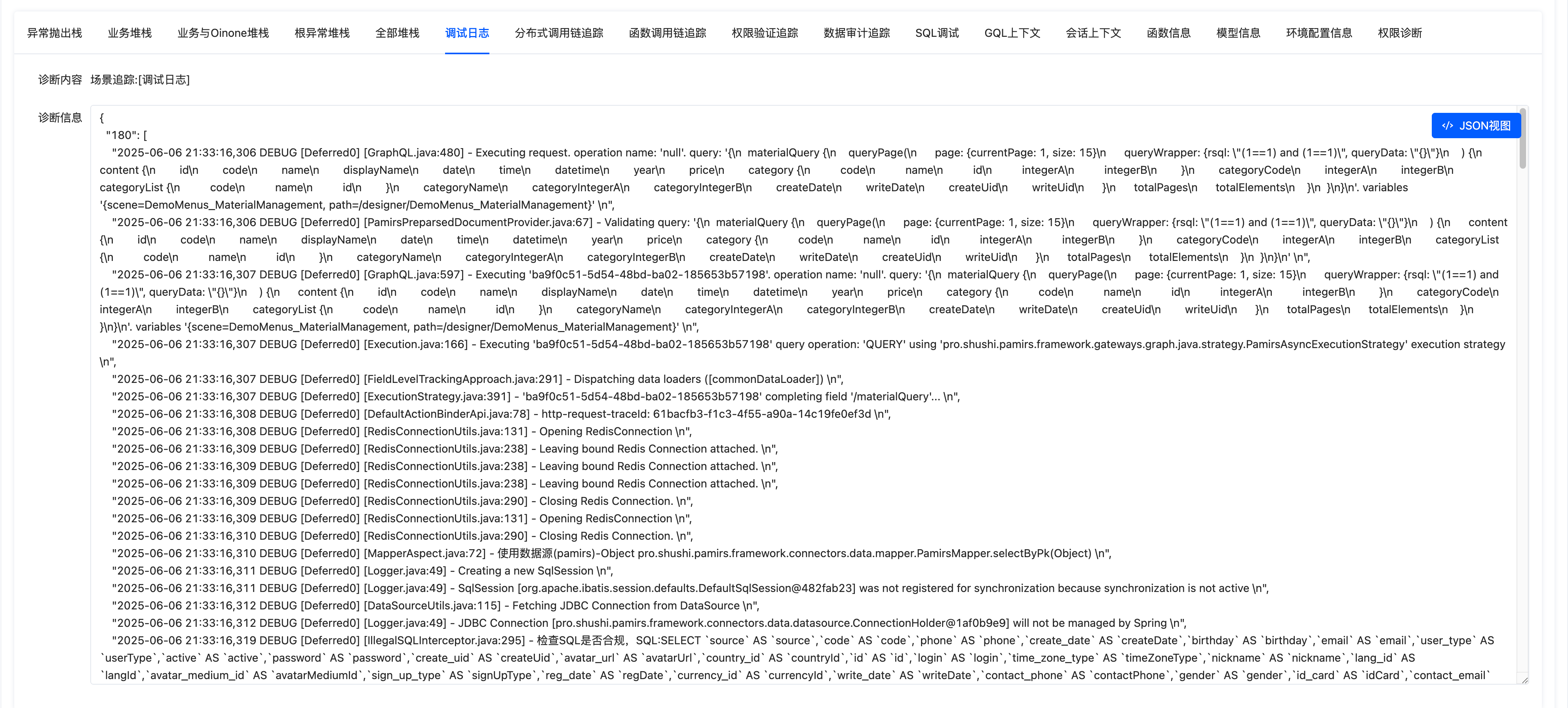 Sometimes, business-related data is printed for debugging via Logback near exception stacks, but these logs are often disabled in production environments. In debug tools, you can view more fine-grained log information in "debug logs" by adjusting the "log level." When we change the "log level" to 3 and resend the request, we can see debug logs such as Redis connections and data source routing, as shown in the following figure: