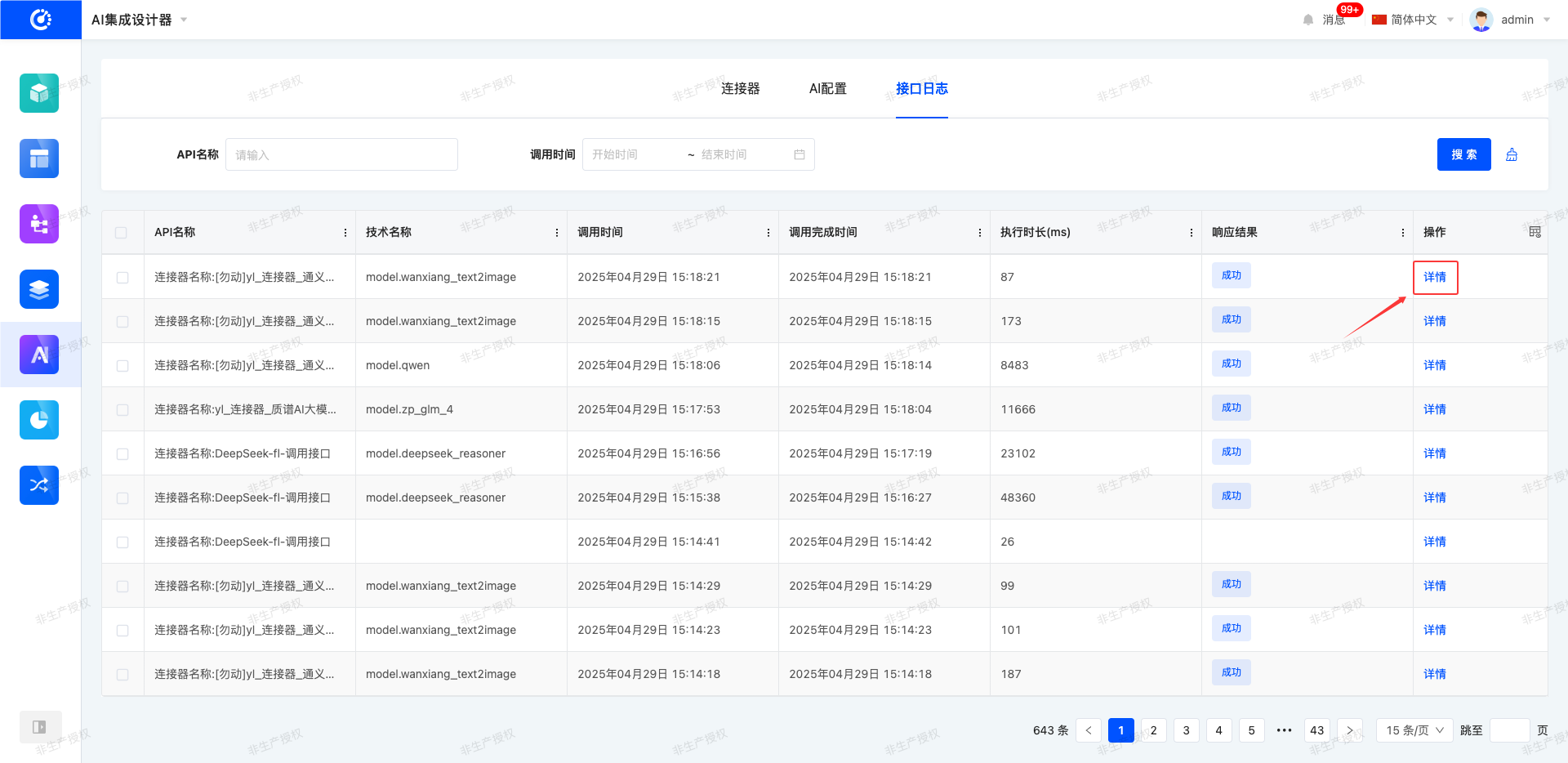 The interface log system is used to comprehensively record the call information of connectors. Users can view the interface call status to determine whether the call is successful. Through in-depth analysis of data such as interface execution results, response times, and parameter information, the call logic can be optimized to ensure the stability and efficiency of AI service operations.