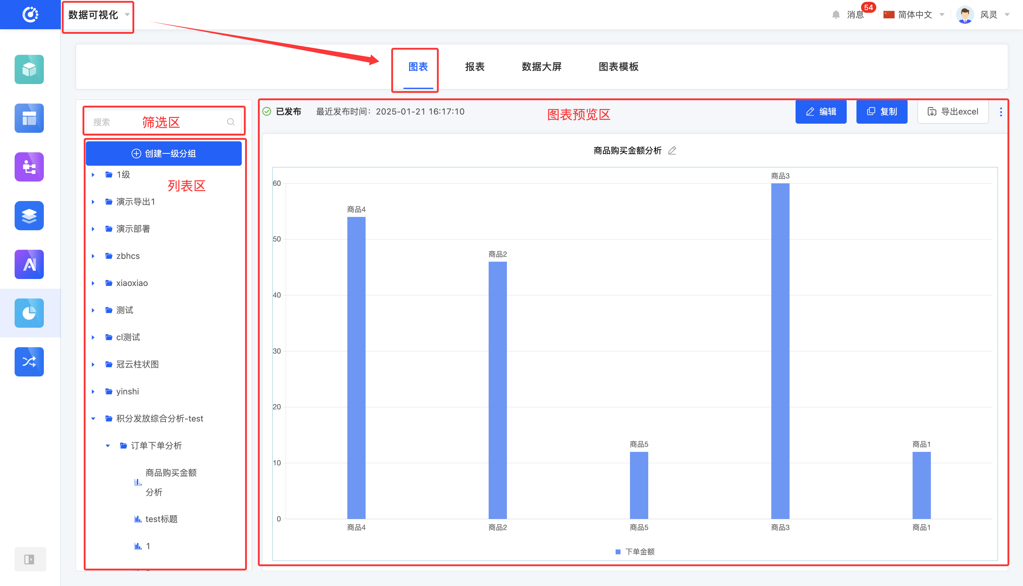 You can manage charts on the "Charts" page after entering data visualization. This page mainly consists of three parts: the filtering area, the list area, and the chart preview area: