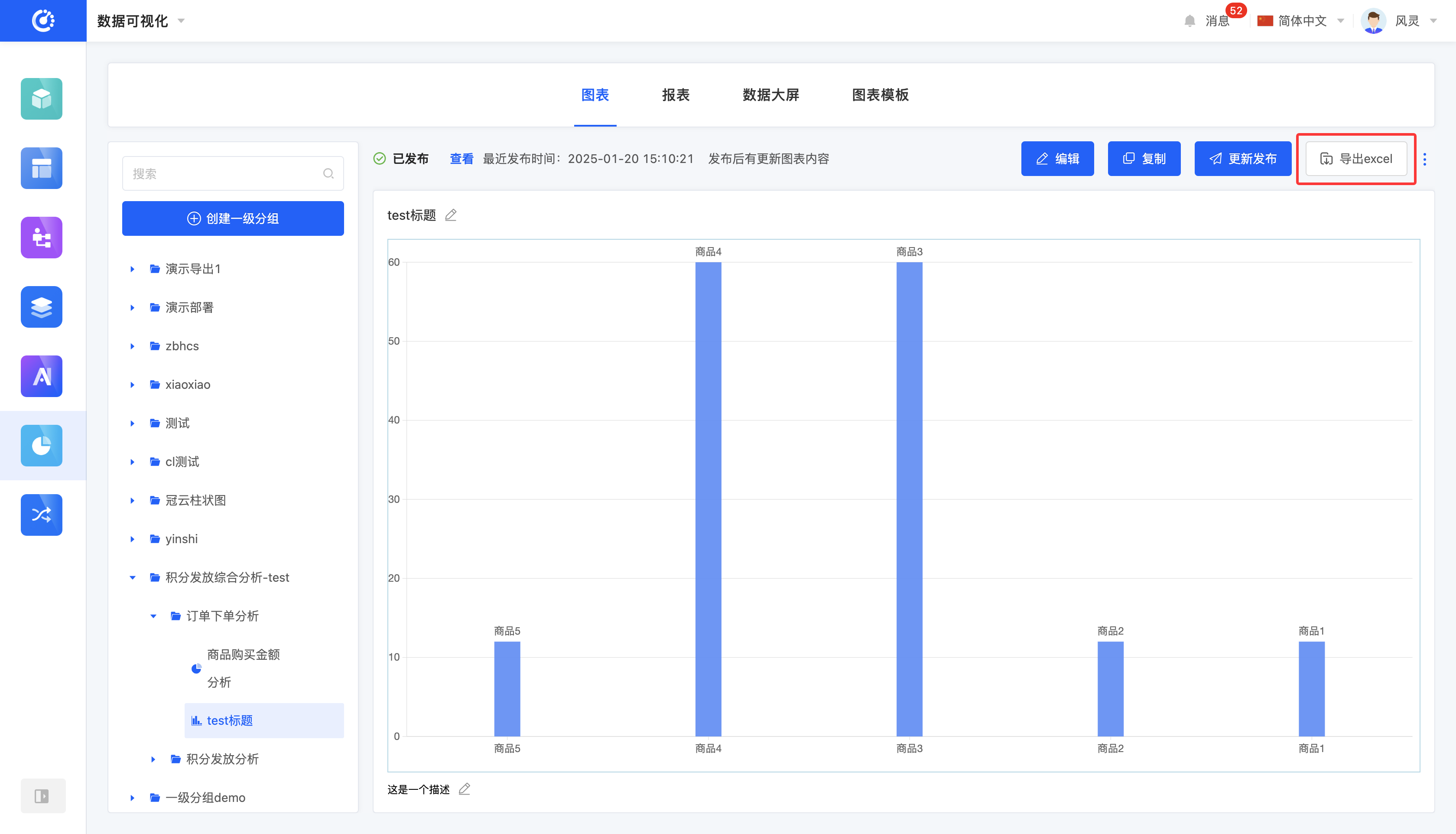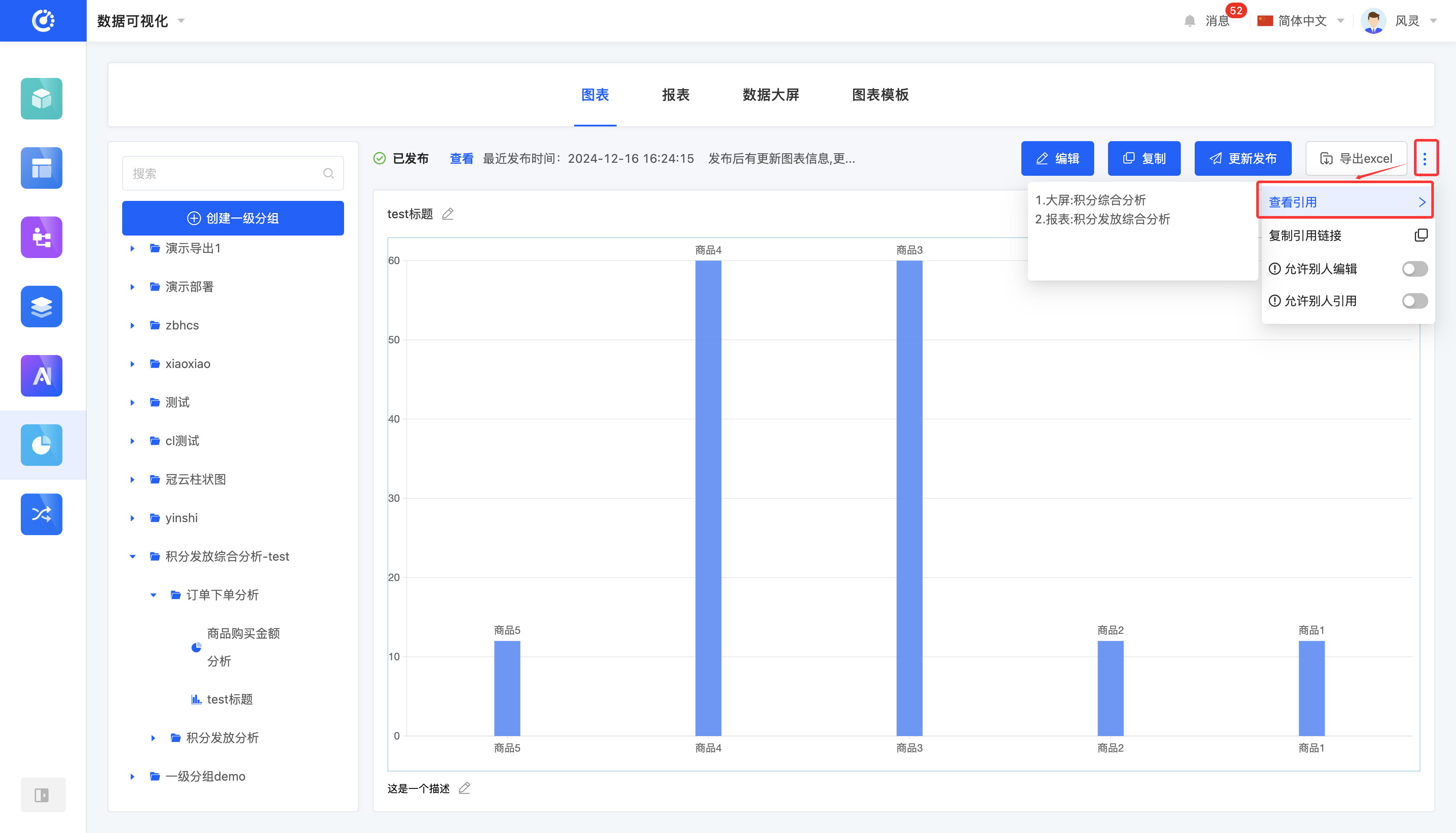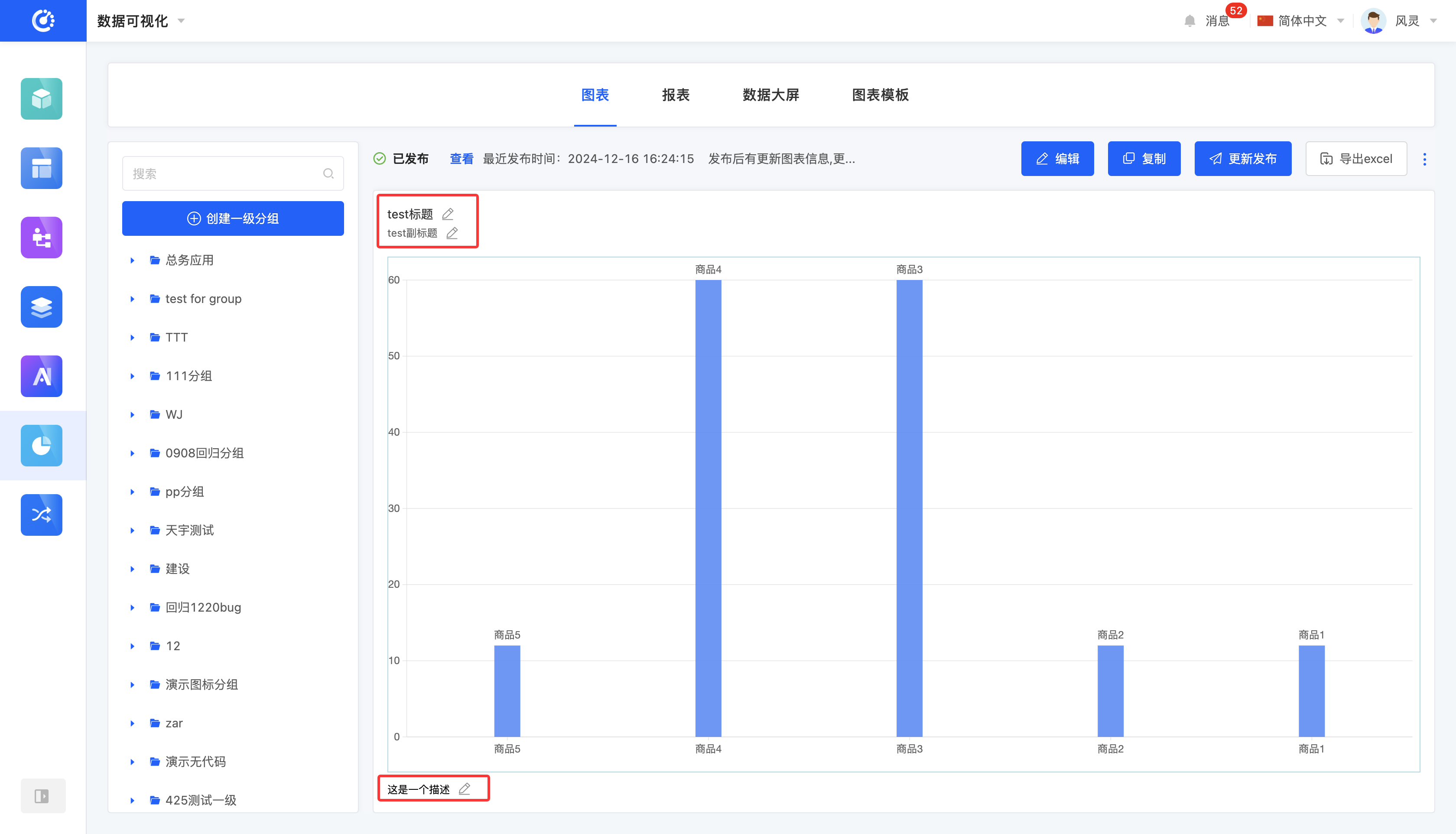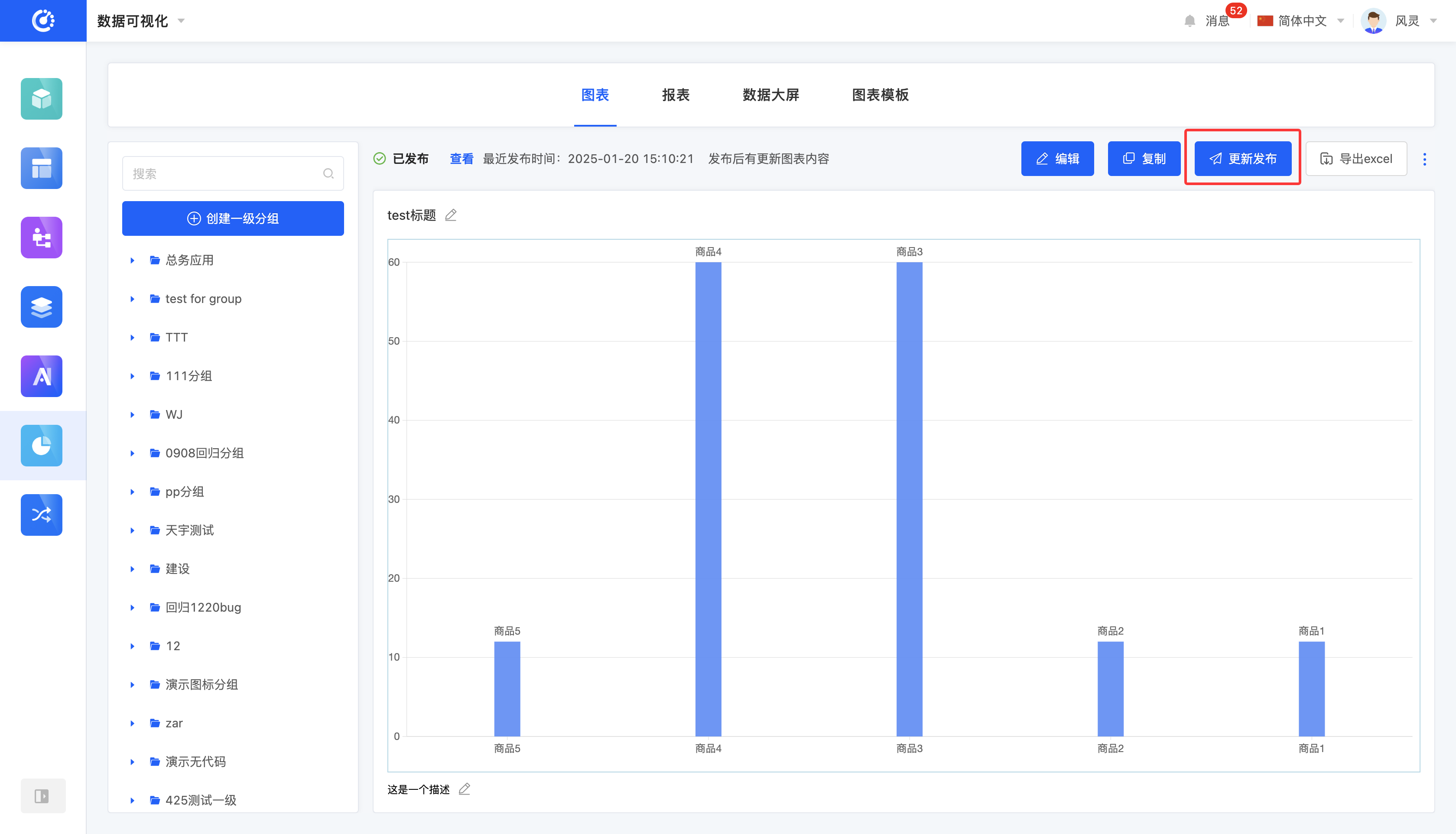 After the chart design is completed, users can choose to publish the chart. The published chart can be referenced in other designers, and the latest publishing time will be displayed. If the content of the chart is updated after publishing, the original "Publish" button will change to "Update and Publish".
