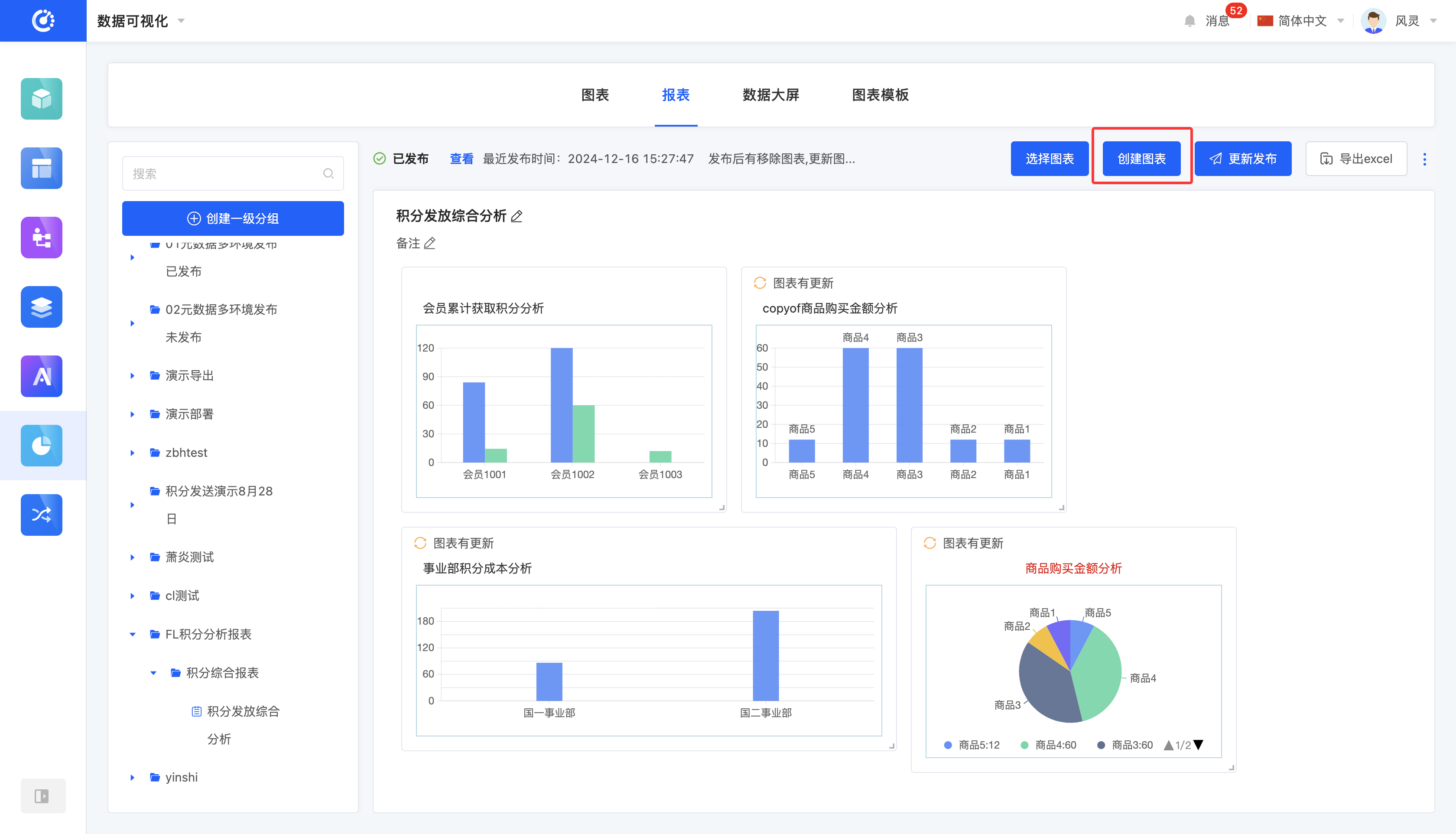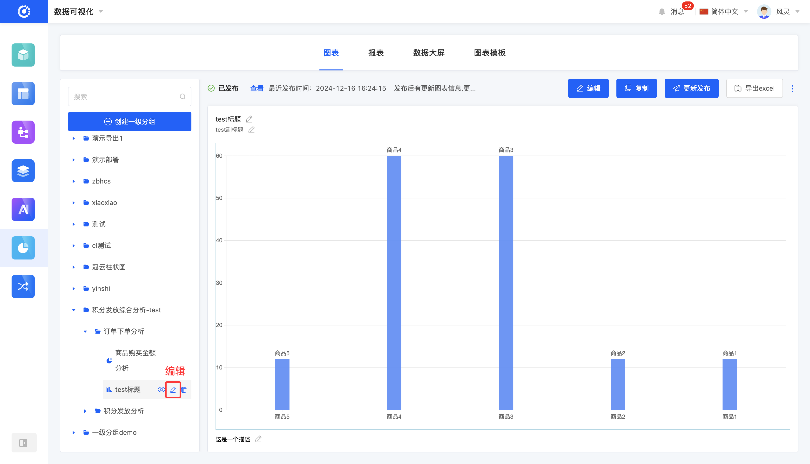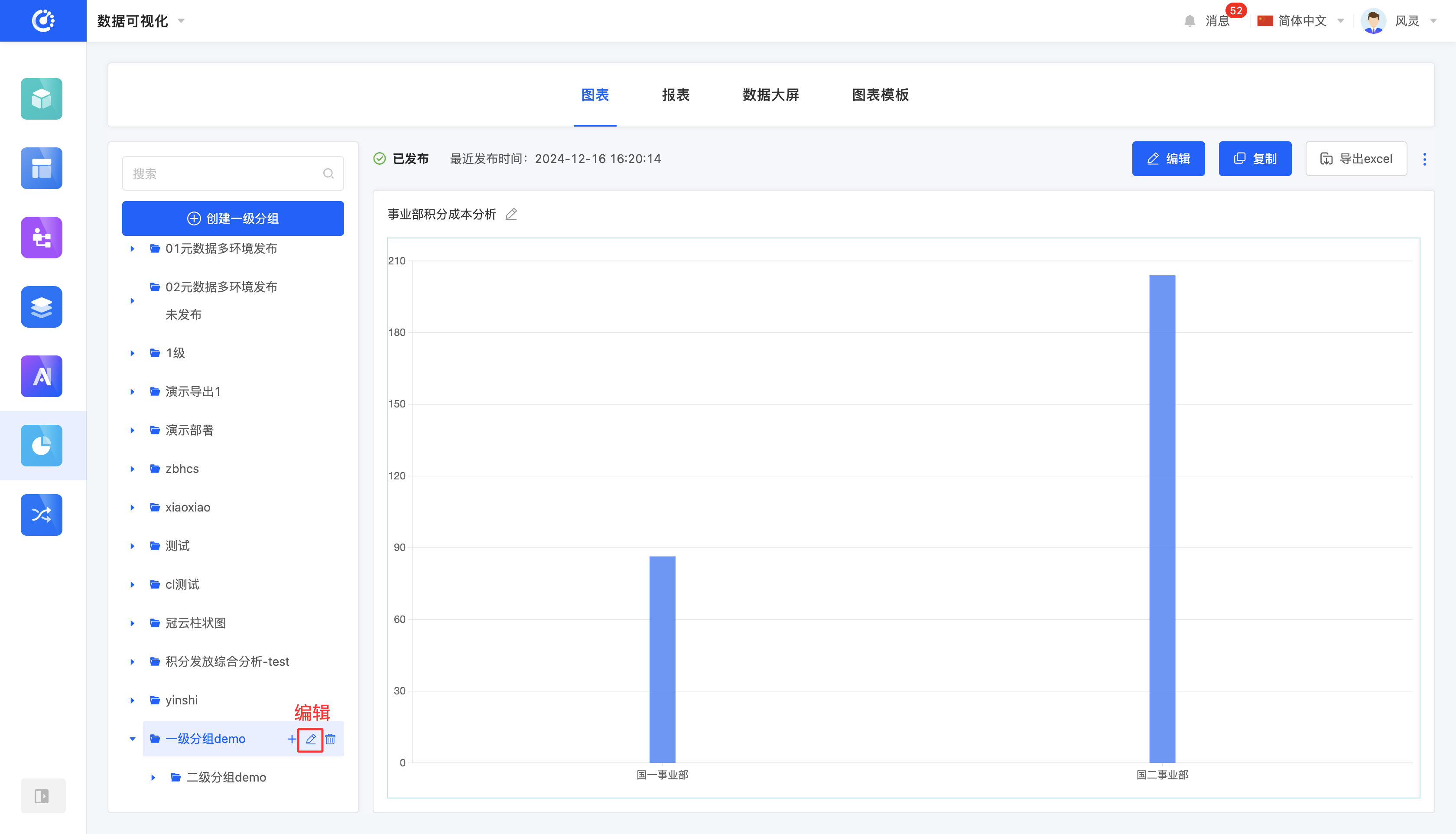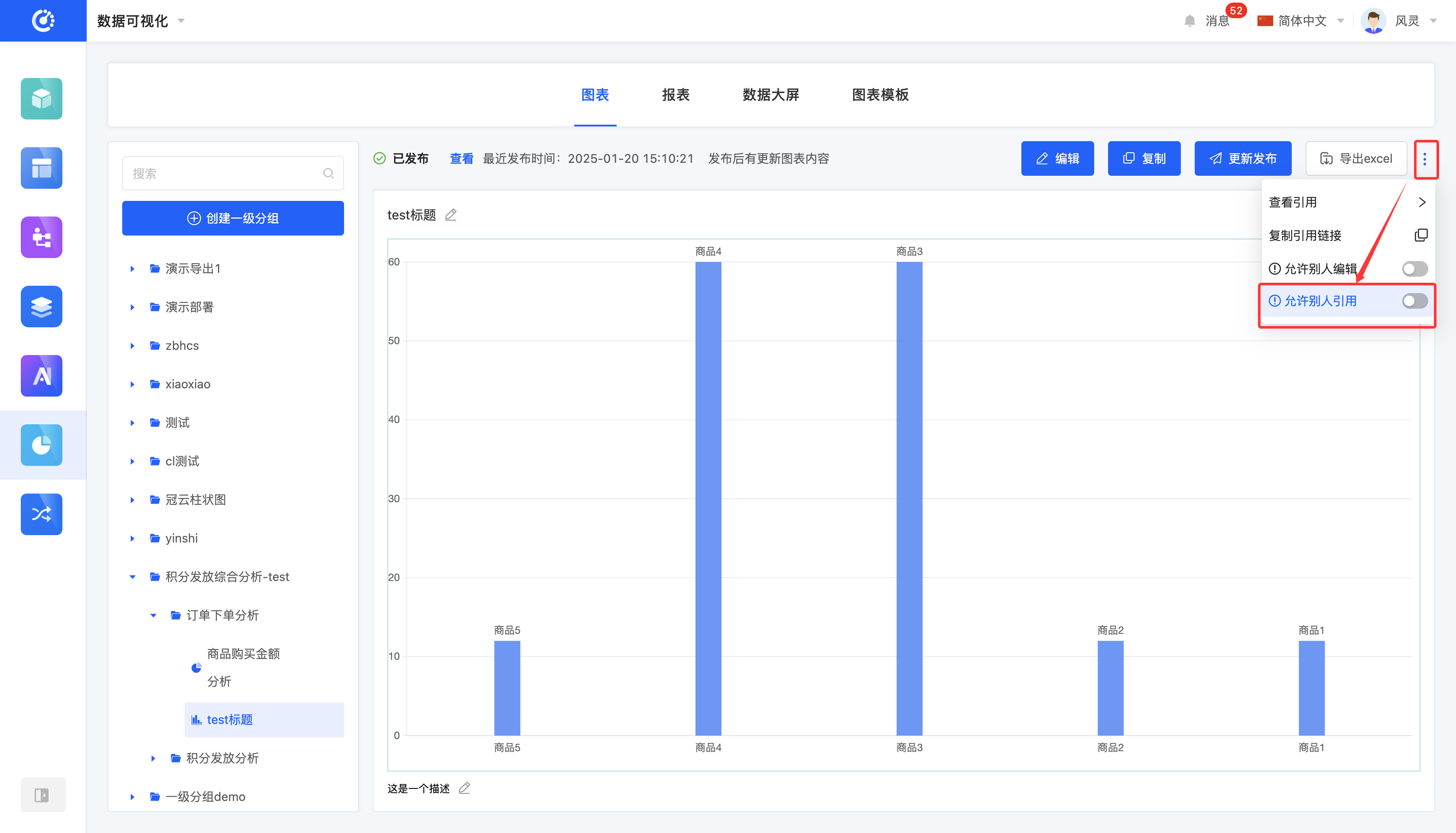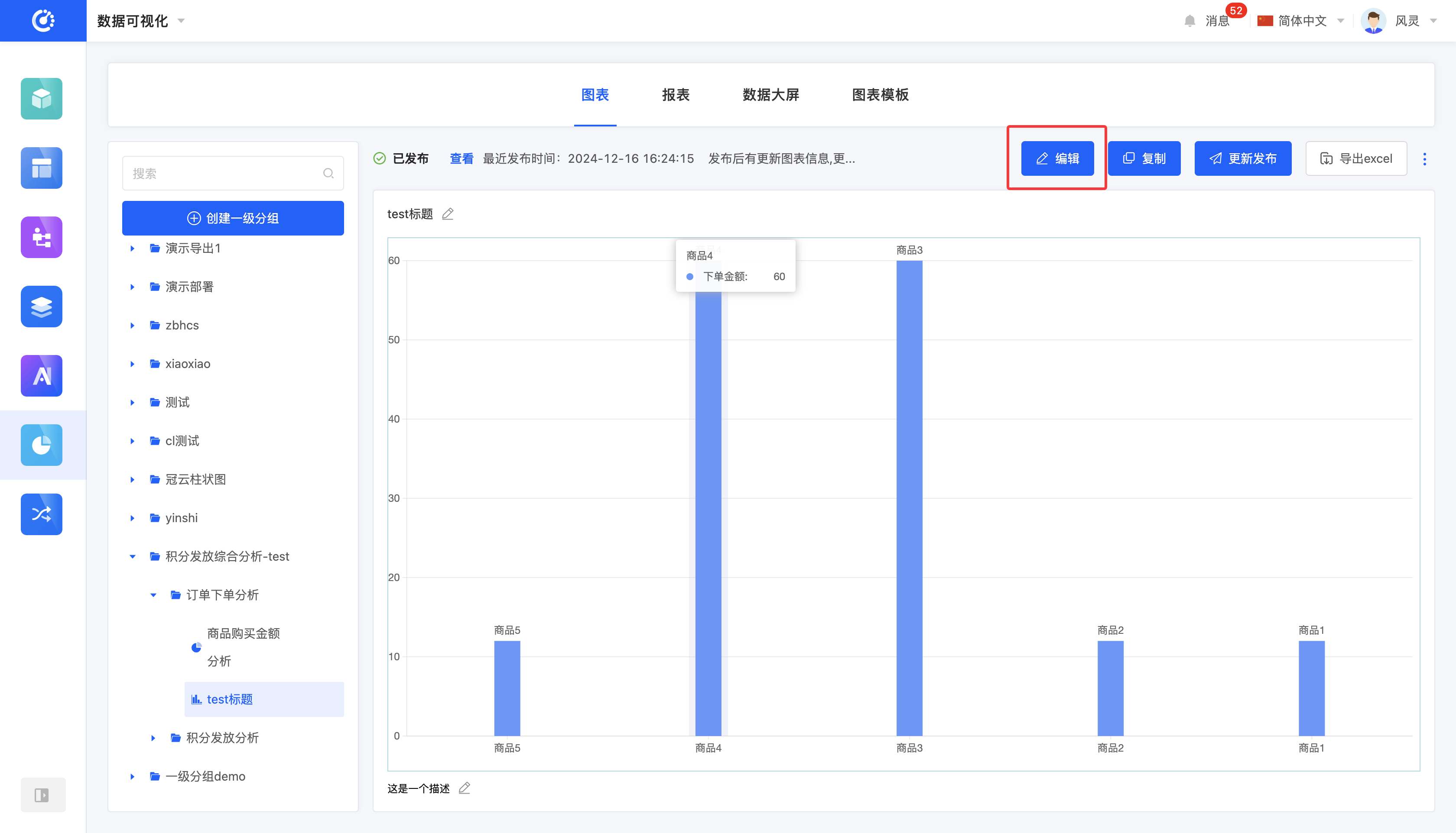 After the chart design is completed, users can choose to publish the chart. The published chart can be referenced in other designers, and the latest publishing time will be displayed. If the content of the chart is updated after publishing, the original "Publish" button will change to "Update and Publish".