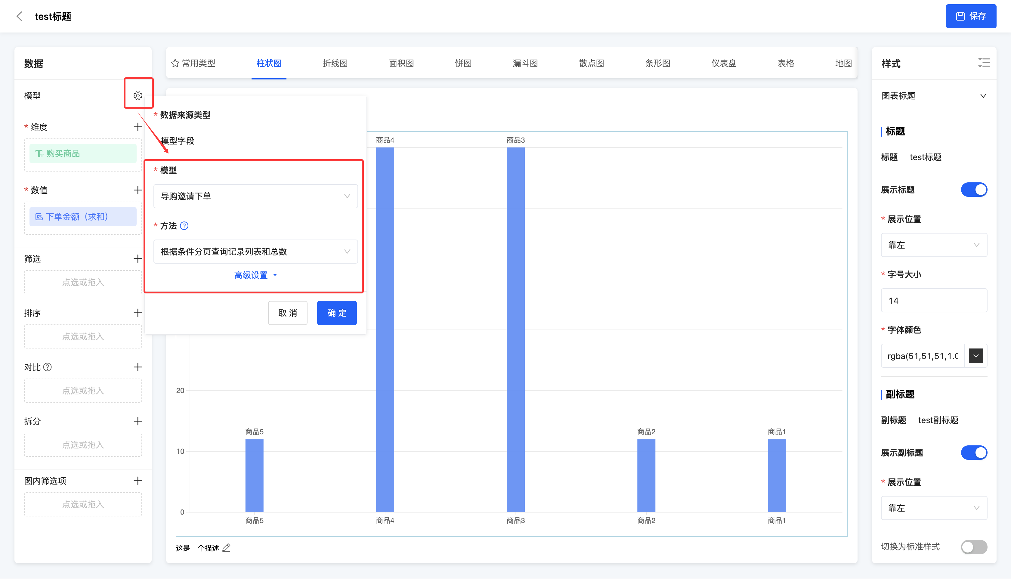 - Edit when designing the chart: You can edit the data source type, method, title, subtitle, and description.
