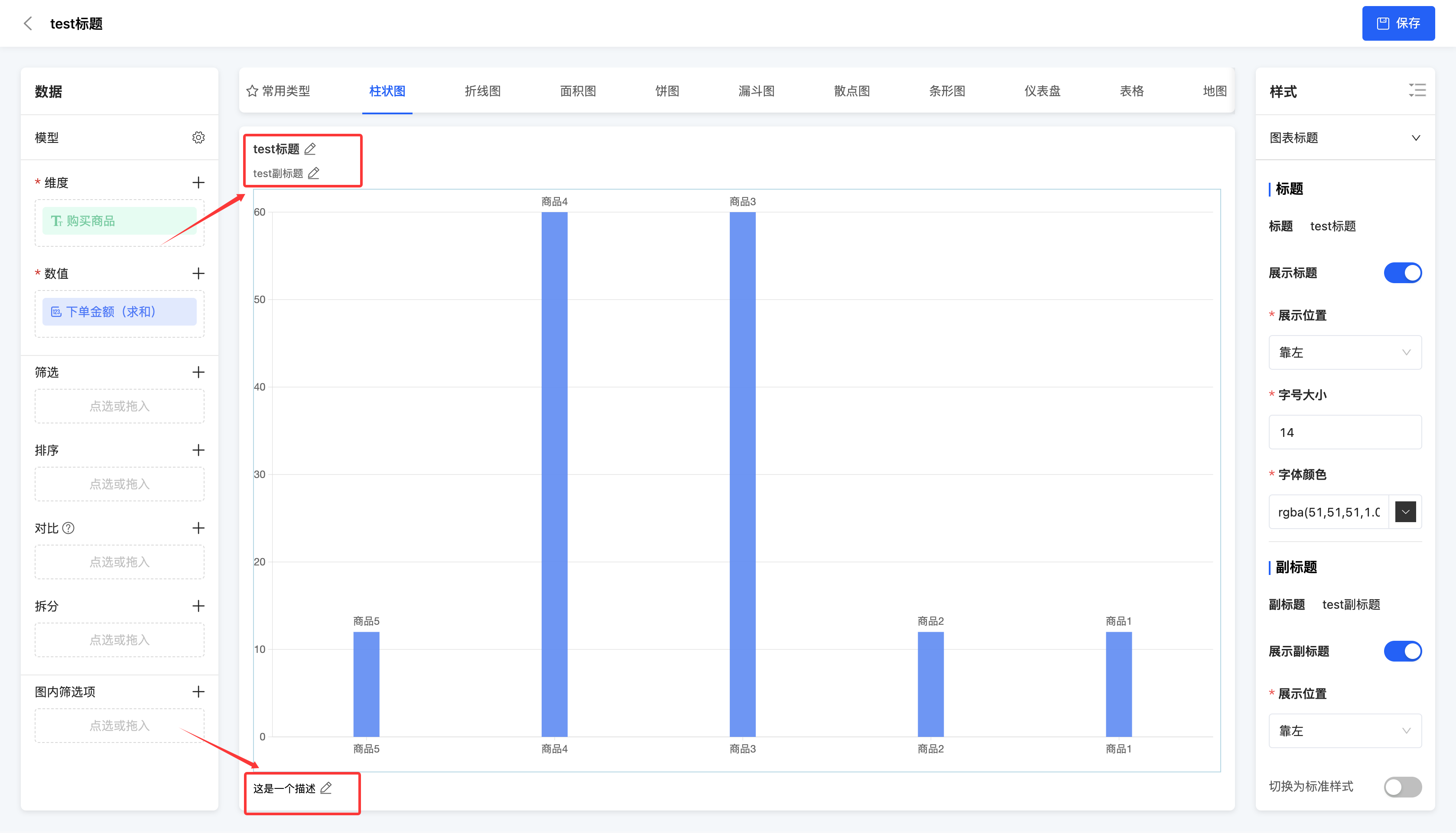 If the title, subtitle, or description is not displayed, you can check whether the display is turned off in the style bar of the chart design. If it is turned off, it cannot be displayed, and similarly, it cannot be edited.