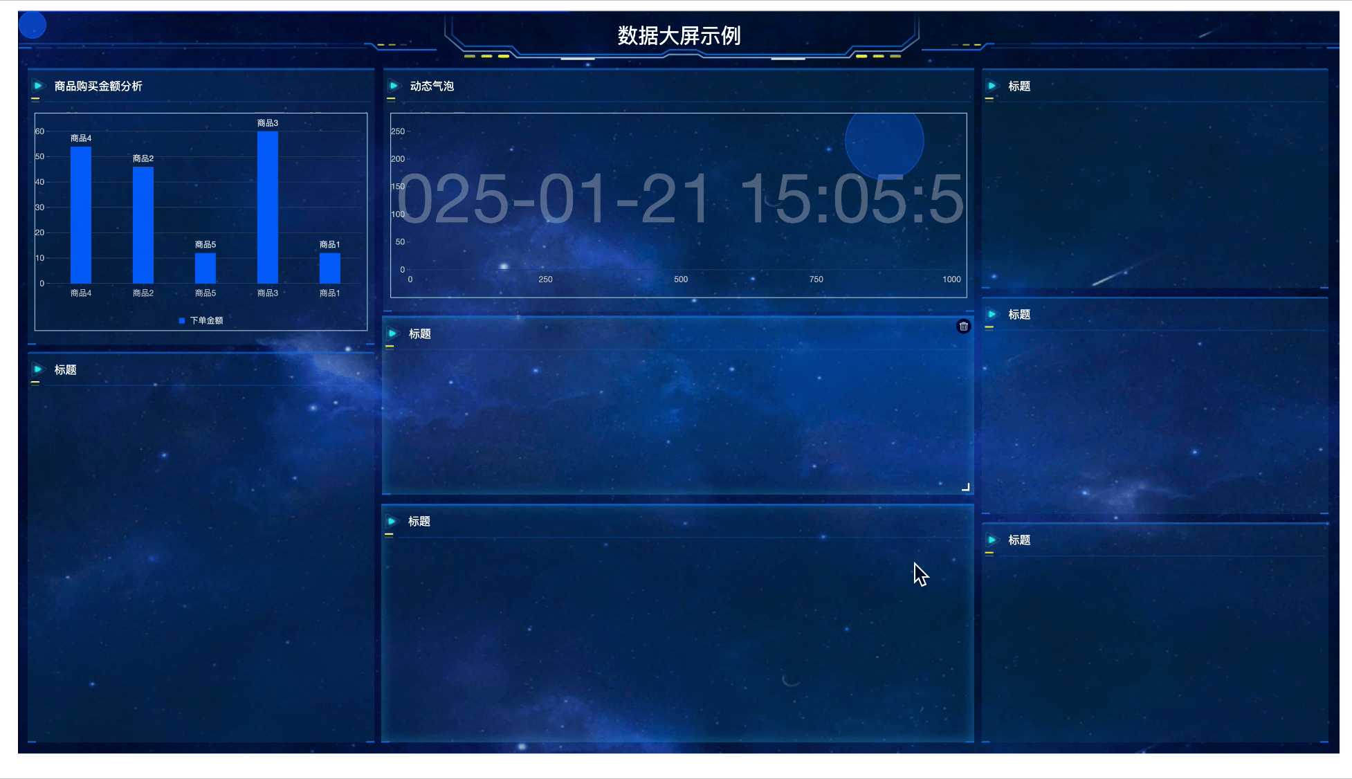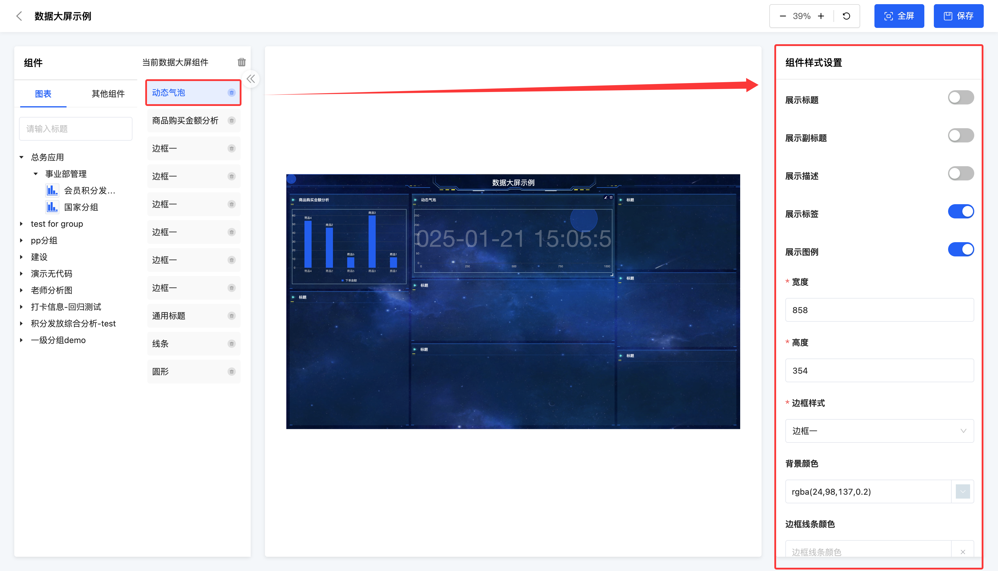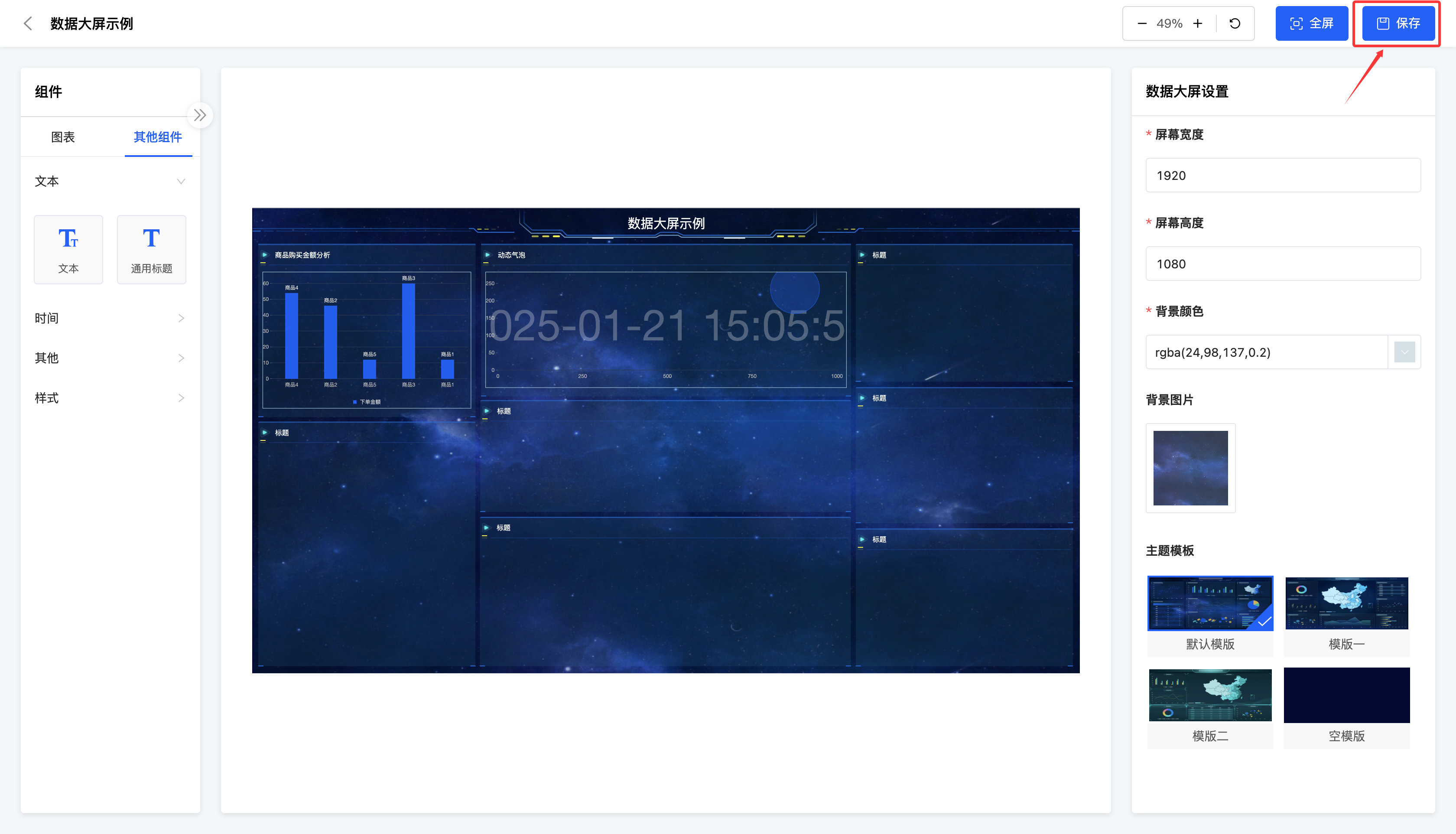 - Data Dashboard: When setting the data dashboard, you can set the width and height of the screen, background color, background image, and theme.