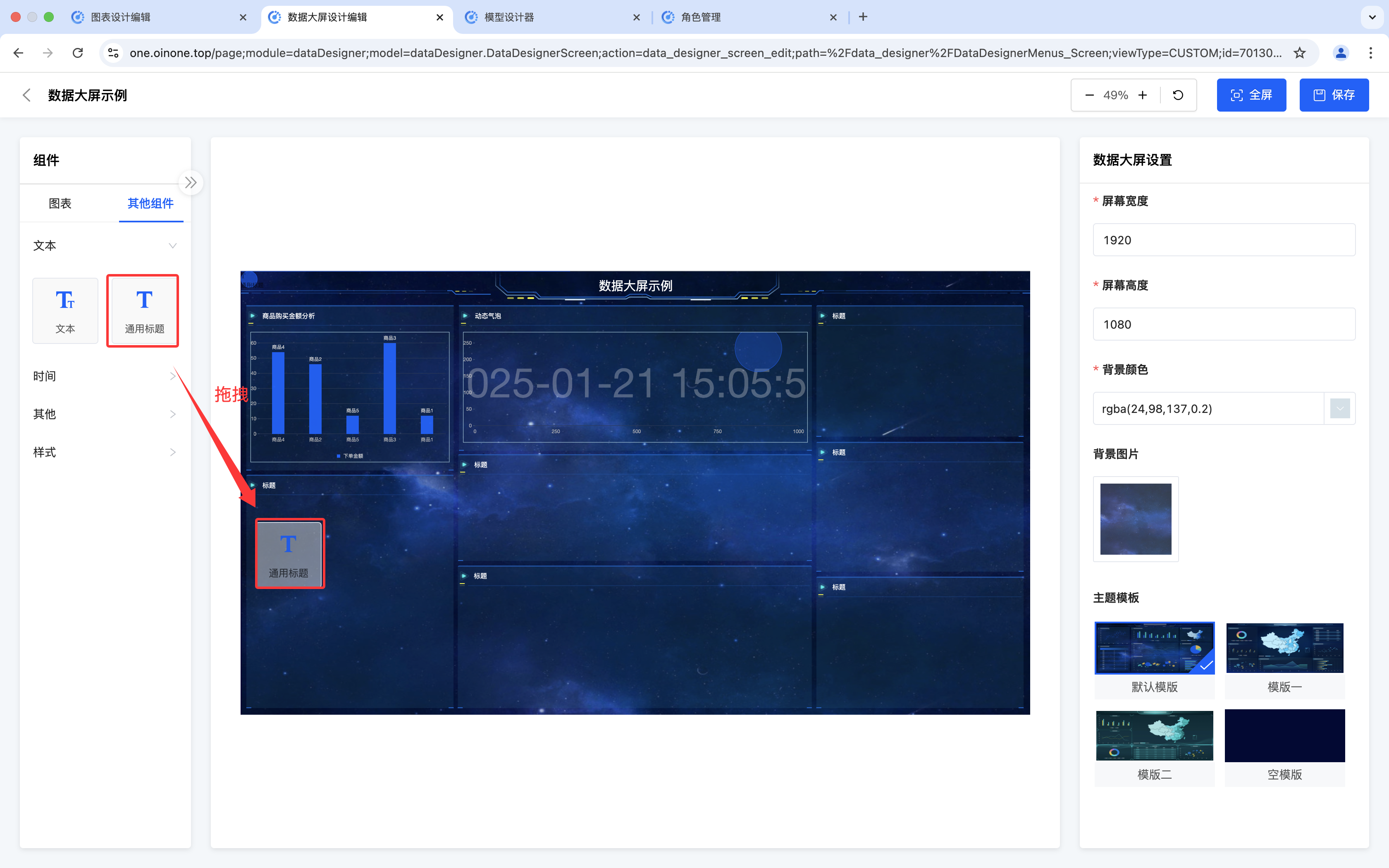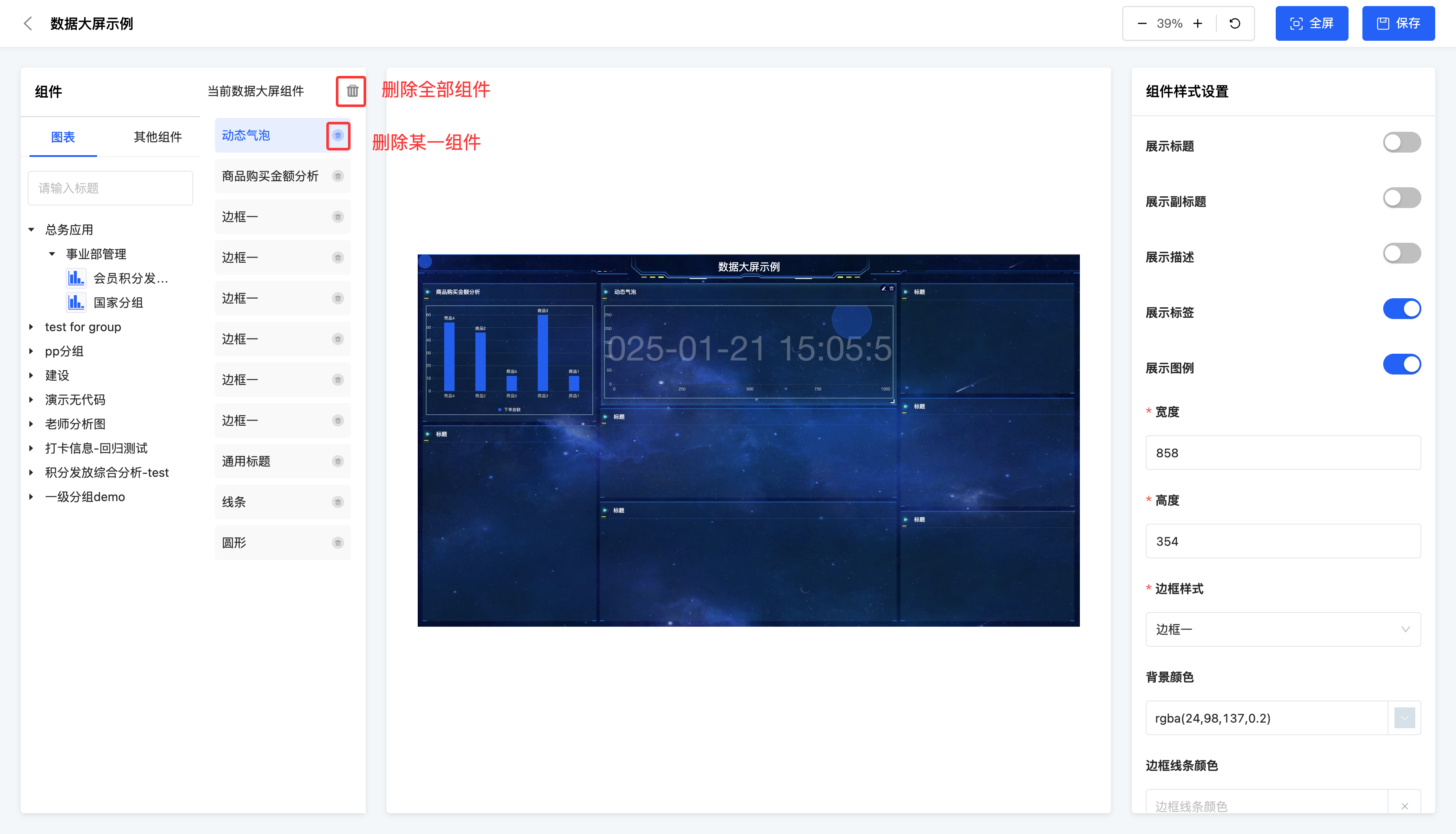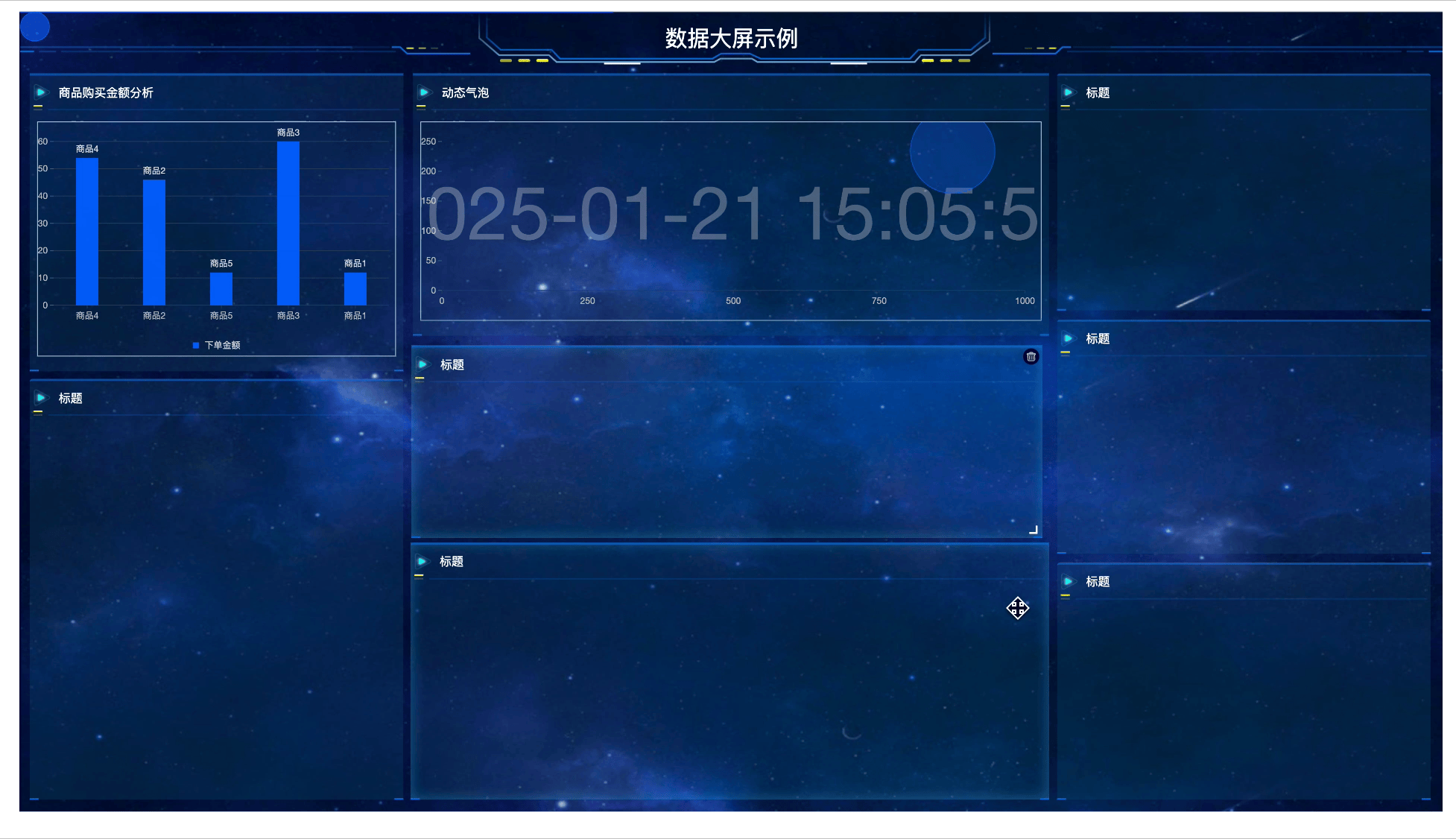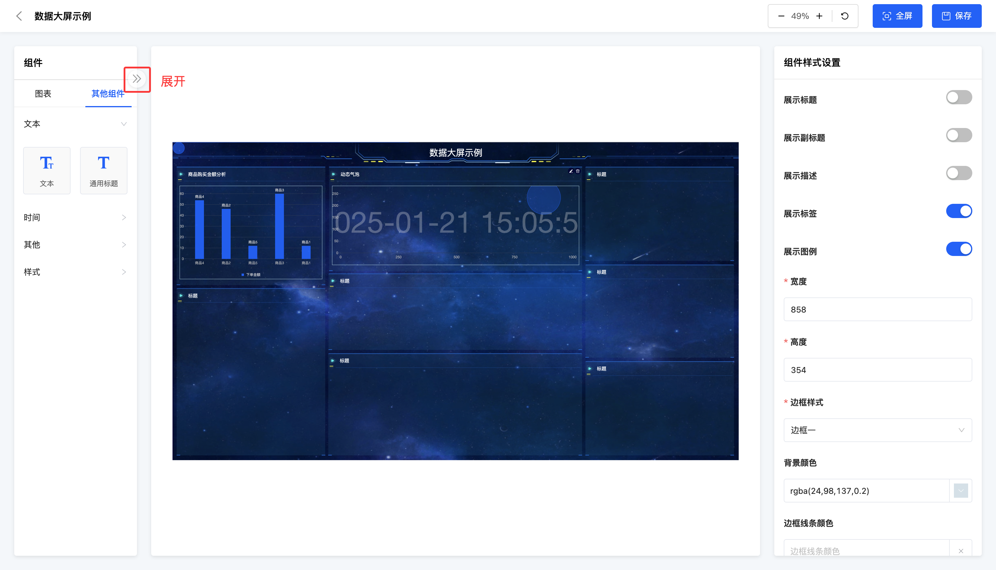 - Data Dashboard: When setting the data dashboard, you can set the width and height of the screen, background color, background image, and theme.
