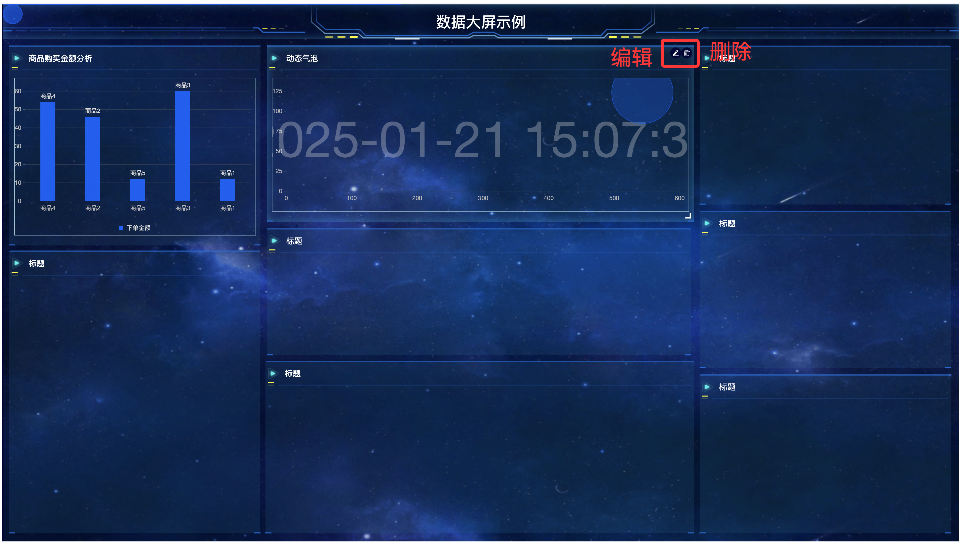 After a component is added to the data dashboard, you can flexibly edit and delete it in the dashboard environment. You can not only adjust the position and size of the component to meet the overall layout requirements, but also when the component is a chart, it provides a convenient shortcut entry. You can quickly jump to the chart design interface through this entry to further modify and improve the chart content.