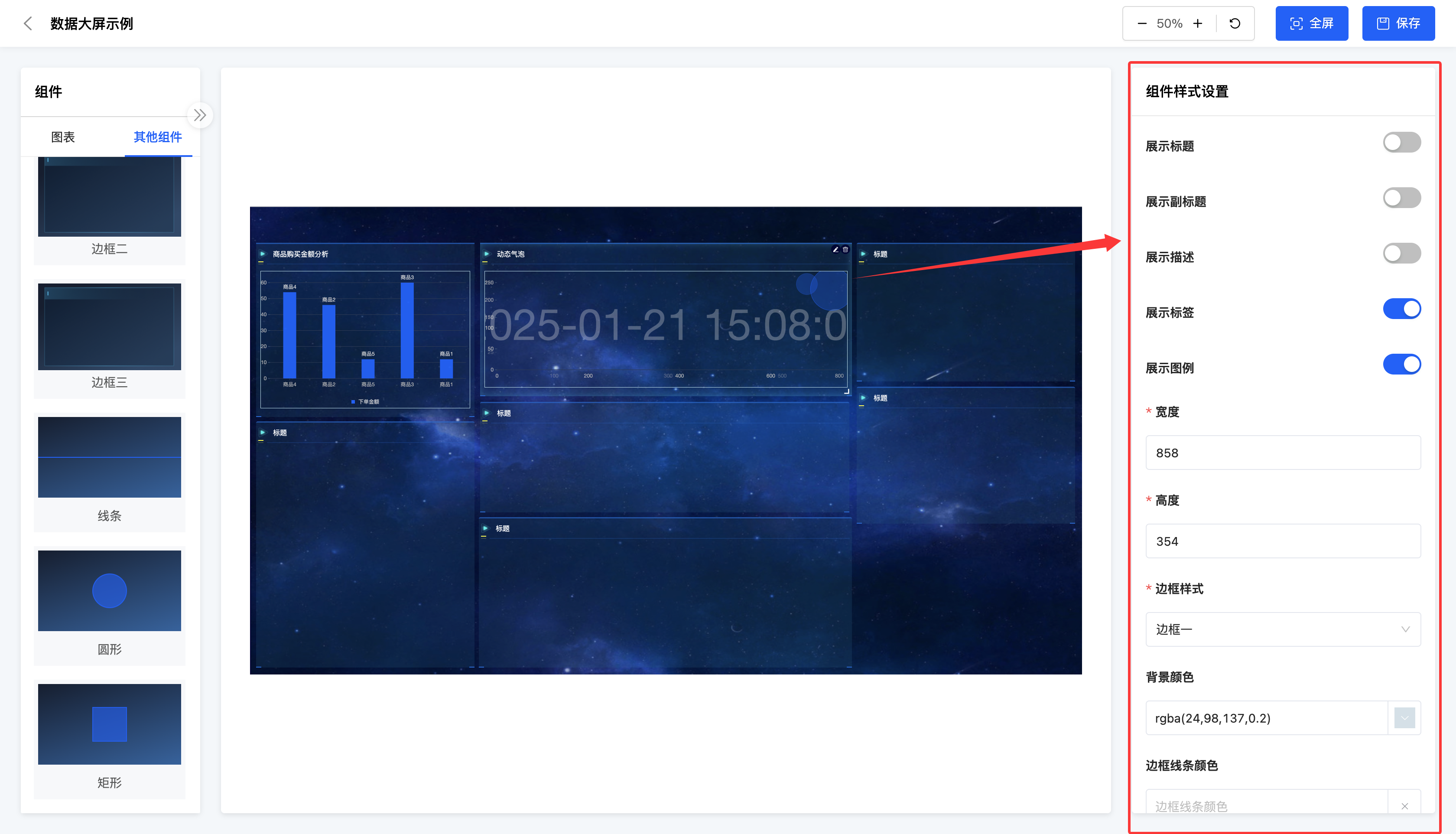 - Style: Includes the settings for border one, two, three, as well as lines, circles, and rectangles, which can be used to customize the data dashboard when not using the theme template. You can set the border style, color, etc. for the components in the style.