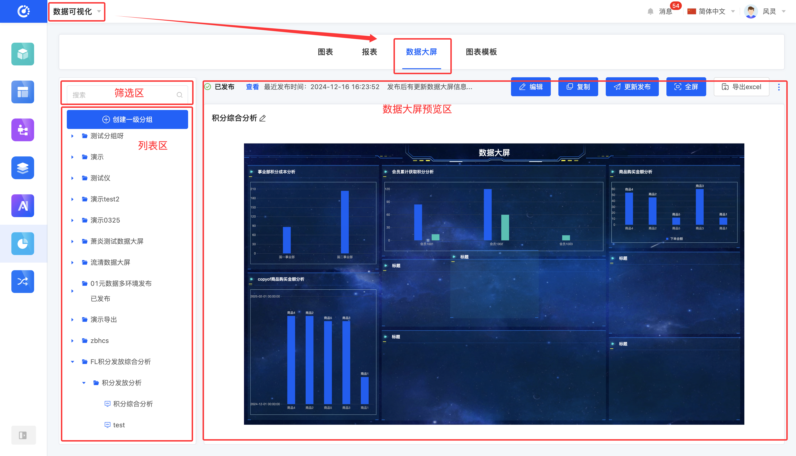 Enter the "Data Dashboards" page after entering data visualization to manage data dashboards. This page mainly consists of three parts: the filtering area, the list area, and the data dashboard preview area.