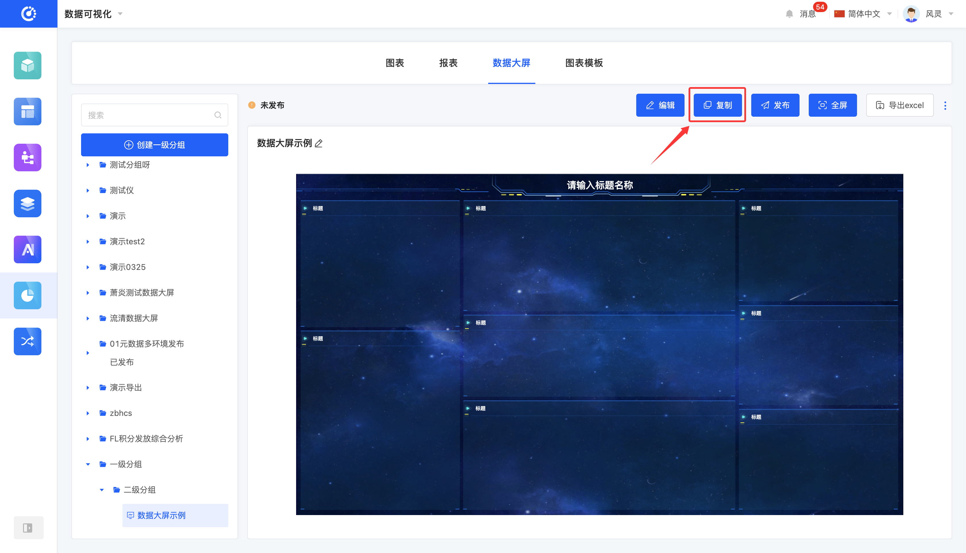 Provides a data dashboard copying function. This function will generate a copy at the bottom of the group where the original chart is located. The title of the copy will be "copy of [original chart name]".