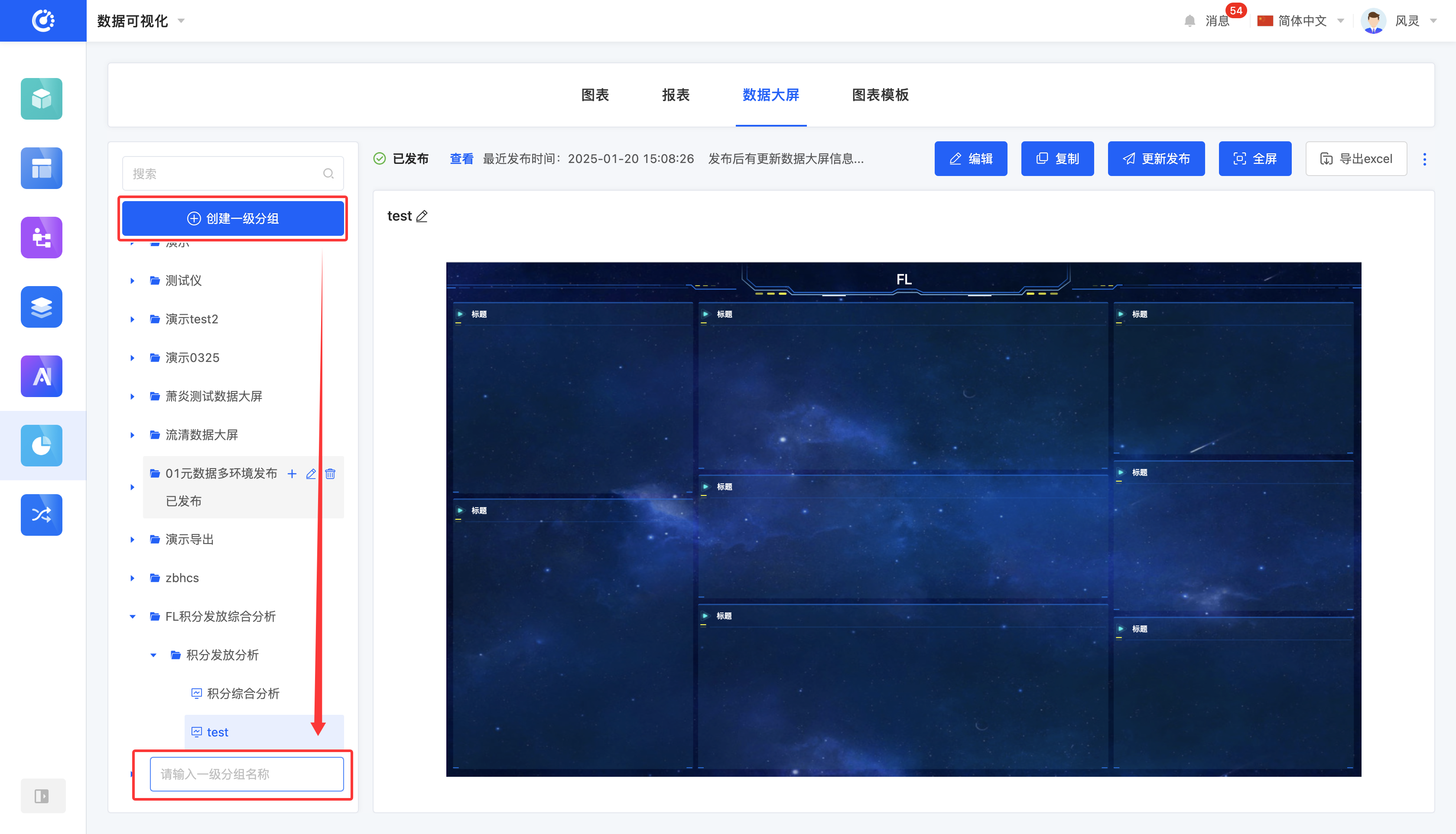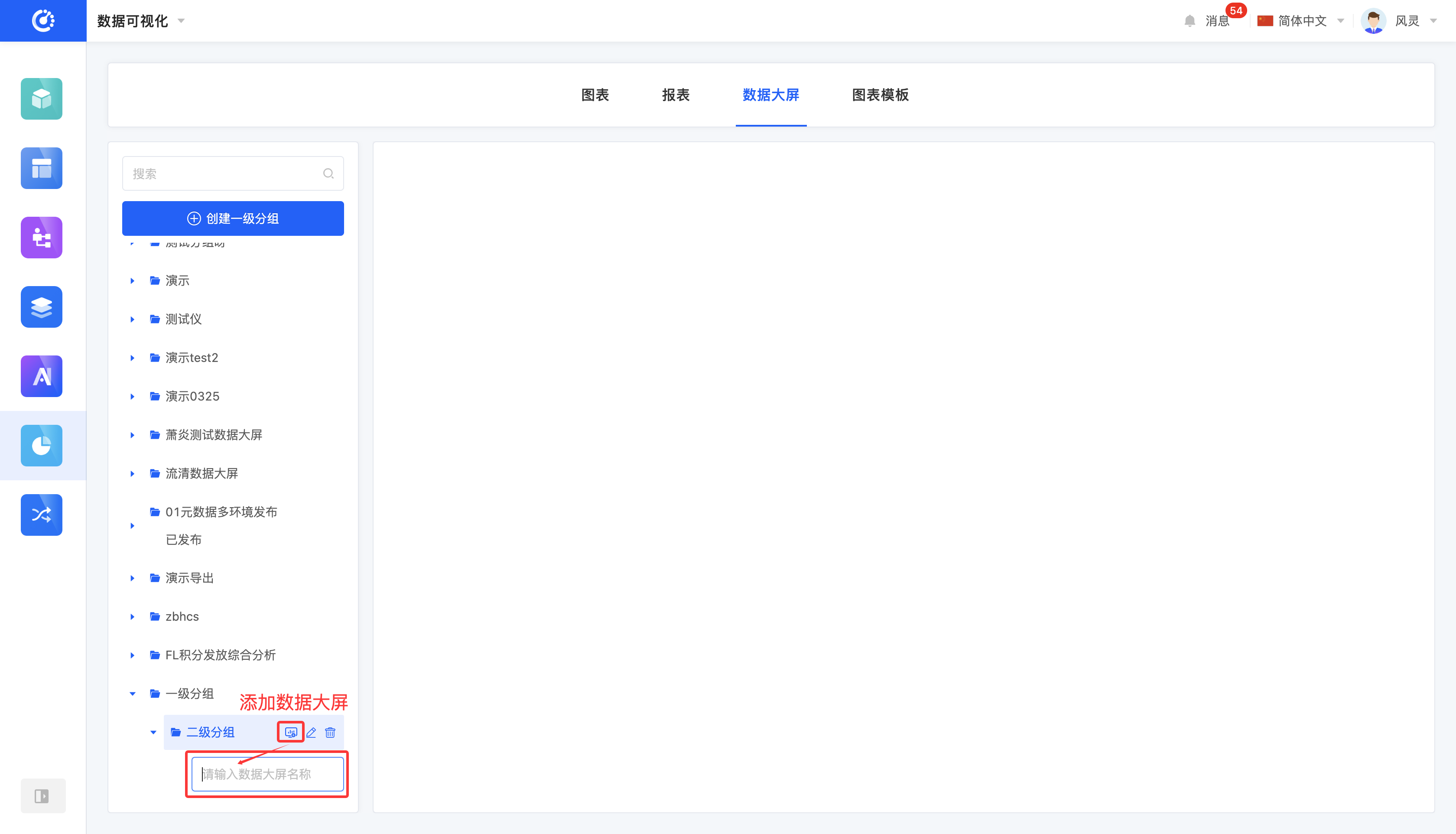 Click the "Add Data Dashboard" icon under the second-level group, enter the title, and then you can successfully create the data dashboard.