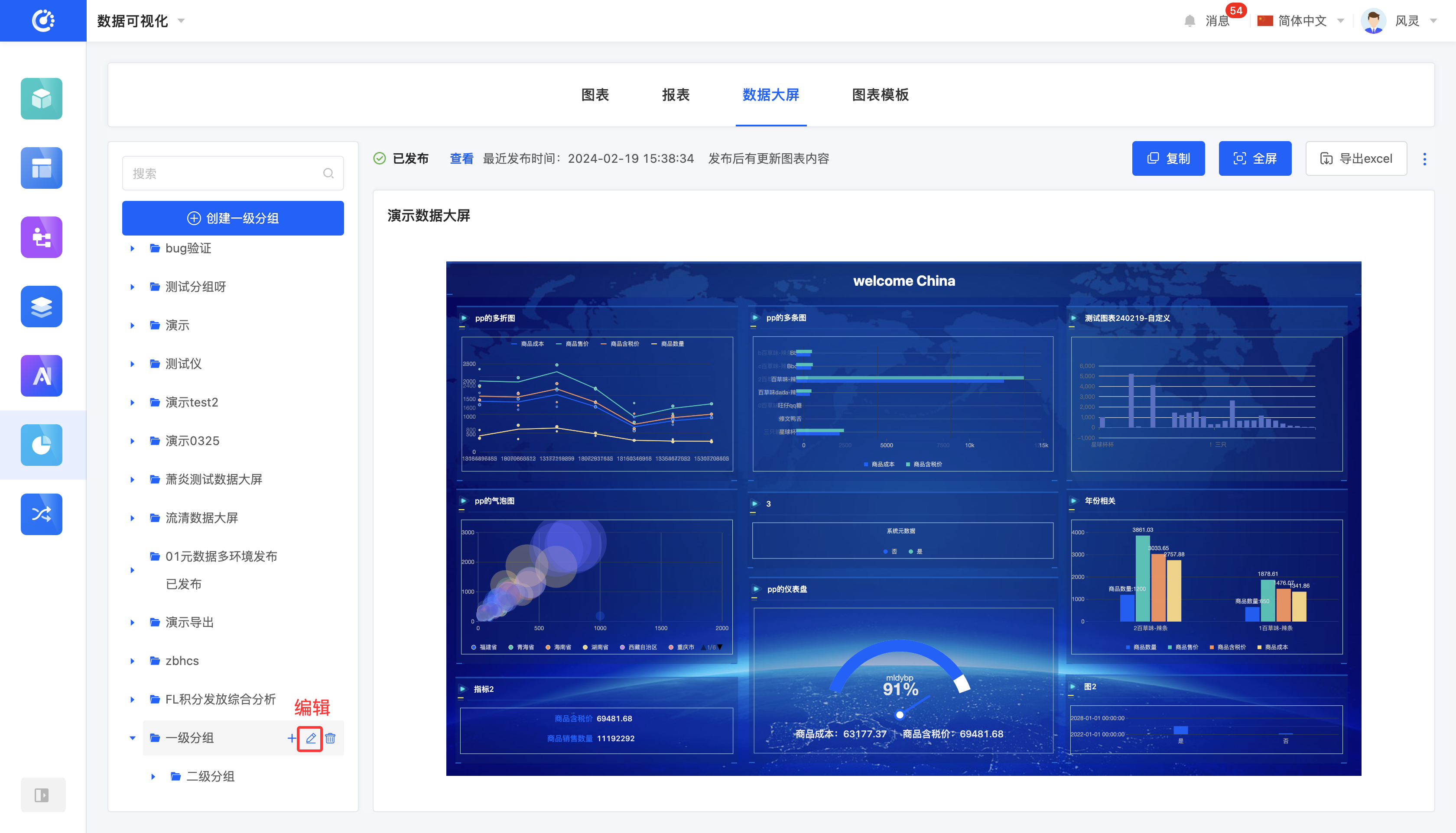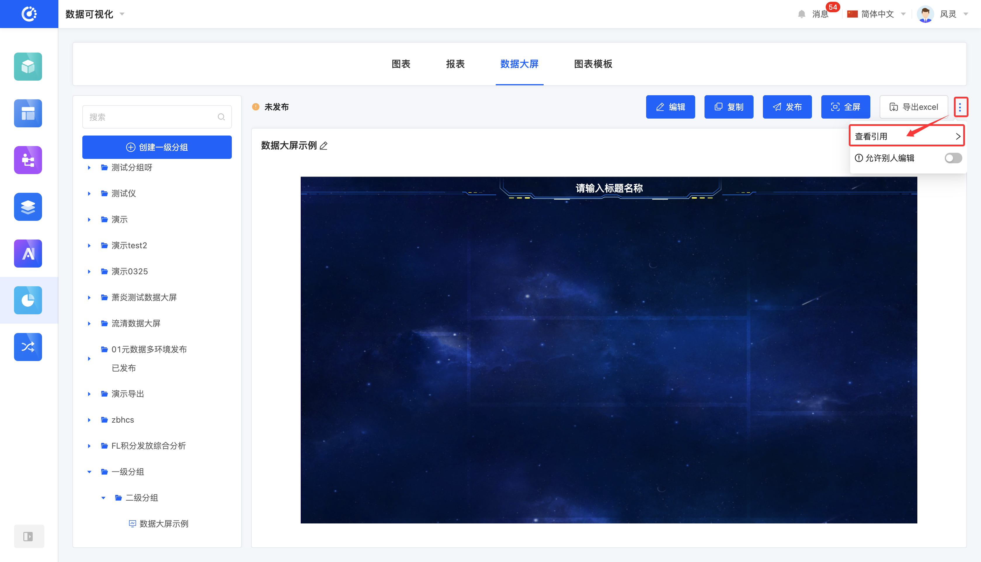 • Data dashboard preview area: Displays the designed data dashboards, where users can perform operations such as editing, publishing, and exporting.