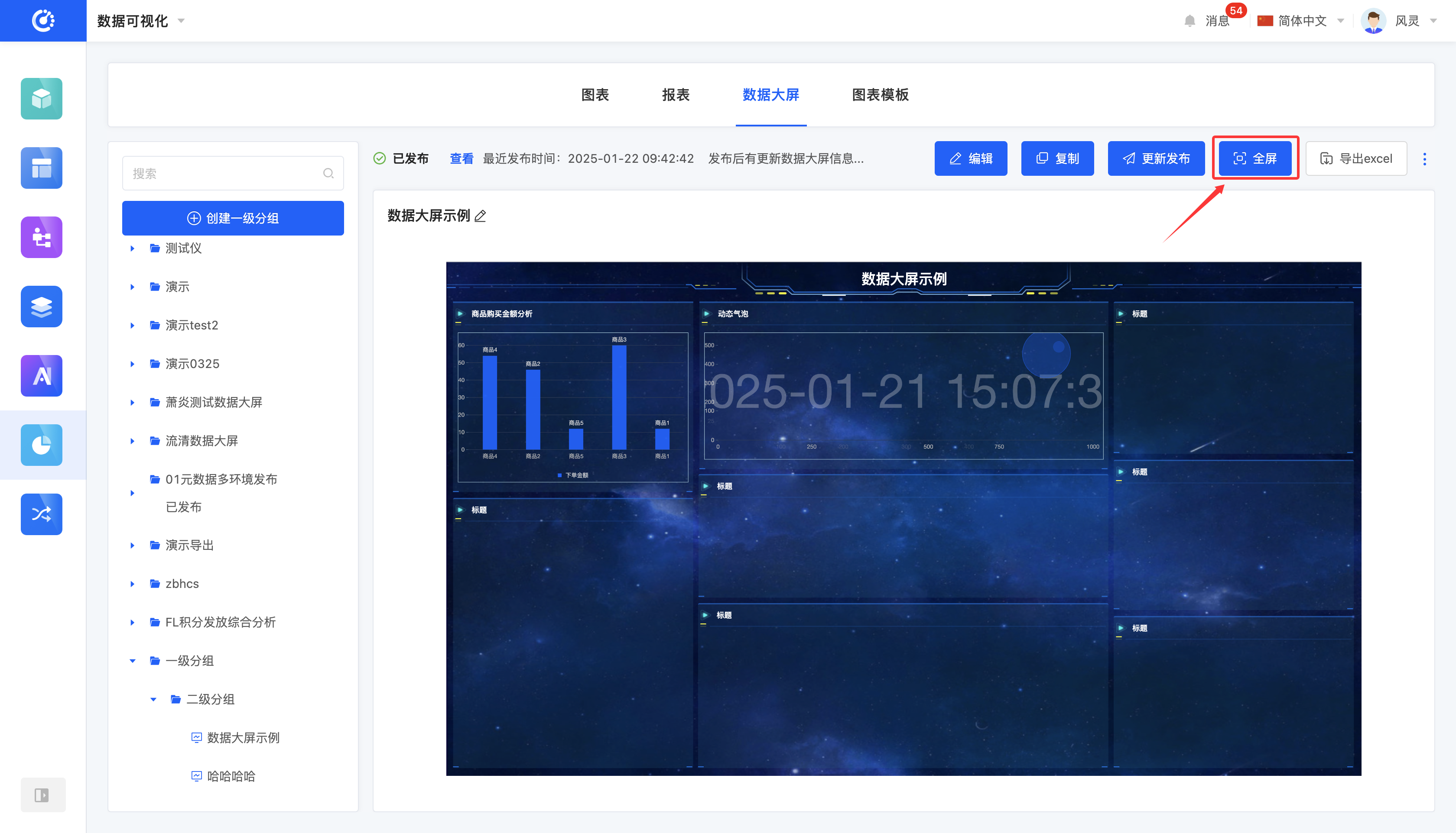 Supports full-screen display of data dashboards. The data dashboard will occupy the entire screen space, and the display effect of charts and components will be more prominent and clear.
