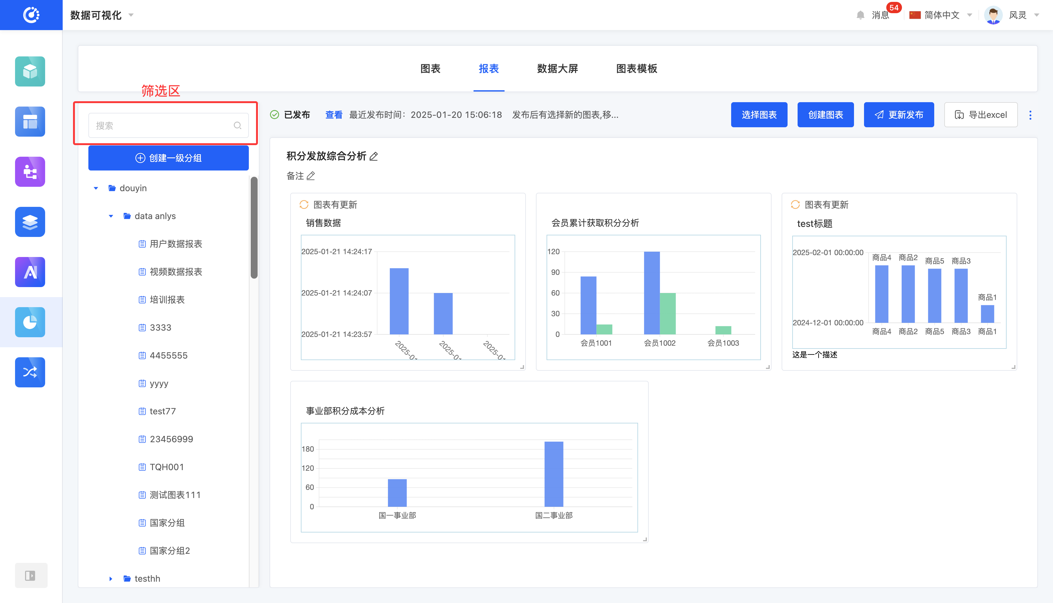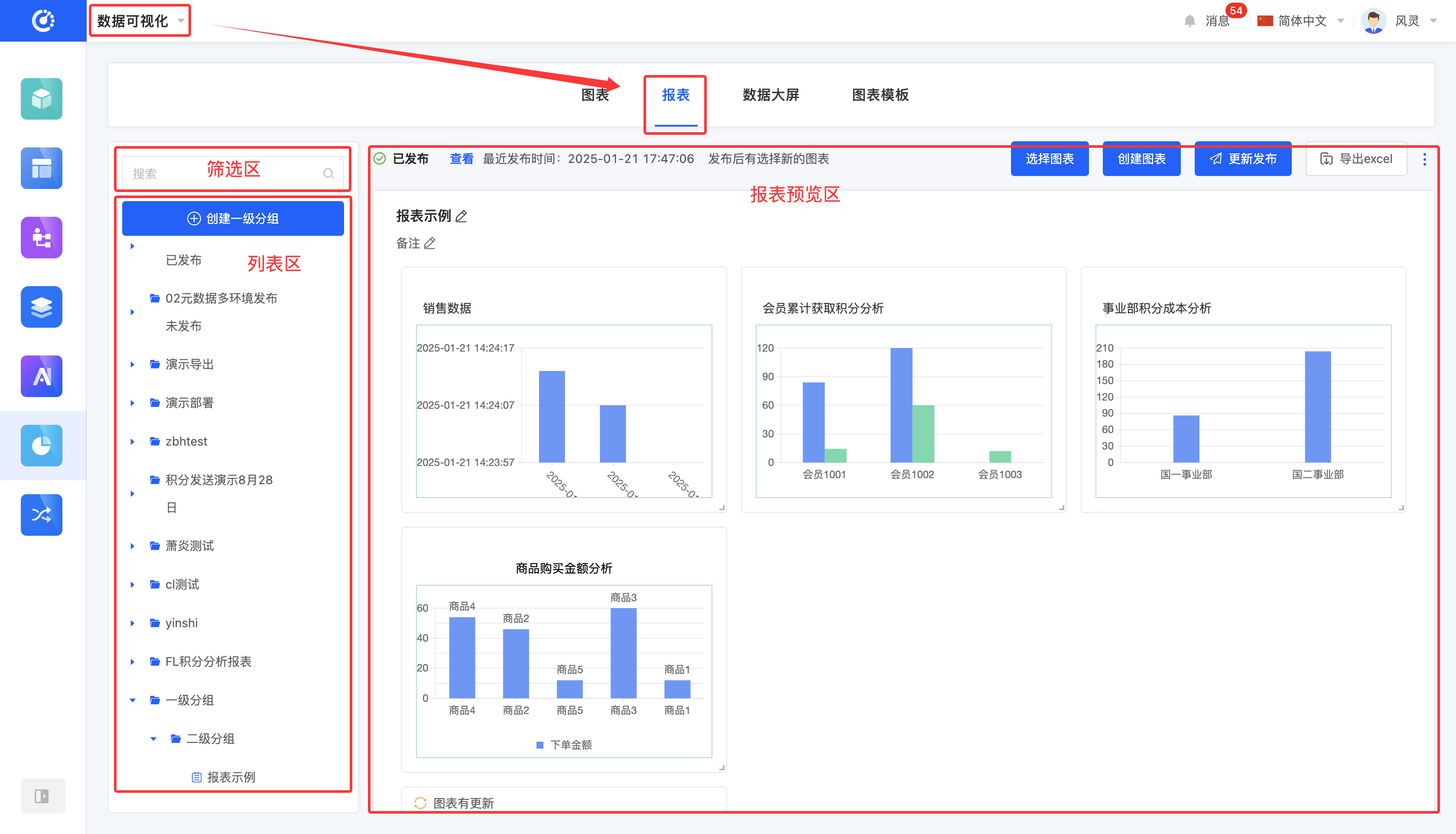 Upon entering the "Reports" page in the data visualization section, you can manage reports. This page mainly consists of three parts: the filtering area, the list area, and the report preview area.