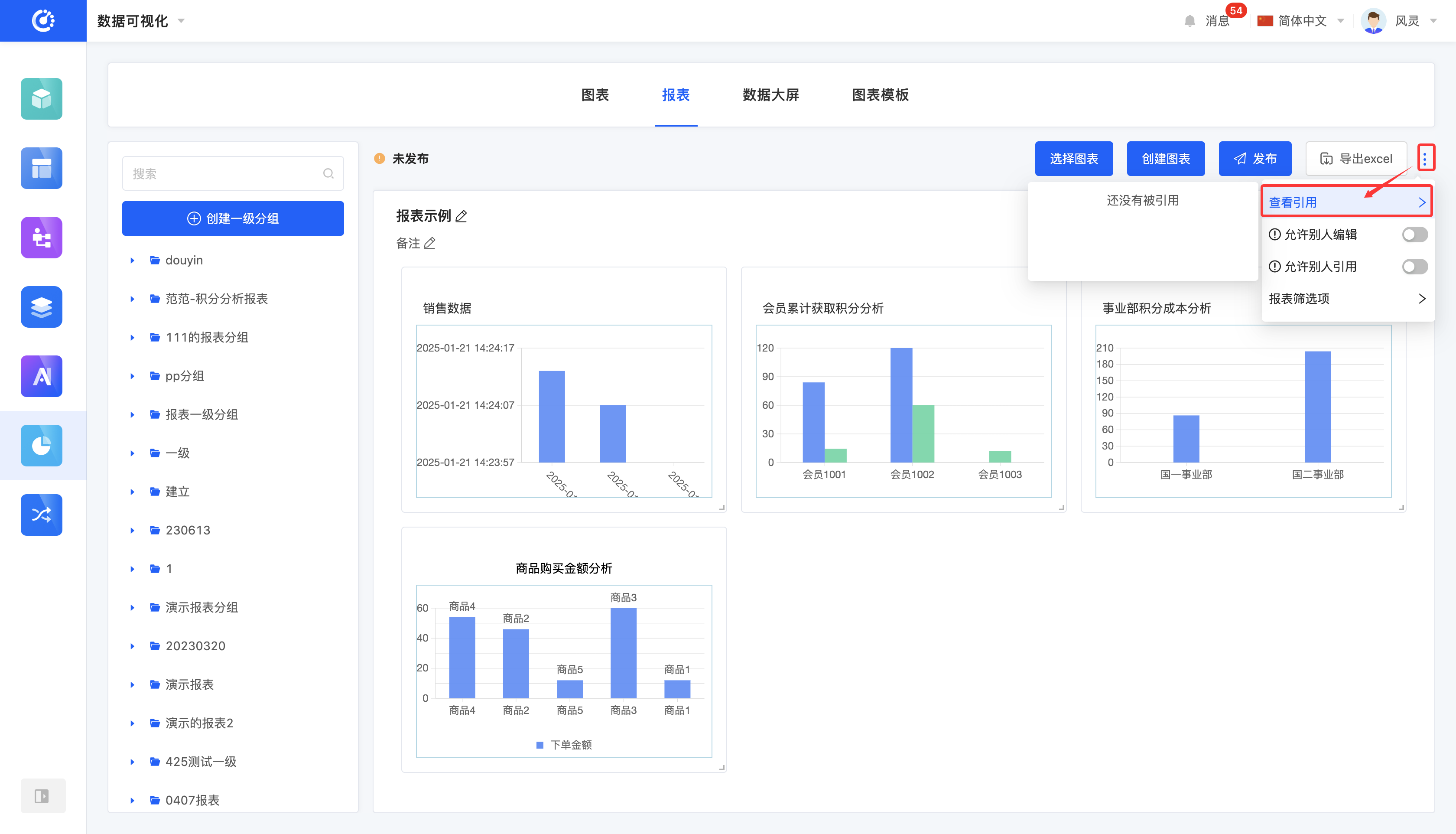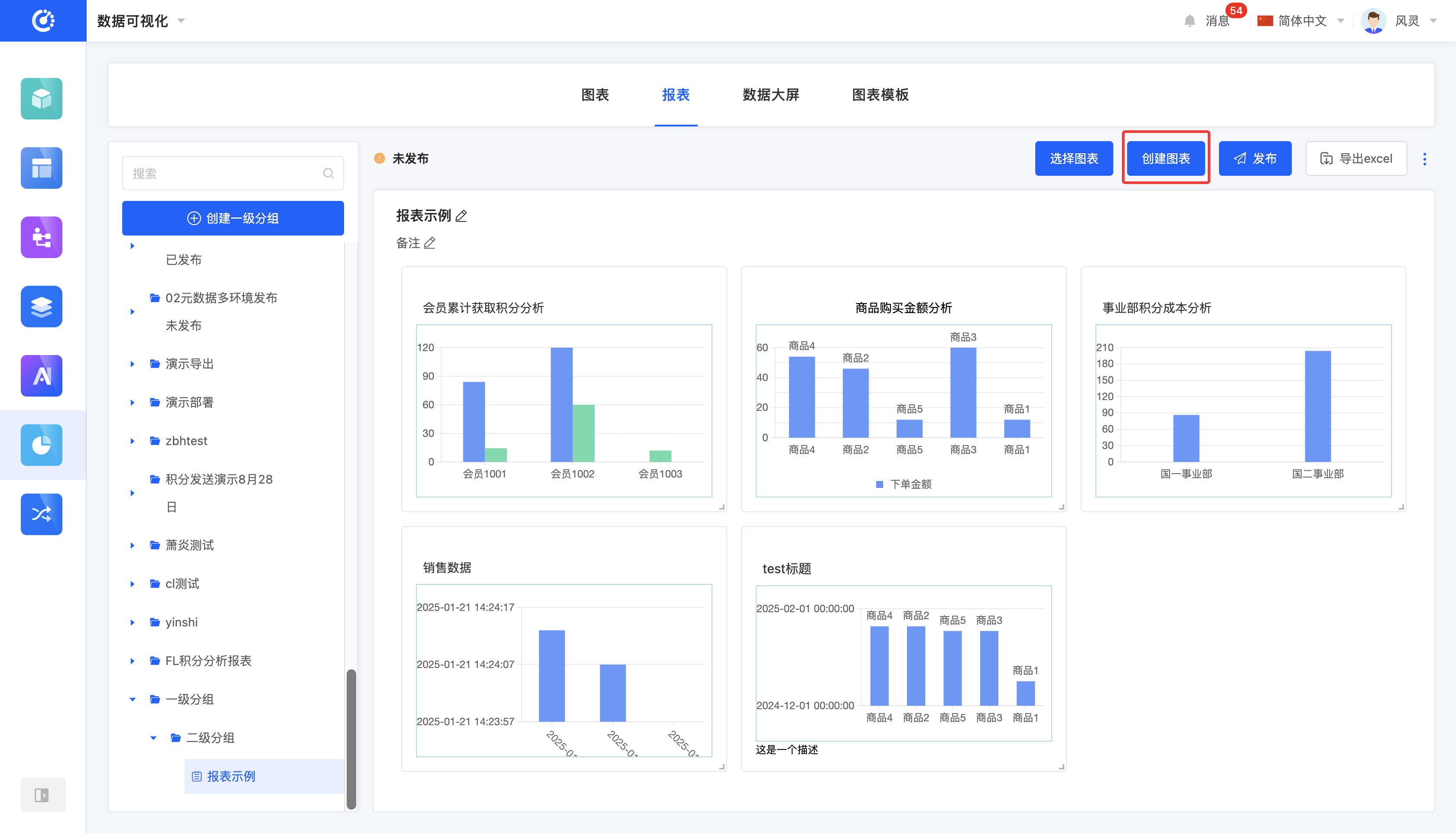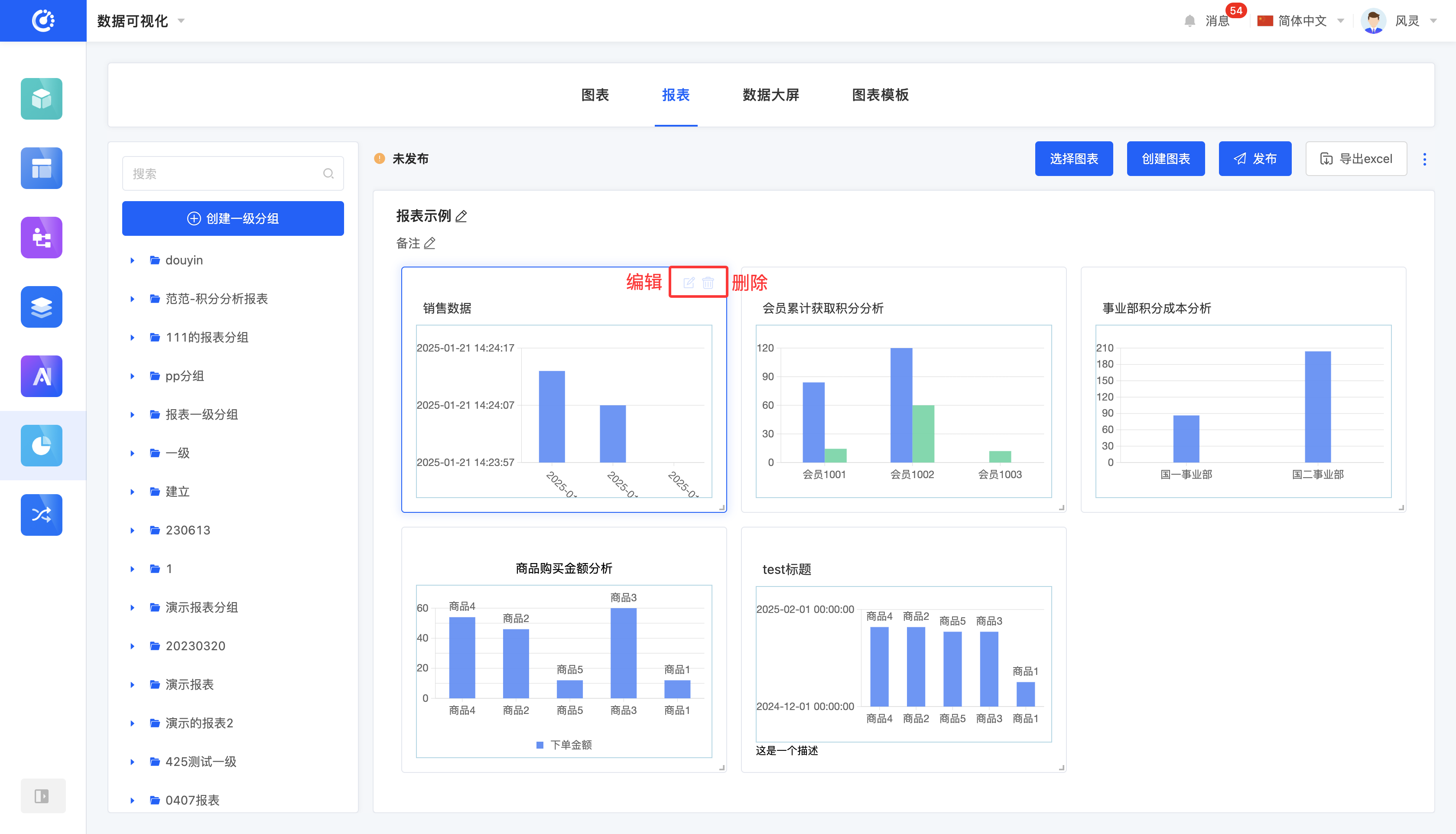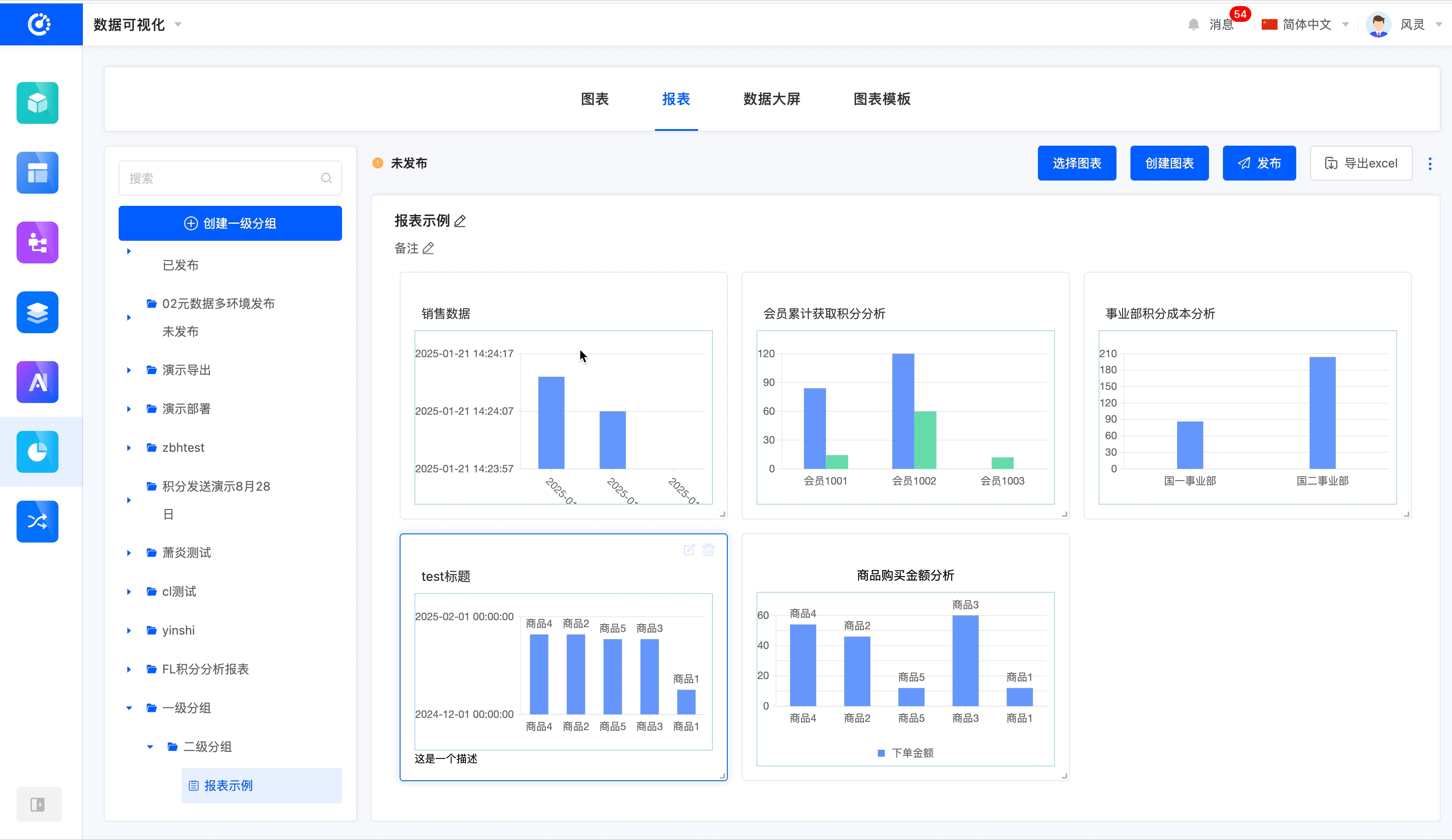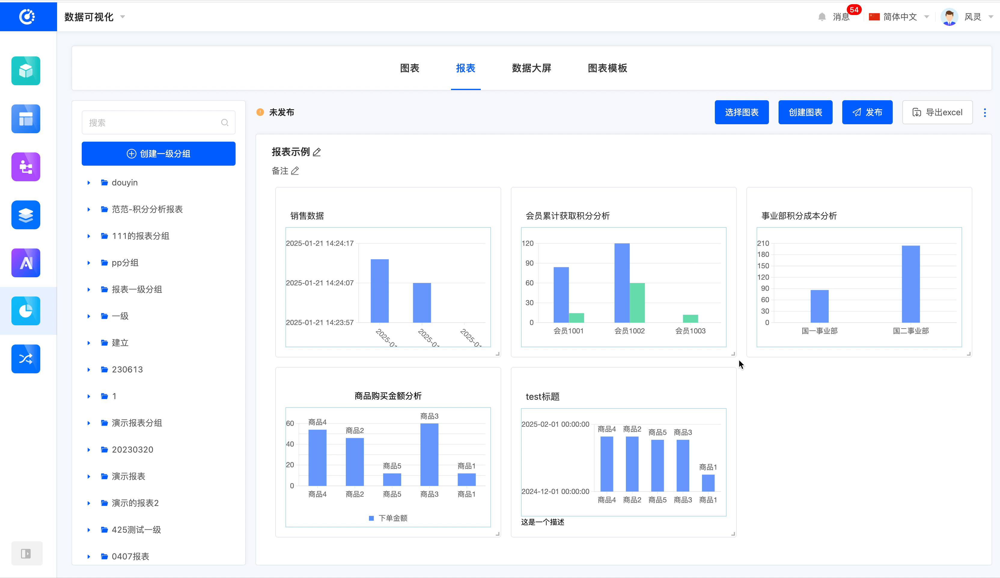 Reports can aggregate various types of charts into a single entity, providing a comprehensive and intuitive platform for data presentation and analysis. Through reports, chart data from different types and sources, including bar charts, line charts, pie charts, scatter plots, and other forms, can be integrated and presented in a unified interface.