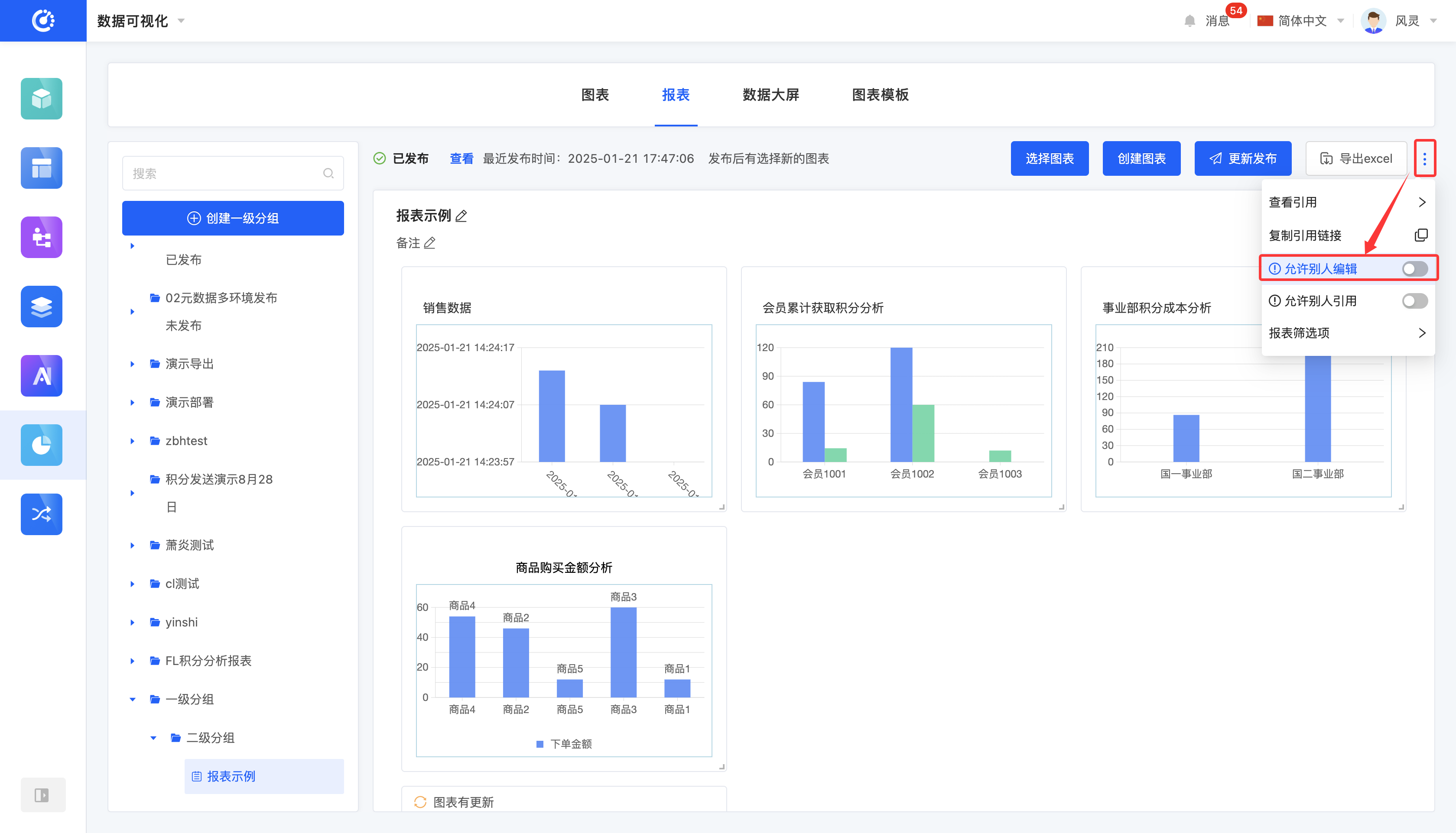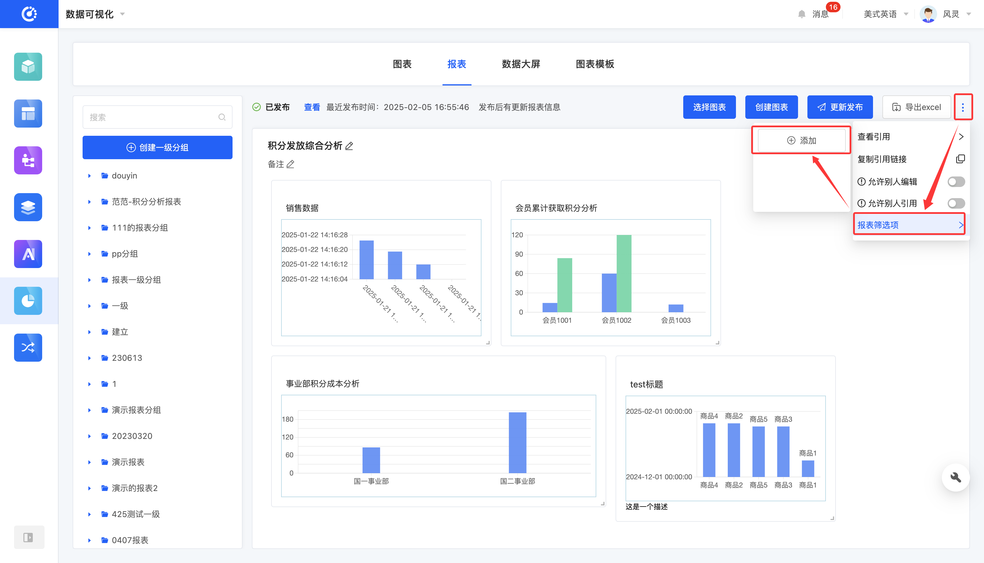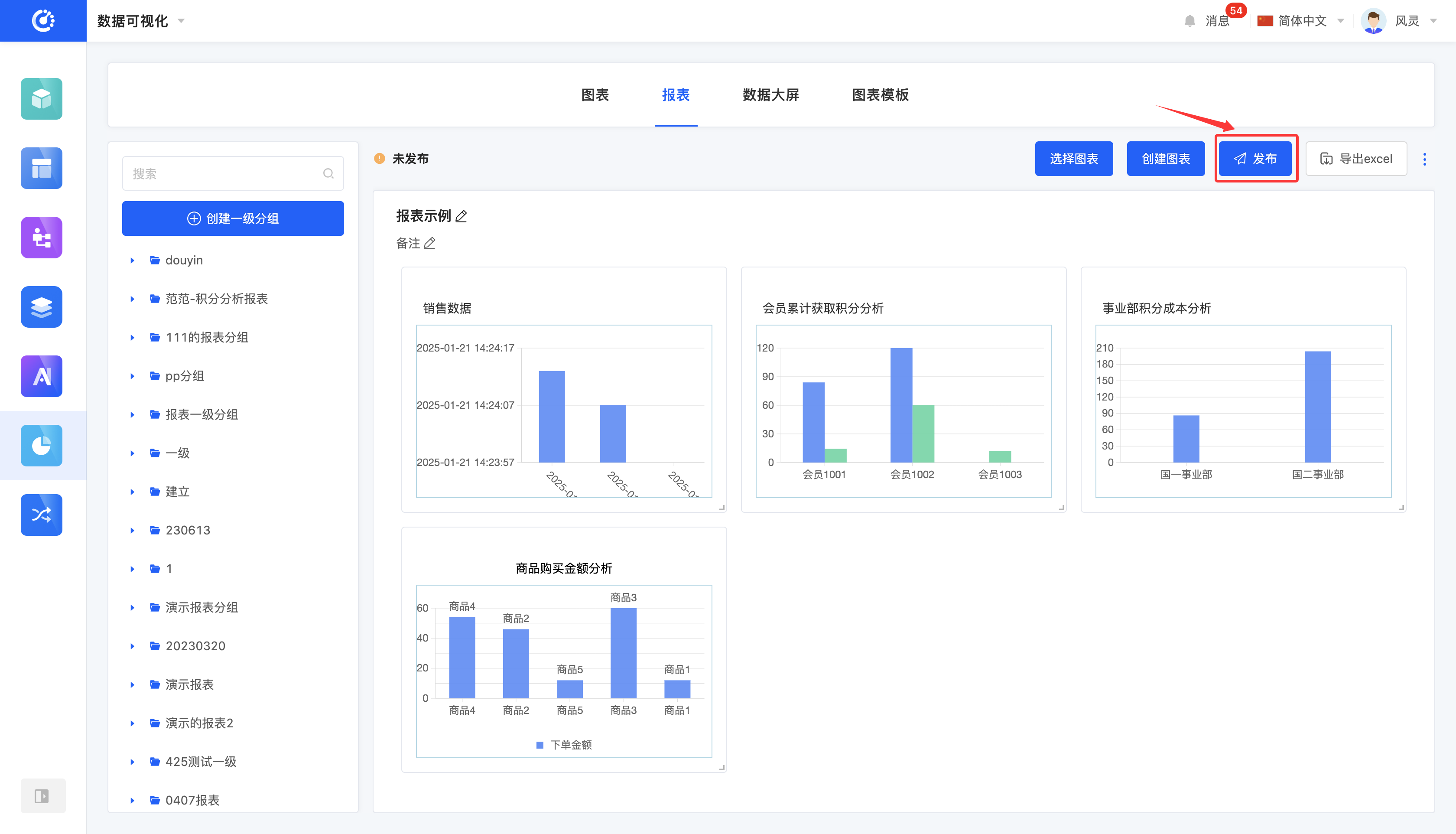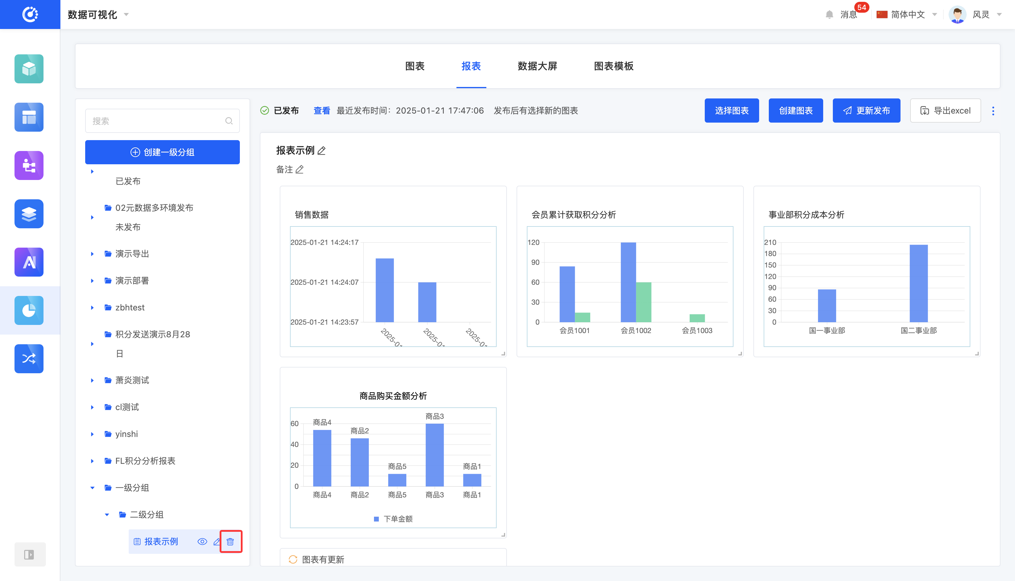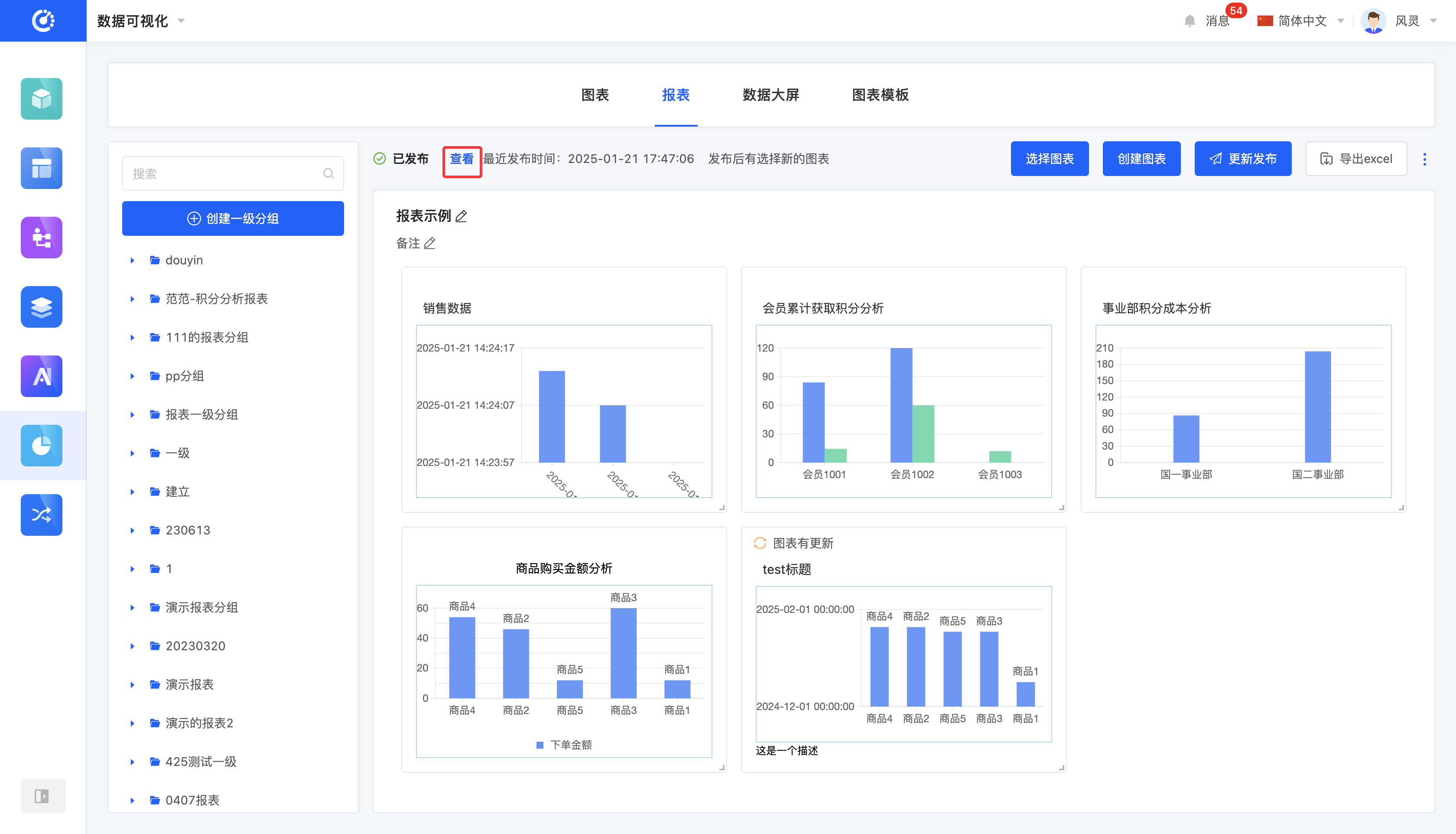 Reports can aggregate various types of charts into a single entity, providing a comprehensive and intuitive platform for data presentation and analysis. Through reports, chart data from different types and sources, including bar charts, line charts, pie charts, scatter plots, and other forms, can be integrated and presented in a unified interface.
