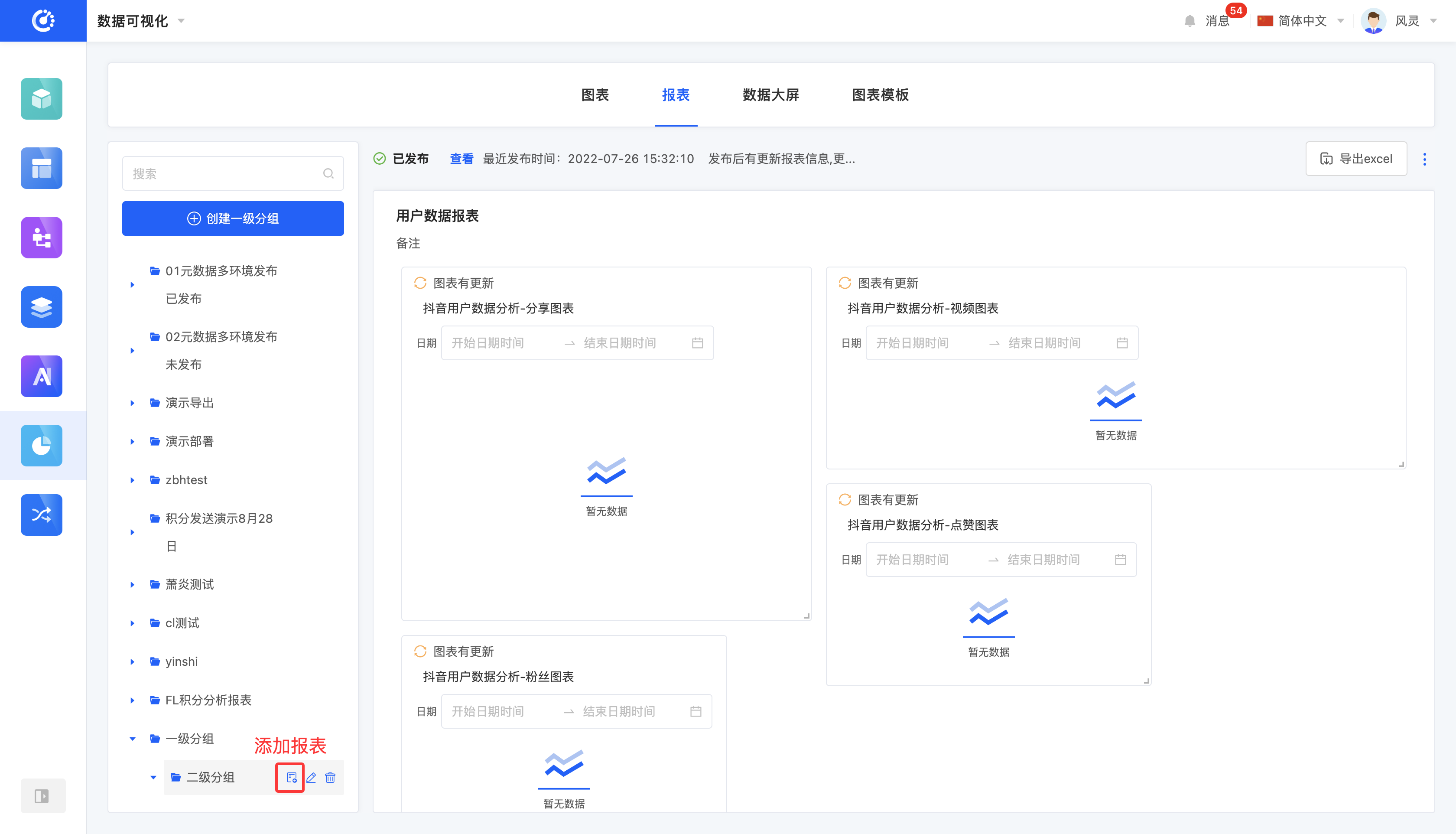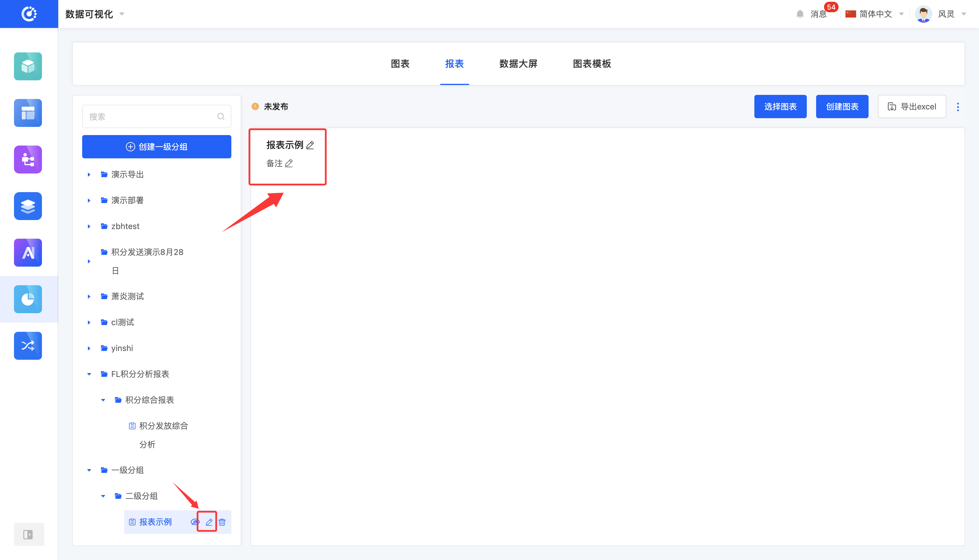 Click the "Add Report" icon under the second-level group in the list area, enter the title, and the report will be successfully created.