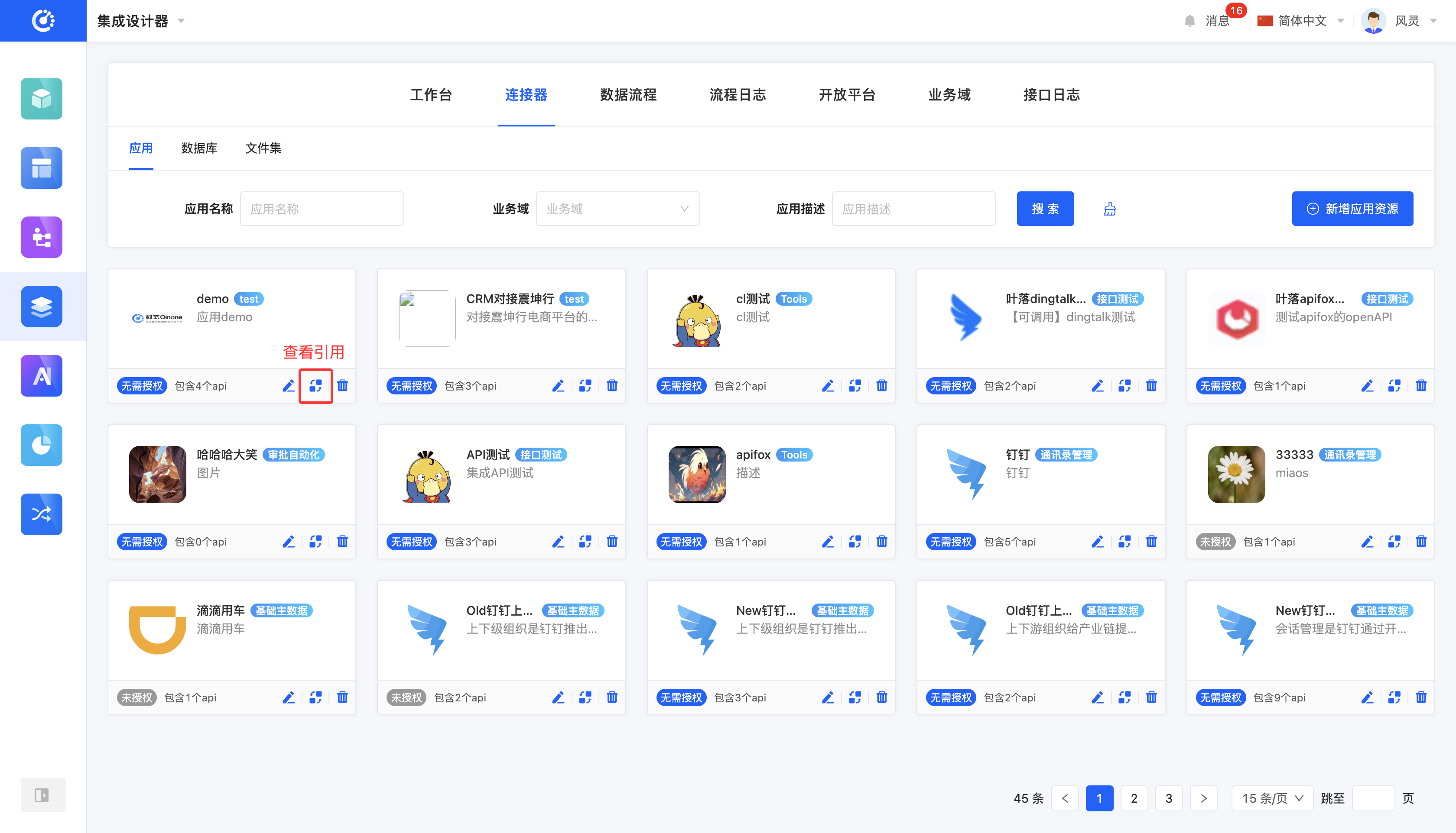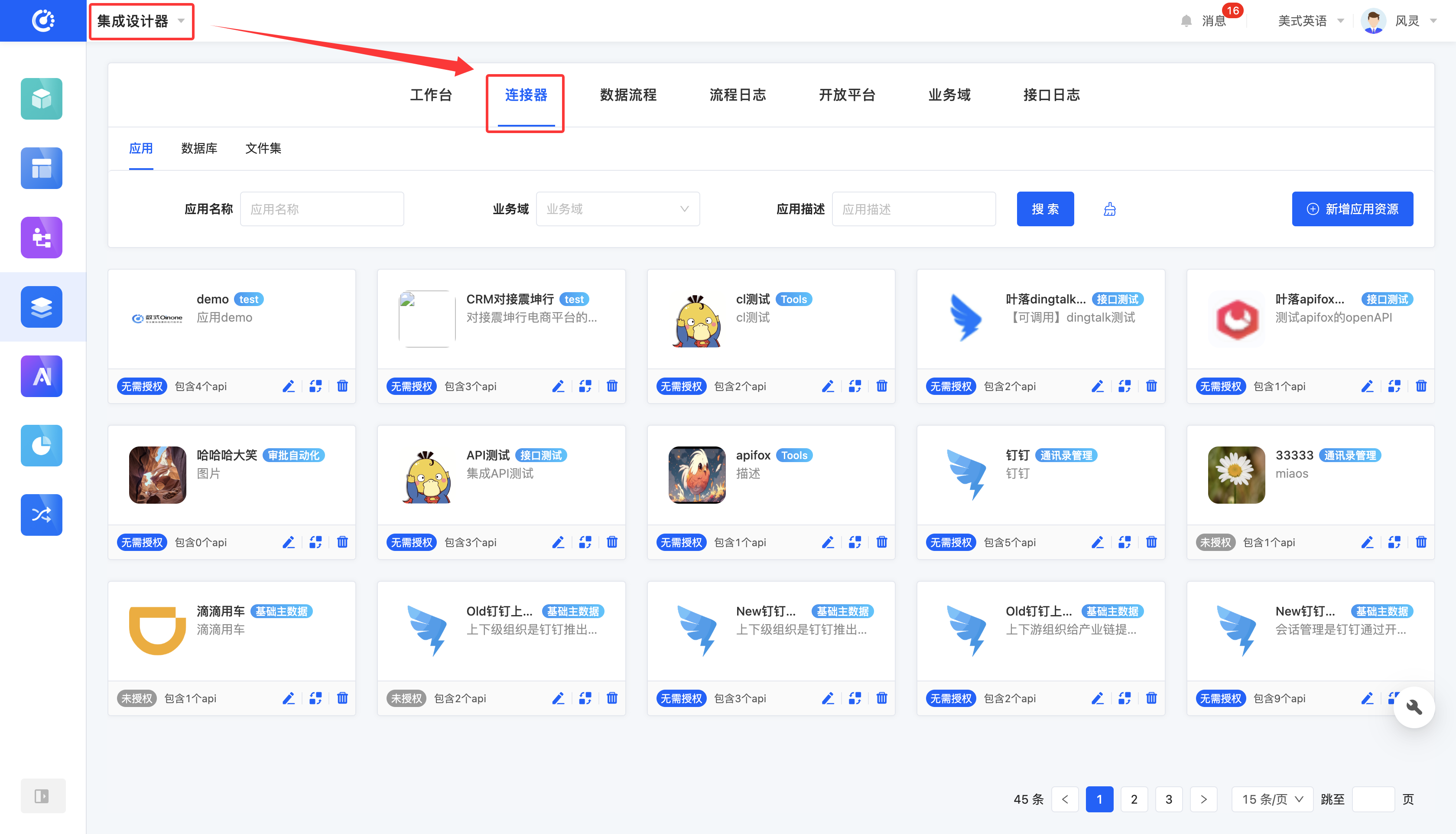 Integration refers to the connection between platform applications and external systems, while internal applications within the platform interact directly through internal service calls. As an important part of integration, connectors cover three types of resources: applications, databases, and file sets.