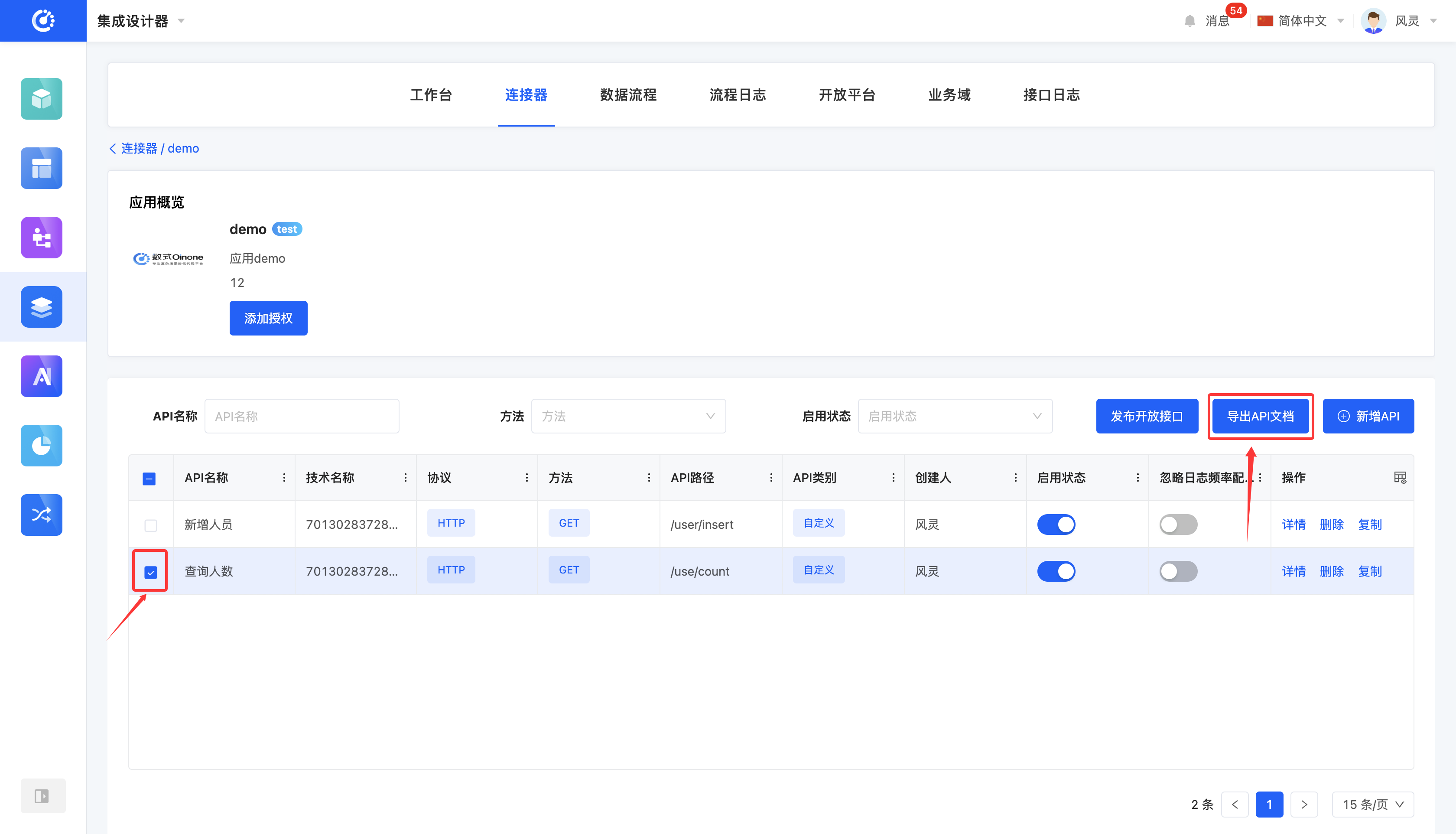 It supports the export of API information in applications and databases into document format. The document adopts a uniform structure, and different types display different information according to their own characteristics, which is used to describe the configured interface capabilities under an application, including interface purpose, call mode, parameter description and return data structure