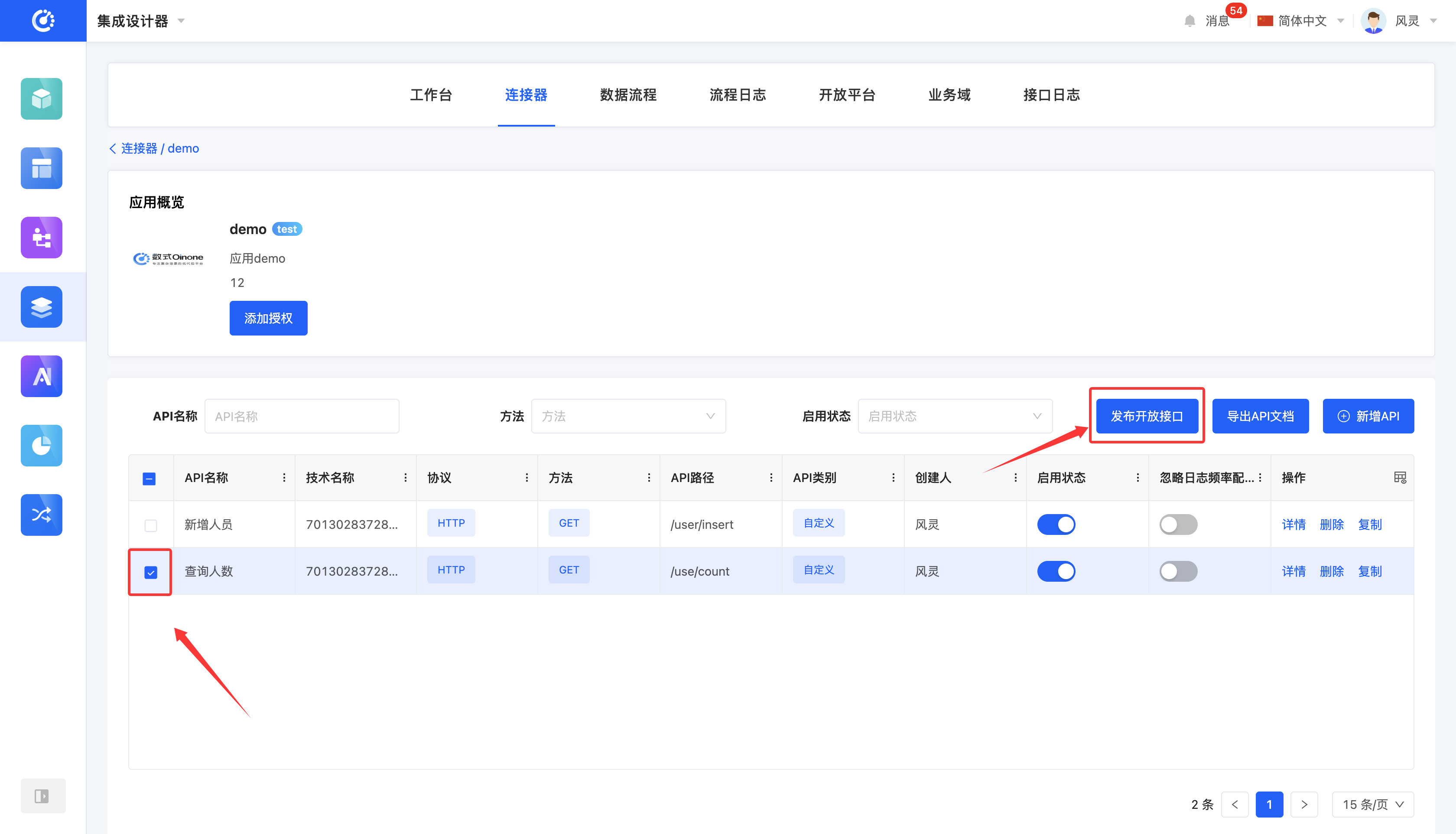 It supports publishing APIs in applications and databases as open APIs. After being set as open APIs, they can be used by external systems.