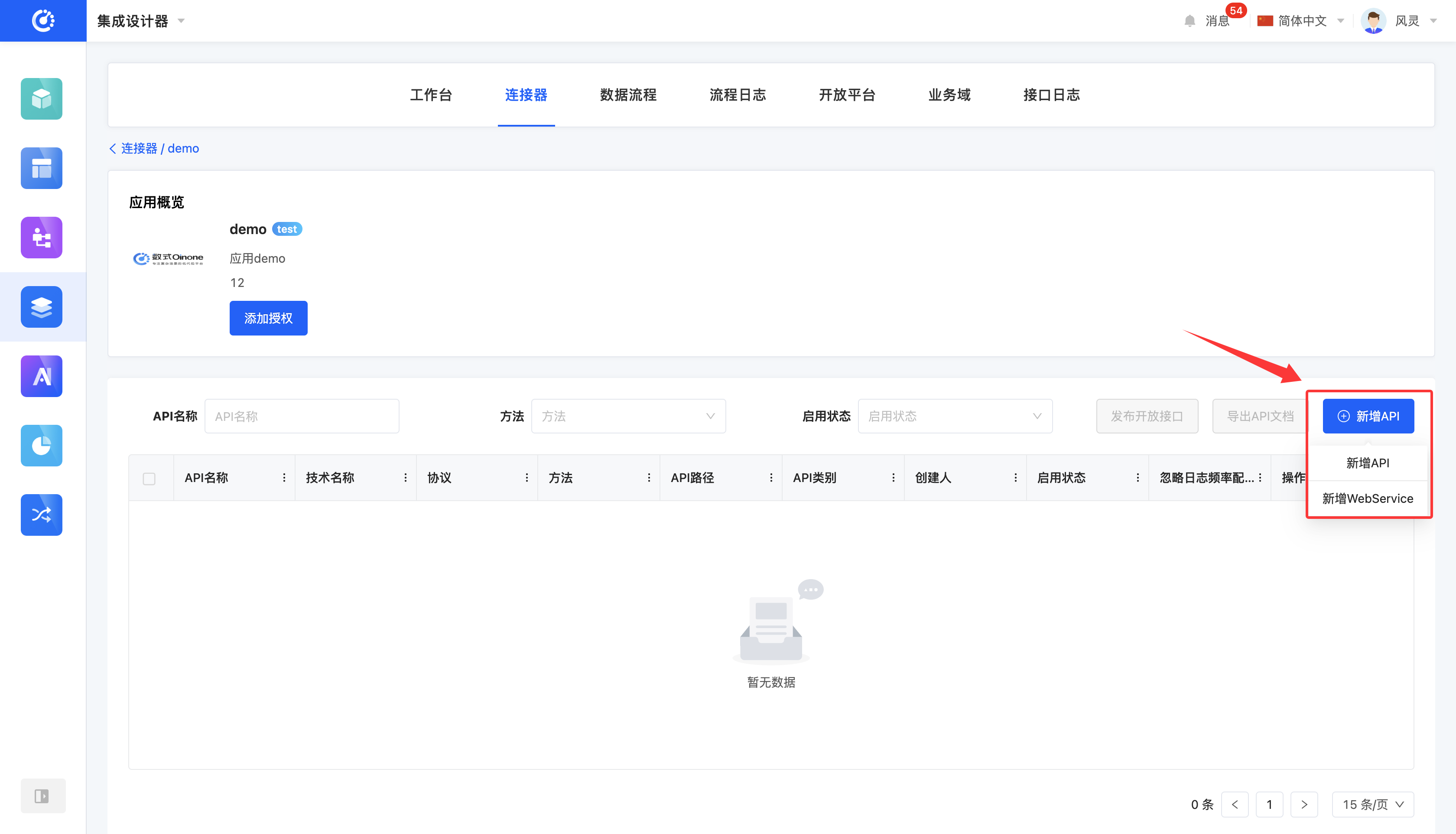 - For applications, click the "New API" button, select "New API" or "New WebService", fill in the information on the pop-up page, and then save to add it successfully.