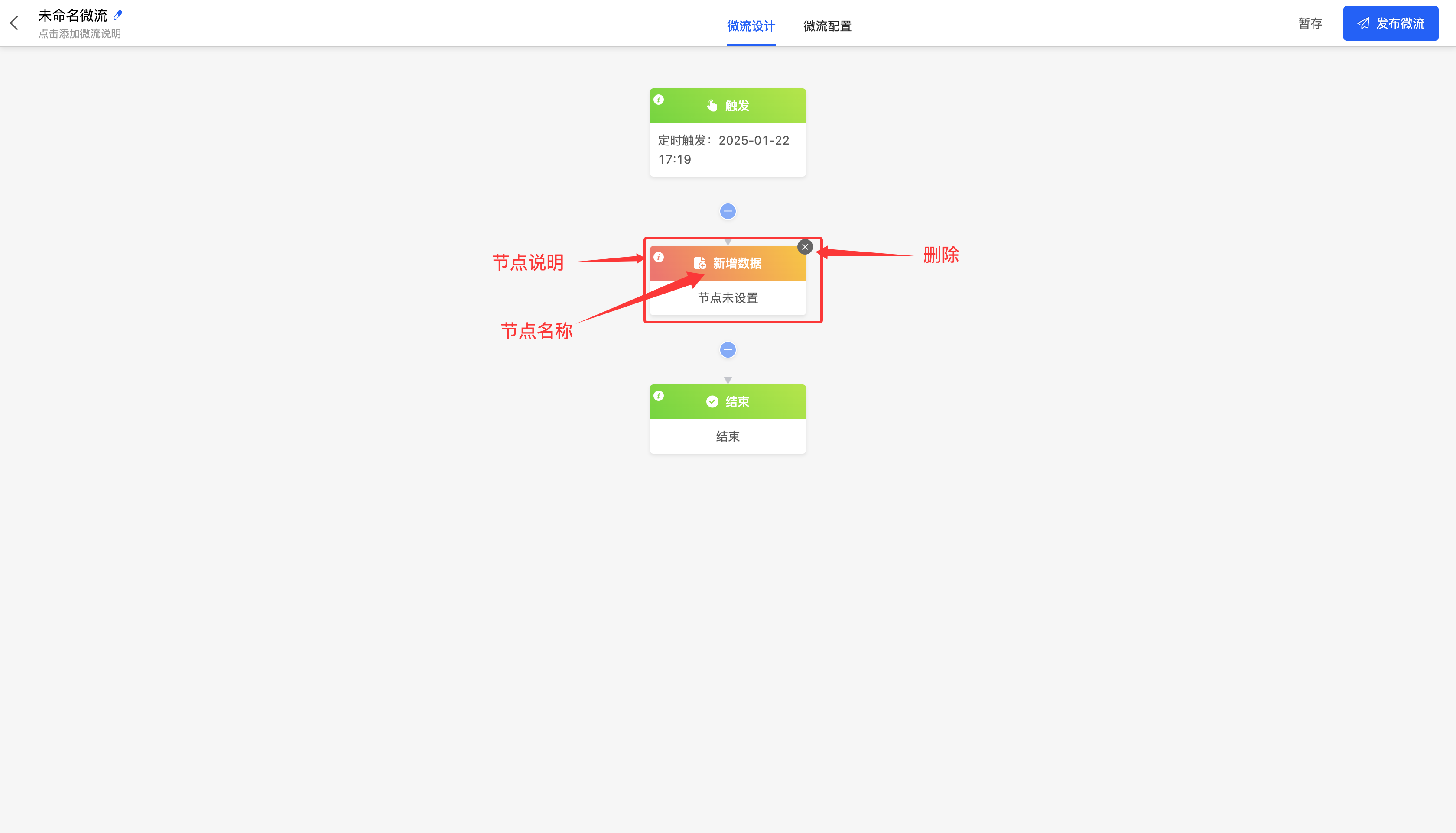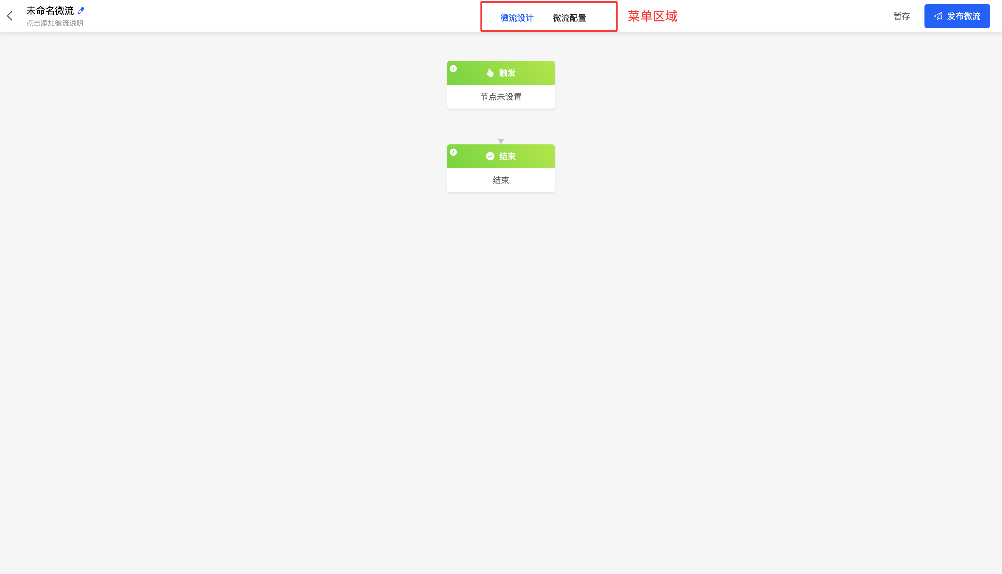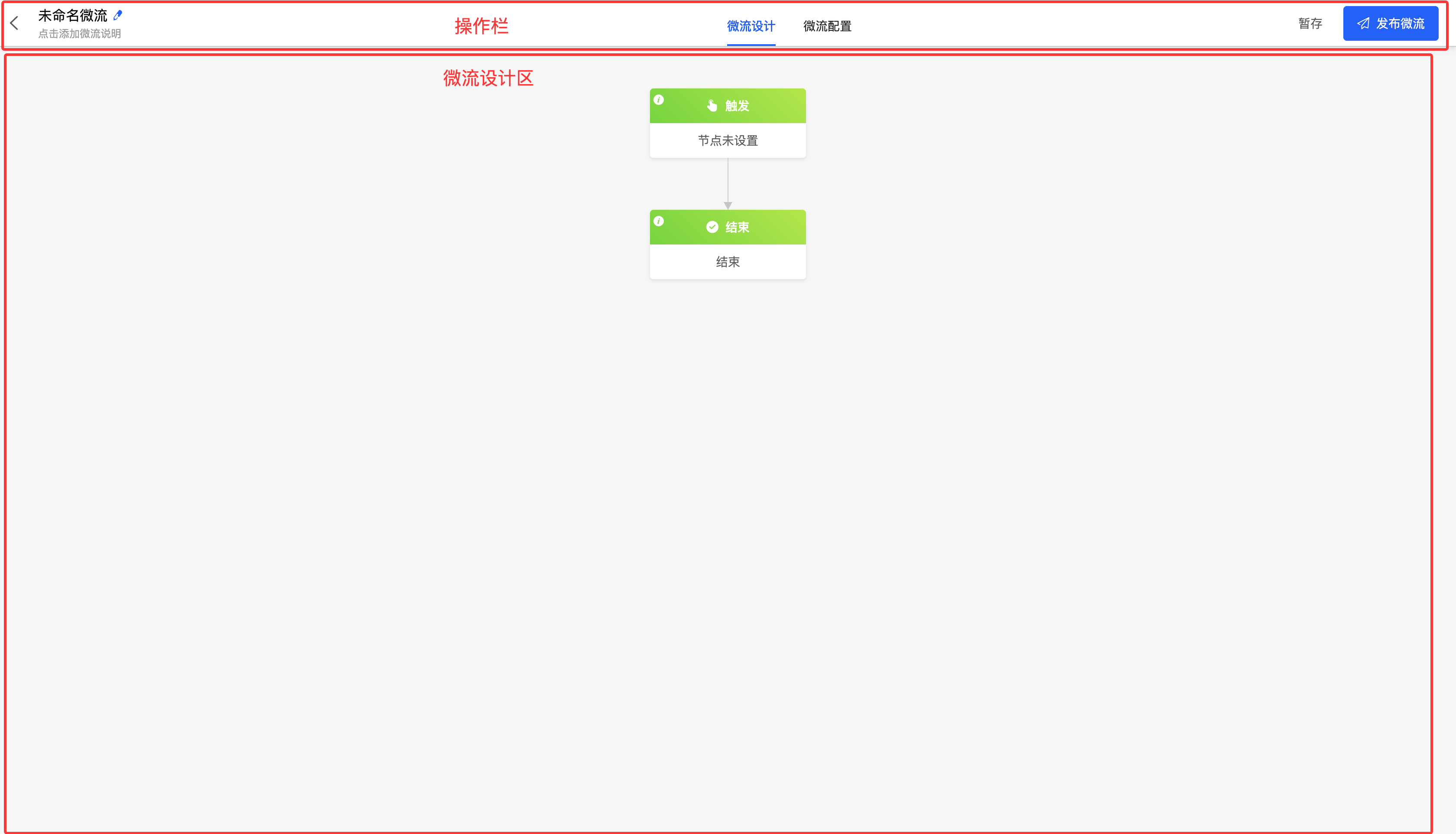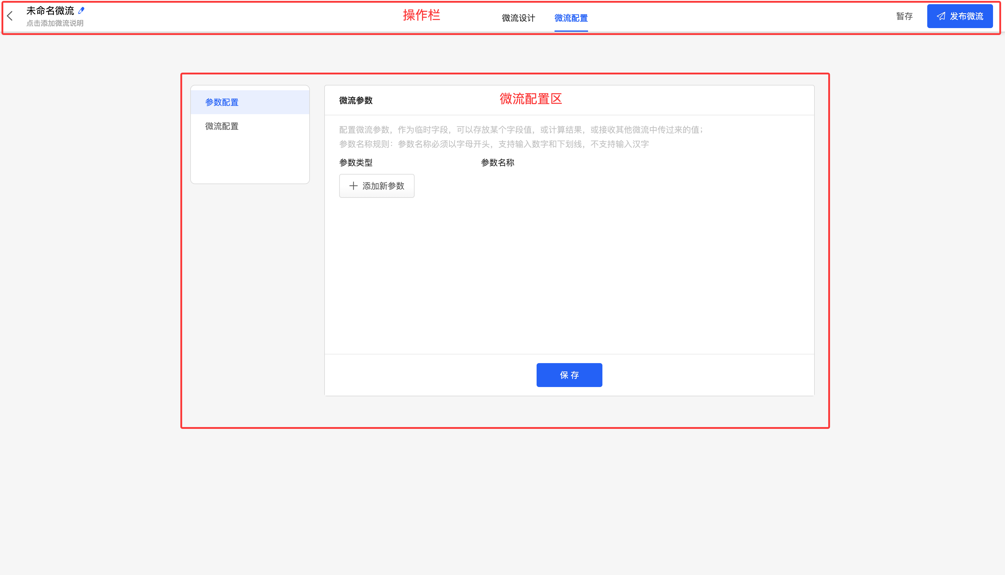 Microflow configuration is mainly divided into two functional areas, the operation bar and the microflow configuration area.