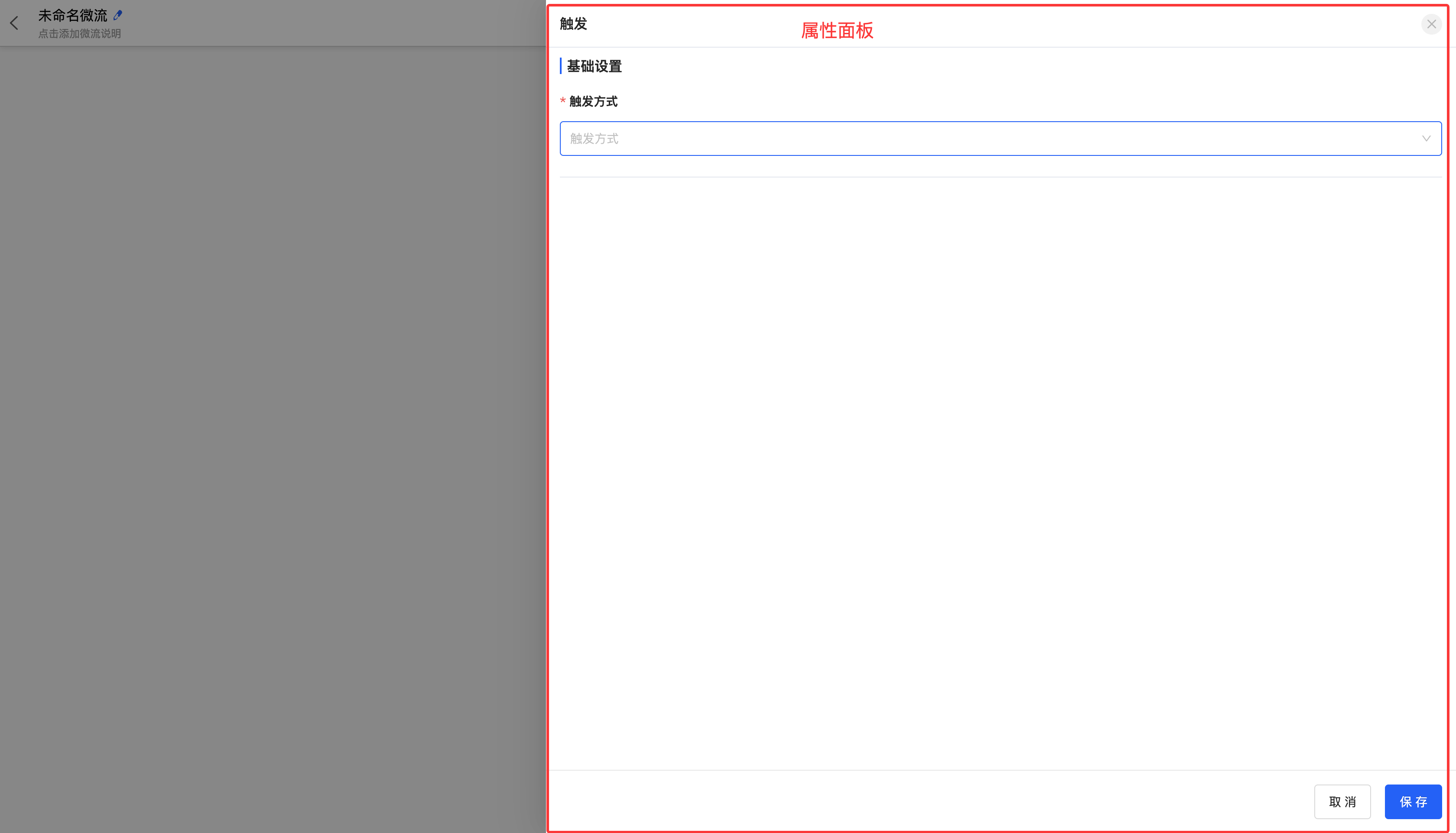 - Property panel: It is displayed when a node action is clicked. The relevant properties of the node can be adjusted on this panel.