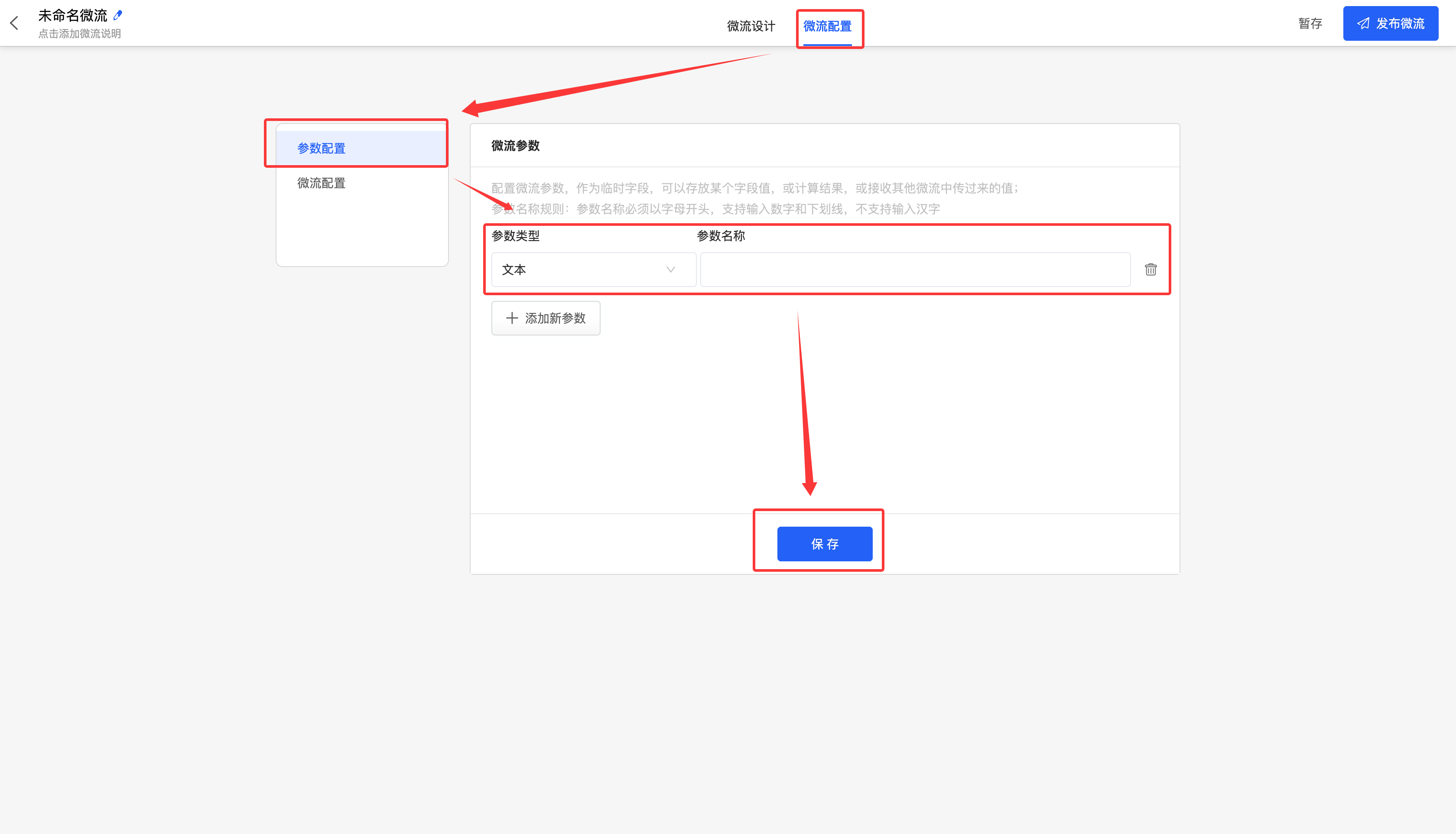 Under parameter configuration, click "Add New Parameter", select the parameter type, enter the parameter name, and then click "Save" to successfully add the parameter.