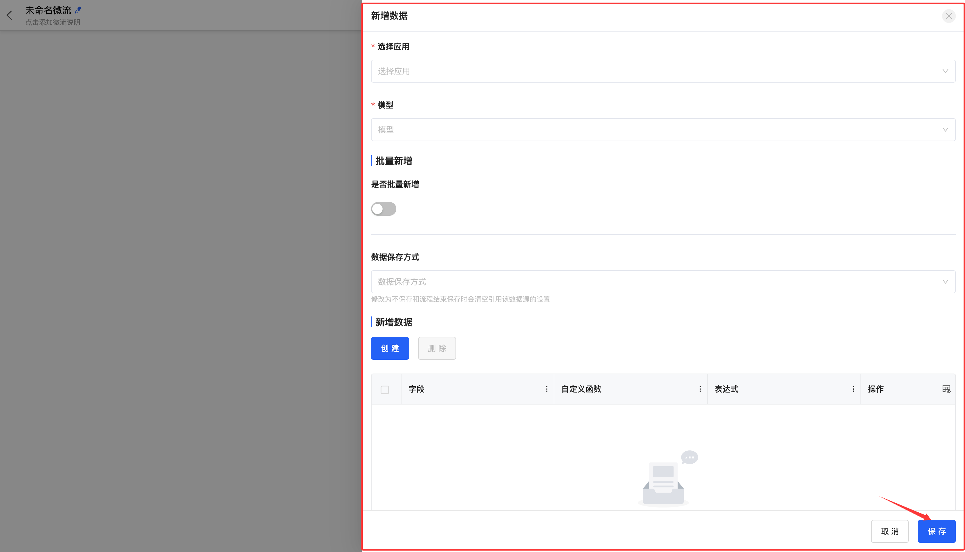 - Microflow configuration area: Microflow parameters can be configured here as temporary fields, or the application to which the microflow belongs can be changed.