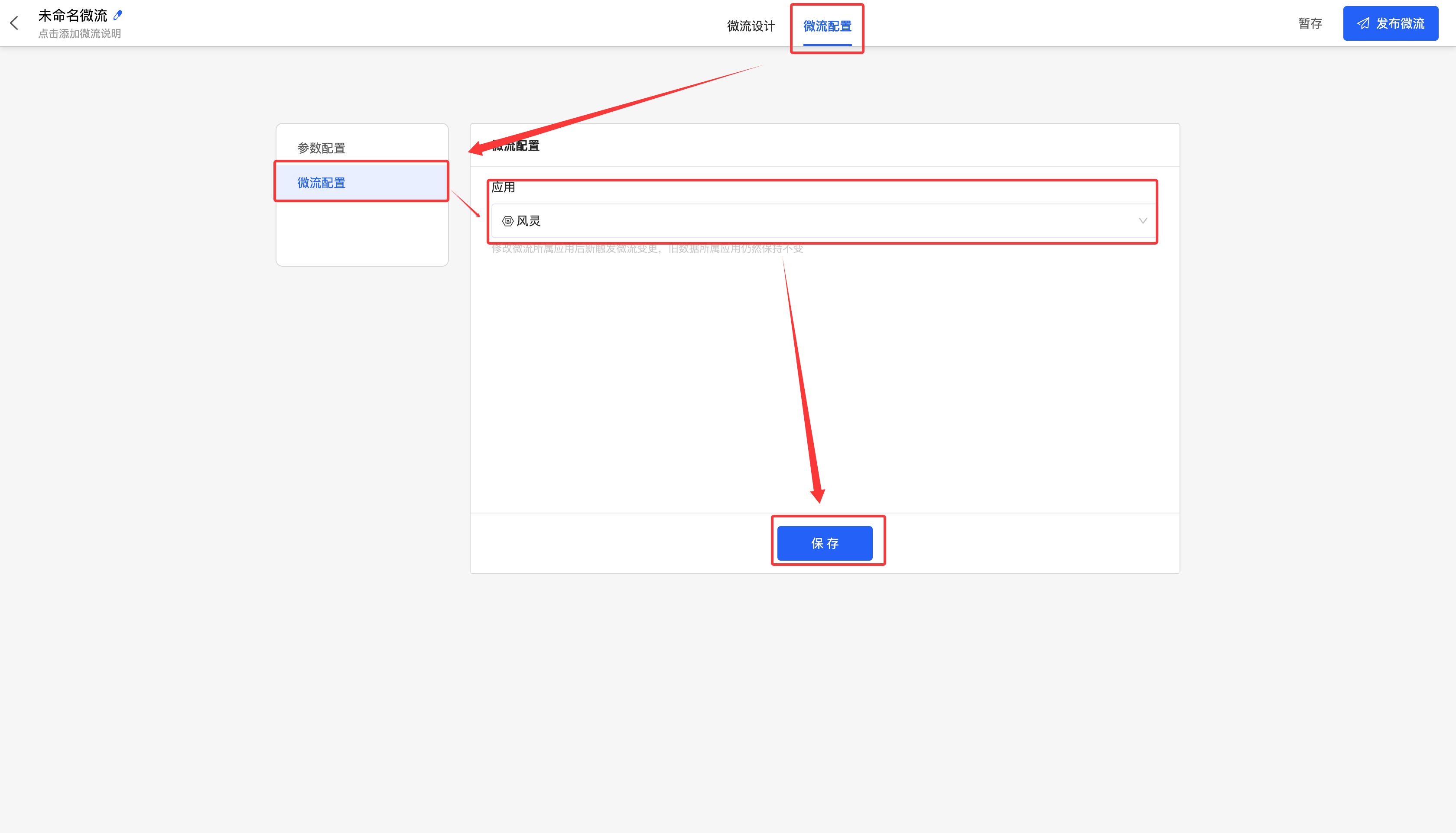 Under microflow configuration, select an application and click "Save" to successfully modify the application.