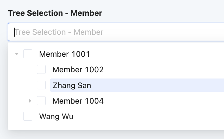 - Tree Selection: When selecting an option in the selection box, the component dynamically expands the sub-options of that option below it.