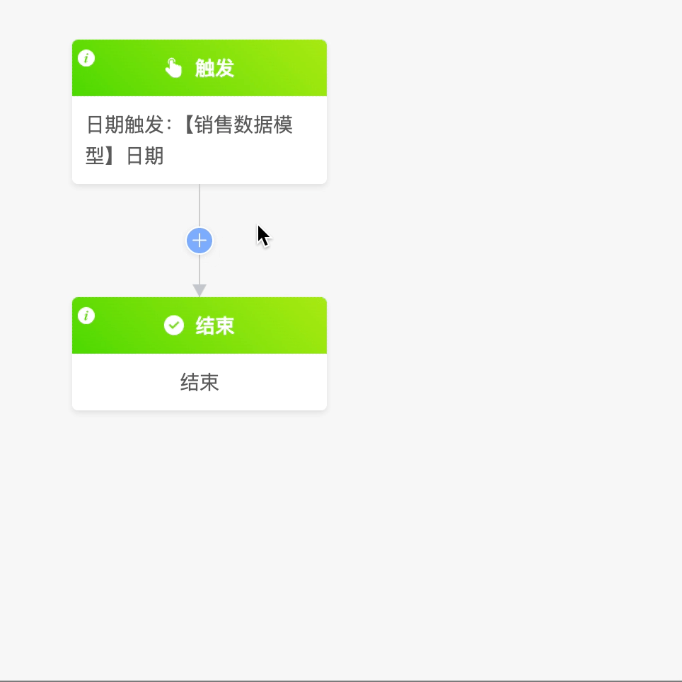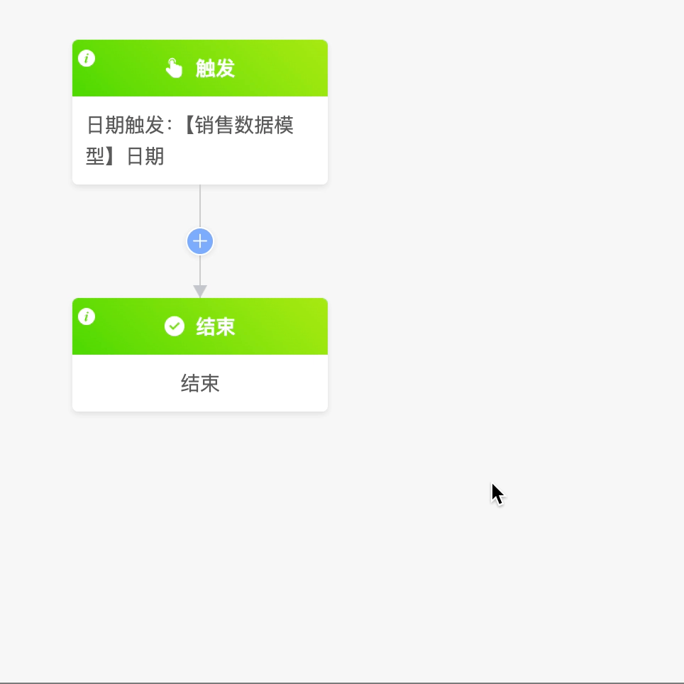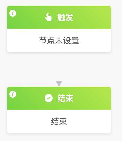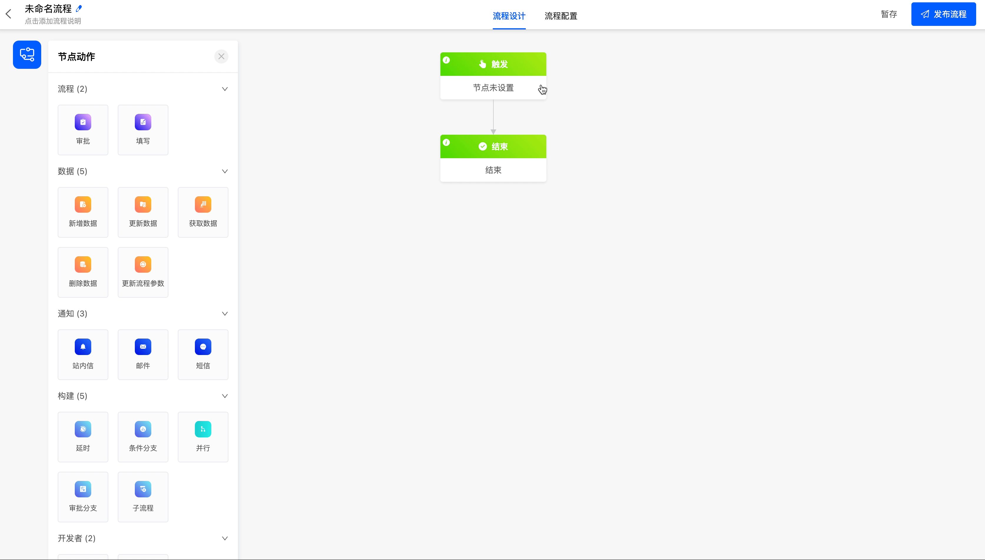 The newly added process design page by default includes two core nodes: one is the process trigger node, used to define the conditions for starting the process; the other is the process end node, used to mark the termination of the process.
