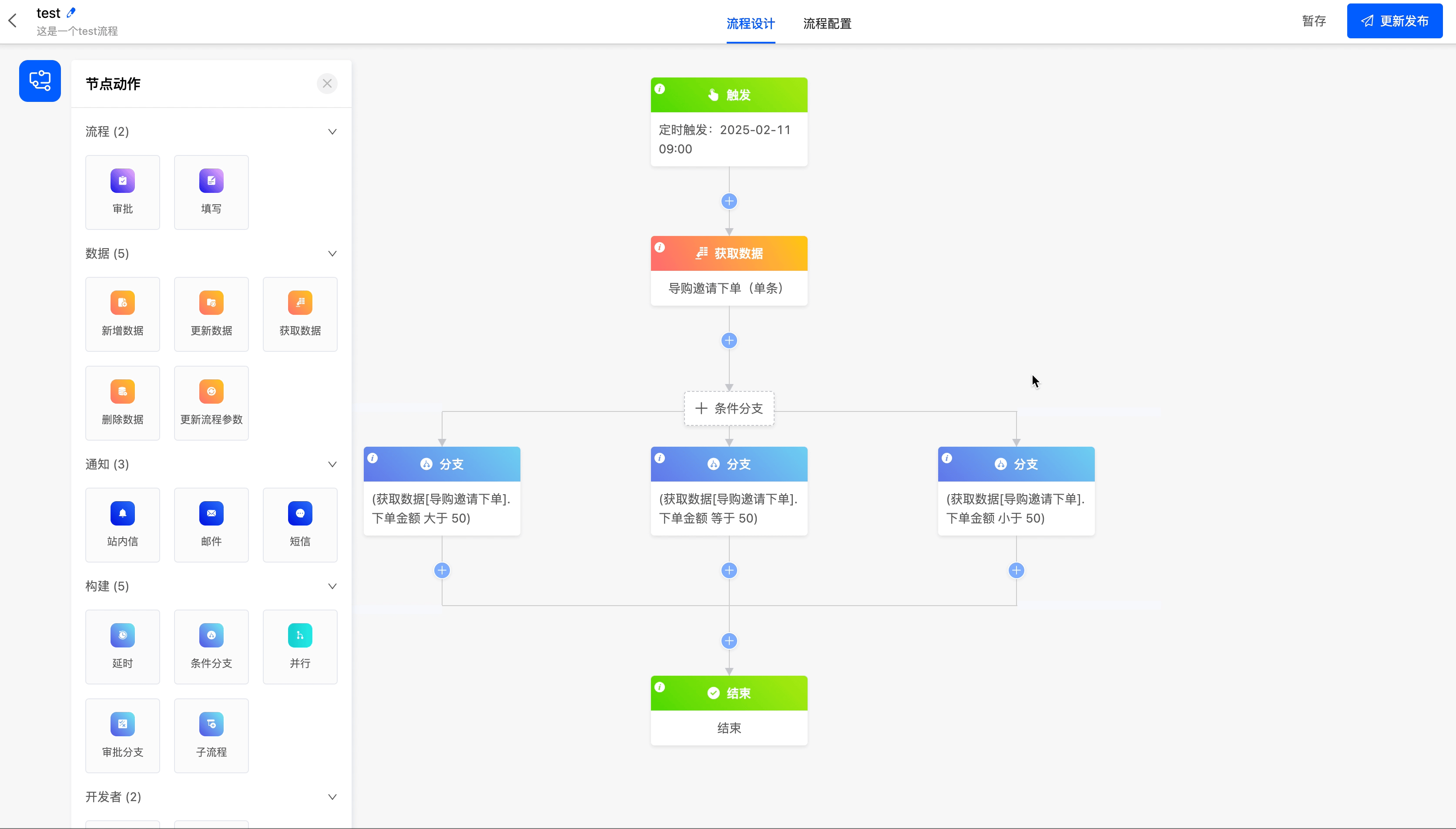 - Parallel Execution: All branches that meet the conditions are triggered simultaneously. After all branches are executed, the process continues to run downward.